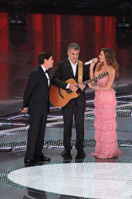 61mo FESTIVAL DELLA CANZONE ITALIANA DI SANREMO 19/02/2011 - QUINTA ED ULTIMA SERATA NELLA FOTO GIANNI MORANDI CON BELEN RODRIGUEZ CHE CANTA ACCOMPAGNATA DAL PADRE GUSTAVO ALLA CHITARRA ©GAZZANIGA/AGENZIA ALDO LIVERANI SAS
