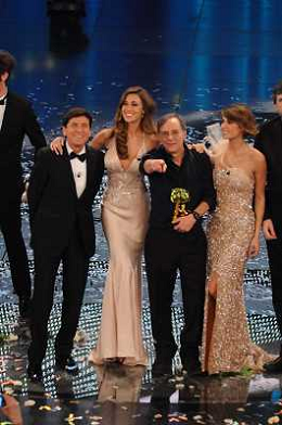 61mo FESTIVAL DELLA CANZONE ITALIANA DI SANREMO 19/02/2011 - QUINTA ED ULTIMA SERATA NELLA FOTO GIANNI MORANDI, BELEN RODRIGUEZ E ELISABETTA CANALIS CON ROBERTO VECCHIONI VINCITORE ©GAZZANIGA/AGENZIA ALDO LIVERANI SAS