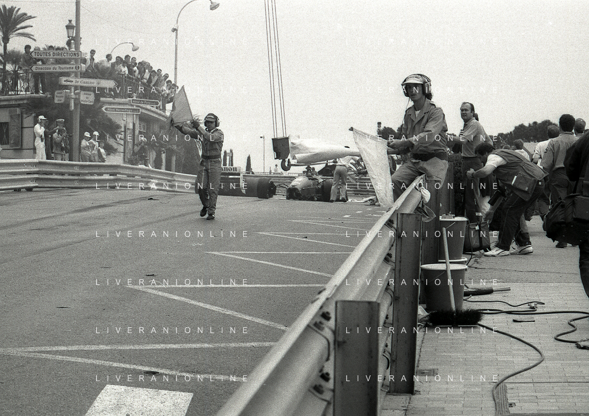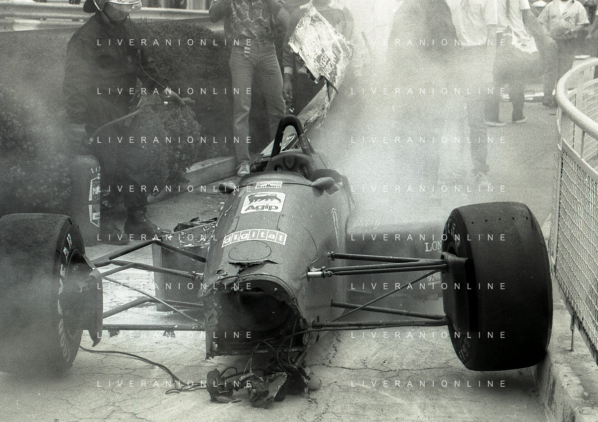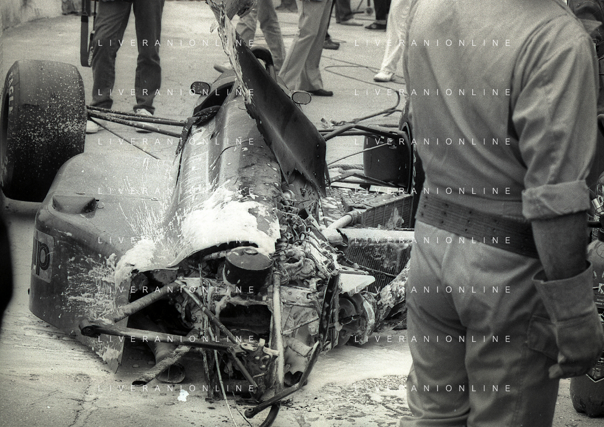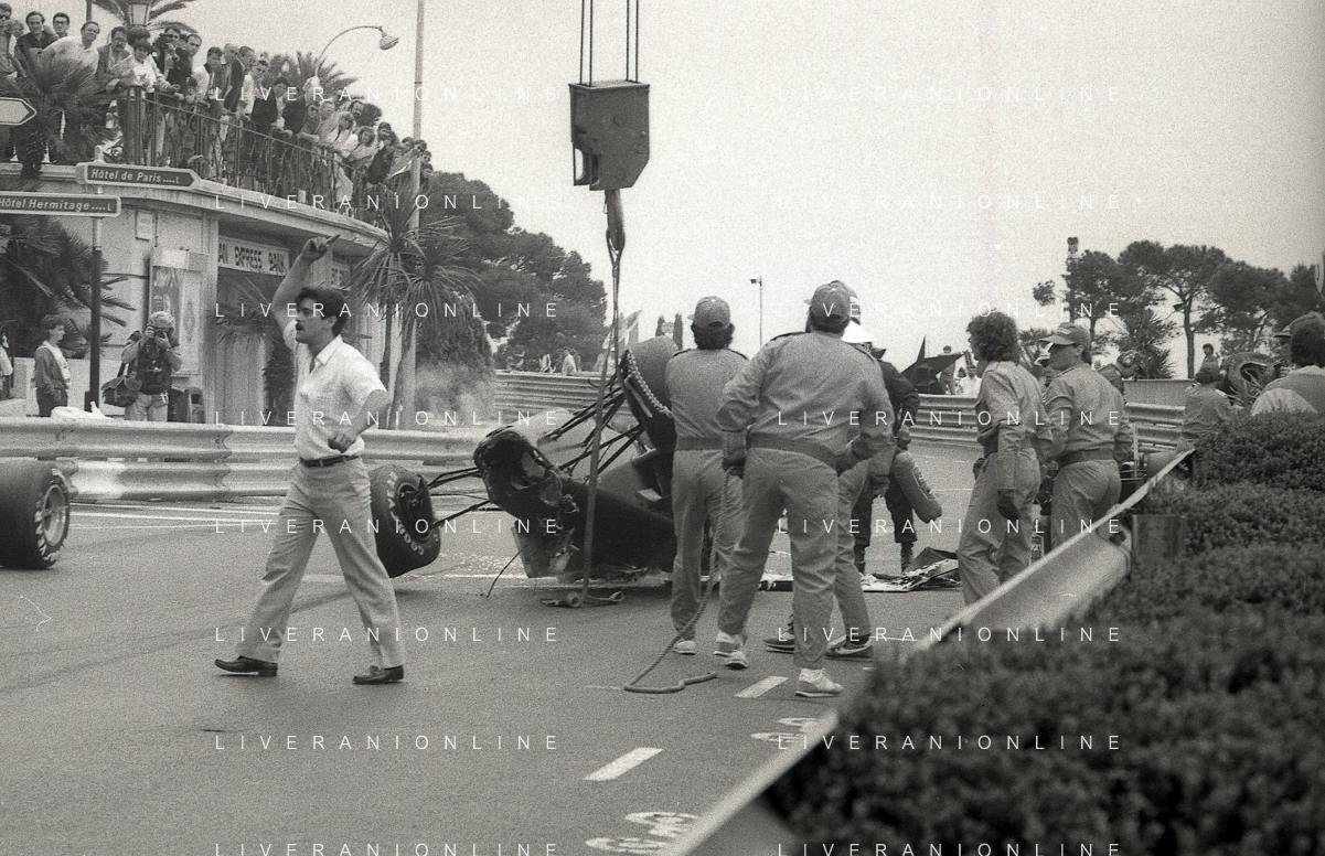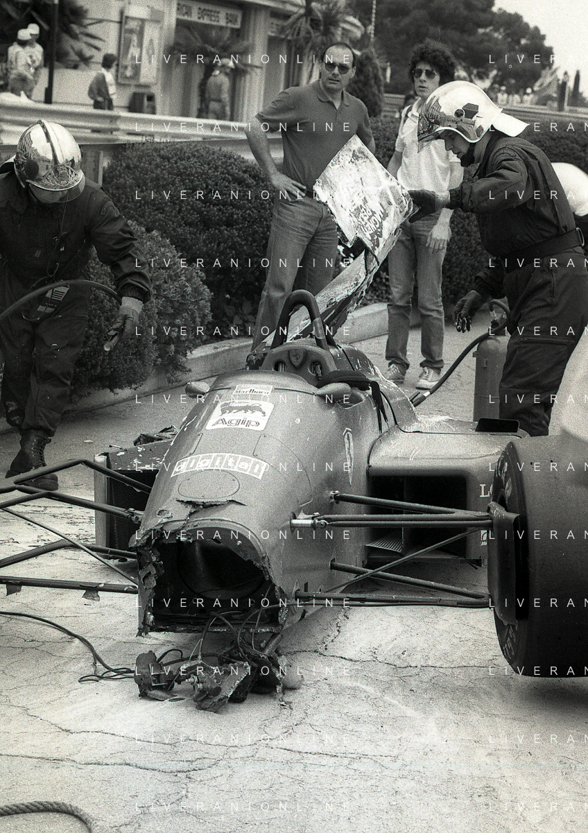 NEG-RETROSPETTIVA MICHELE ALBORETO PILOTA NELLA FOTO MICHELE ALBORETO CON CHRIISTIAN DANNER INCIDENTE ALLE PROVE DEL GP MONTECARLO ANNO 1987 AG ALDO LIVERANI SAS