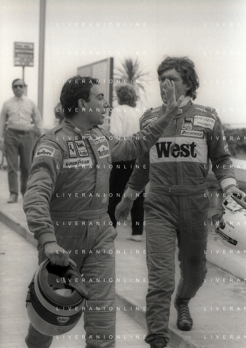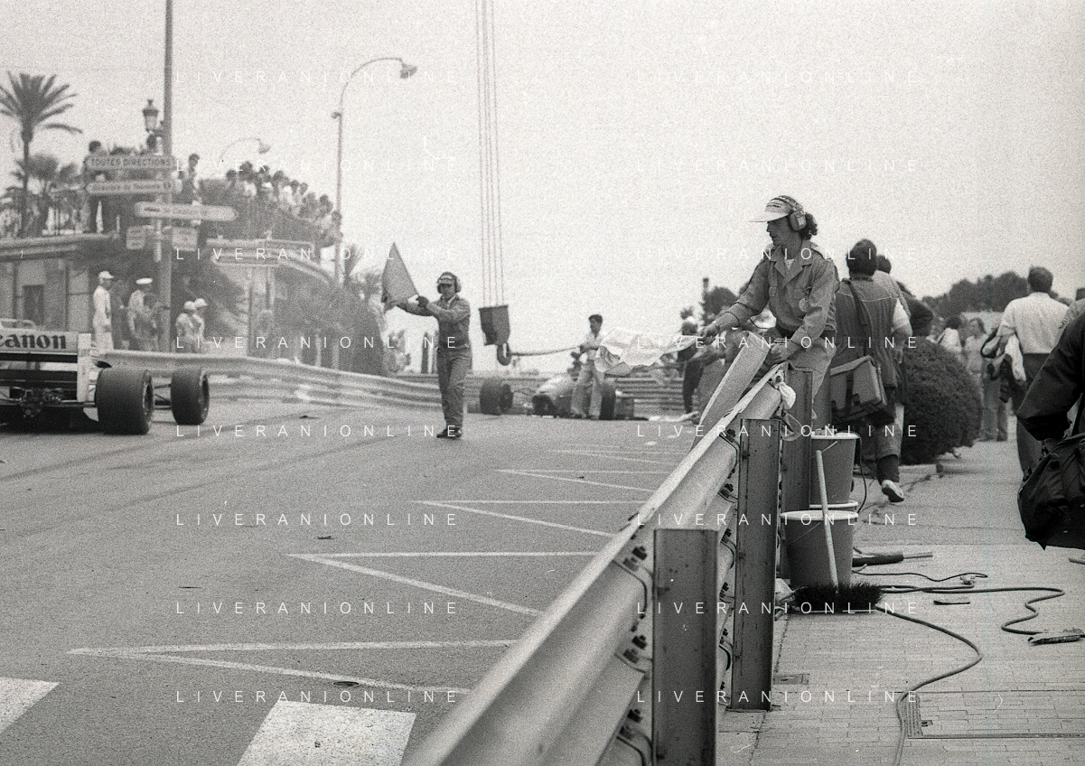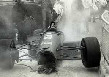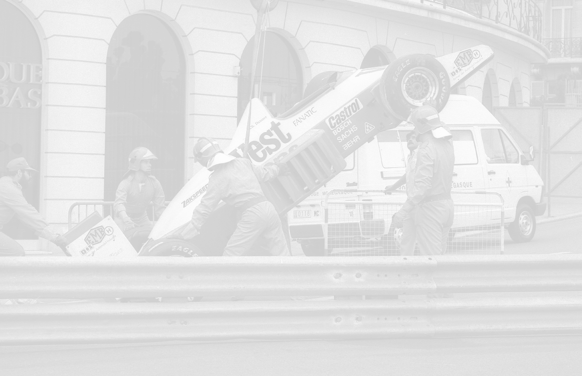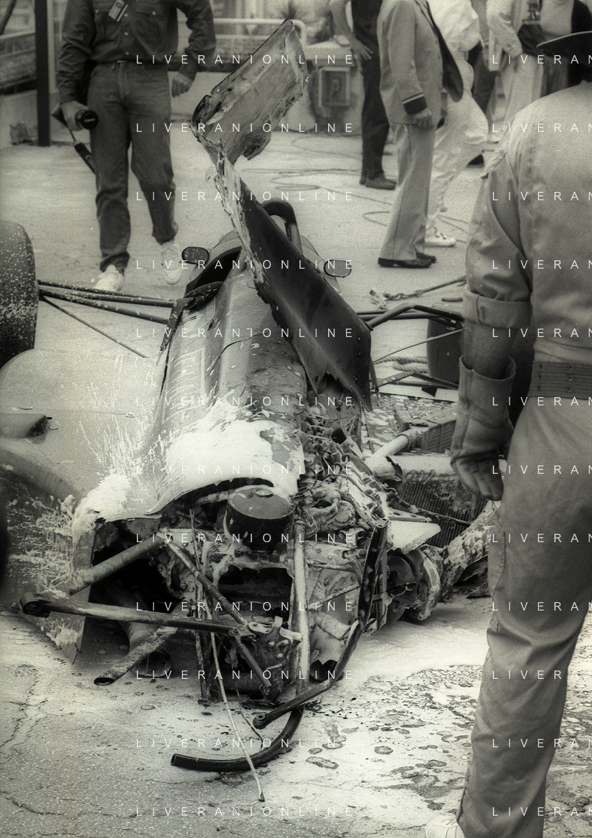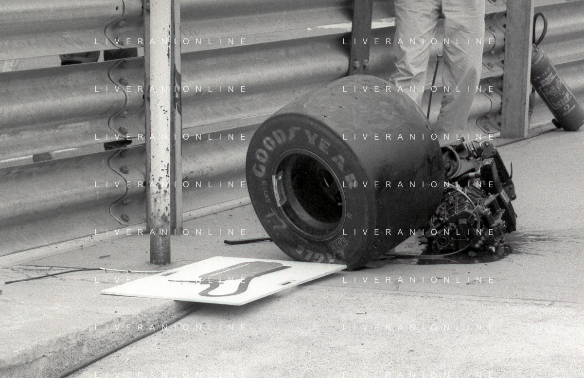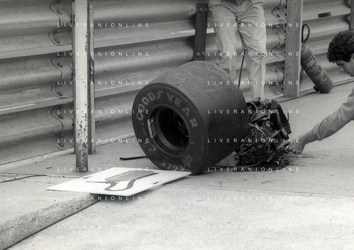 NEG-RETROSPETTIVA MICHELE ALBORETO PILOTA NELLA FOTO MICHELE ALBORETO CON CHRIISTIAN DANNER INCIDENTE ALLE PROVE DEL GP MONTECARLO ANNO 1987 AG ALDO LIVERANI SAS