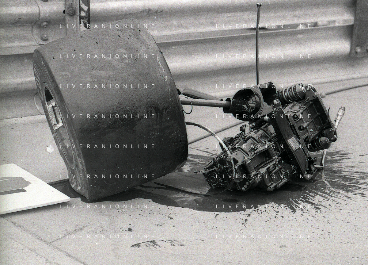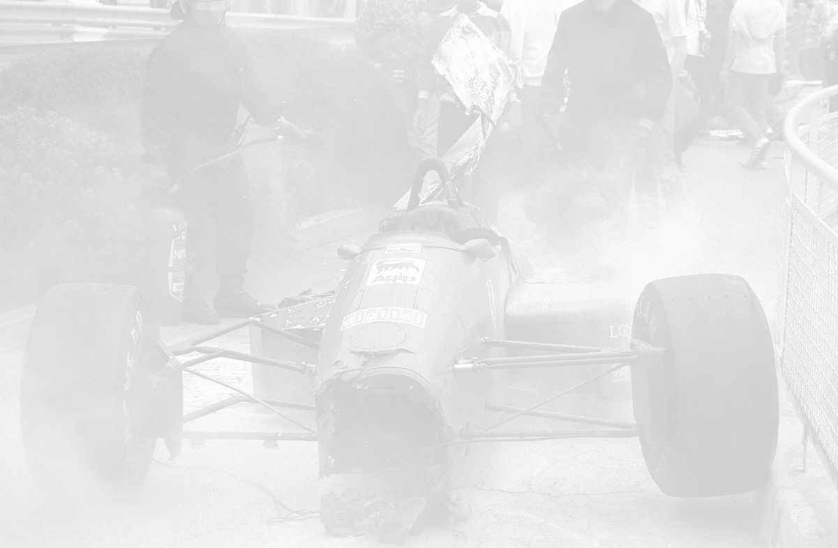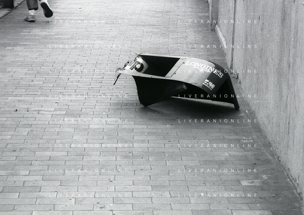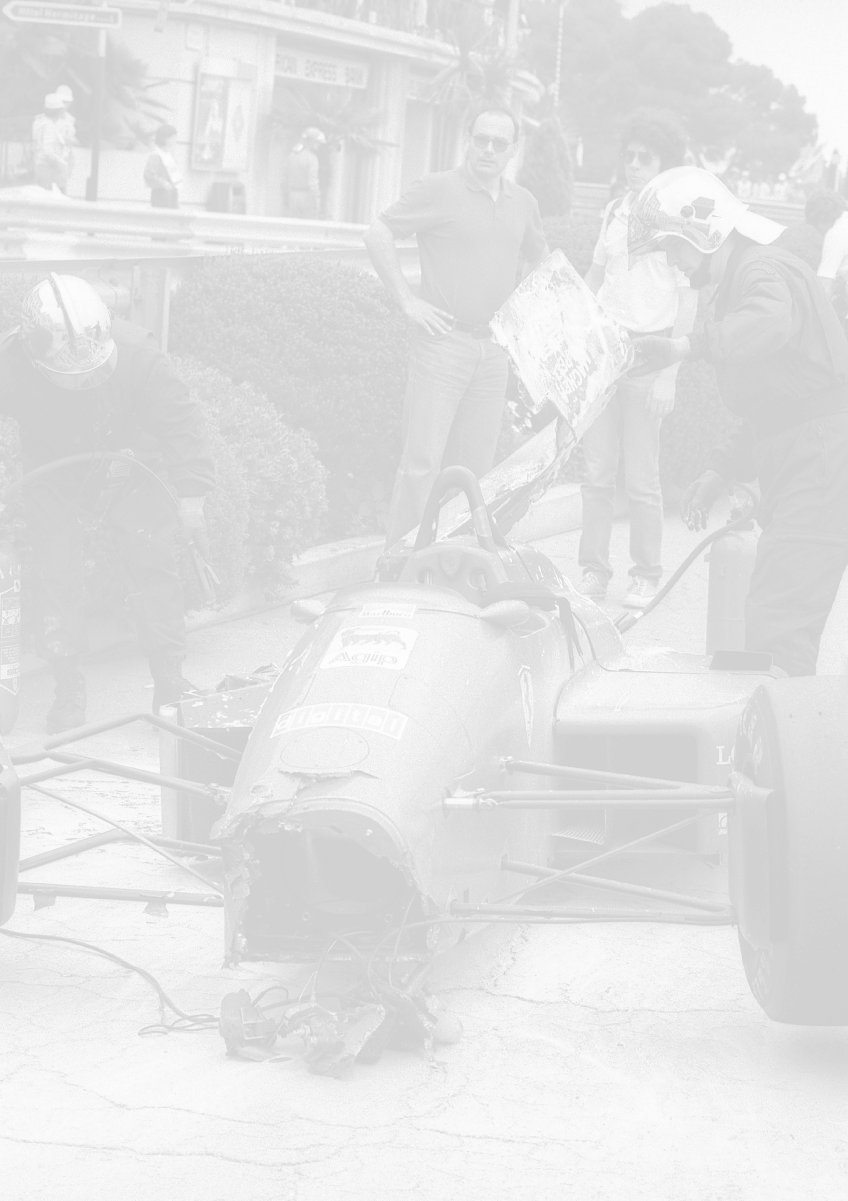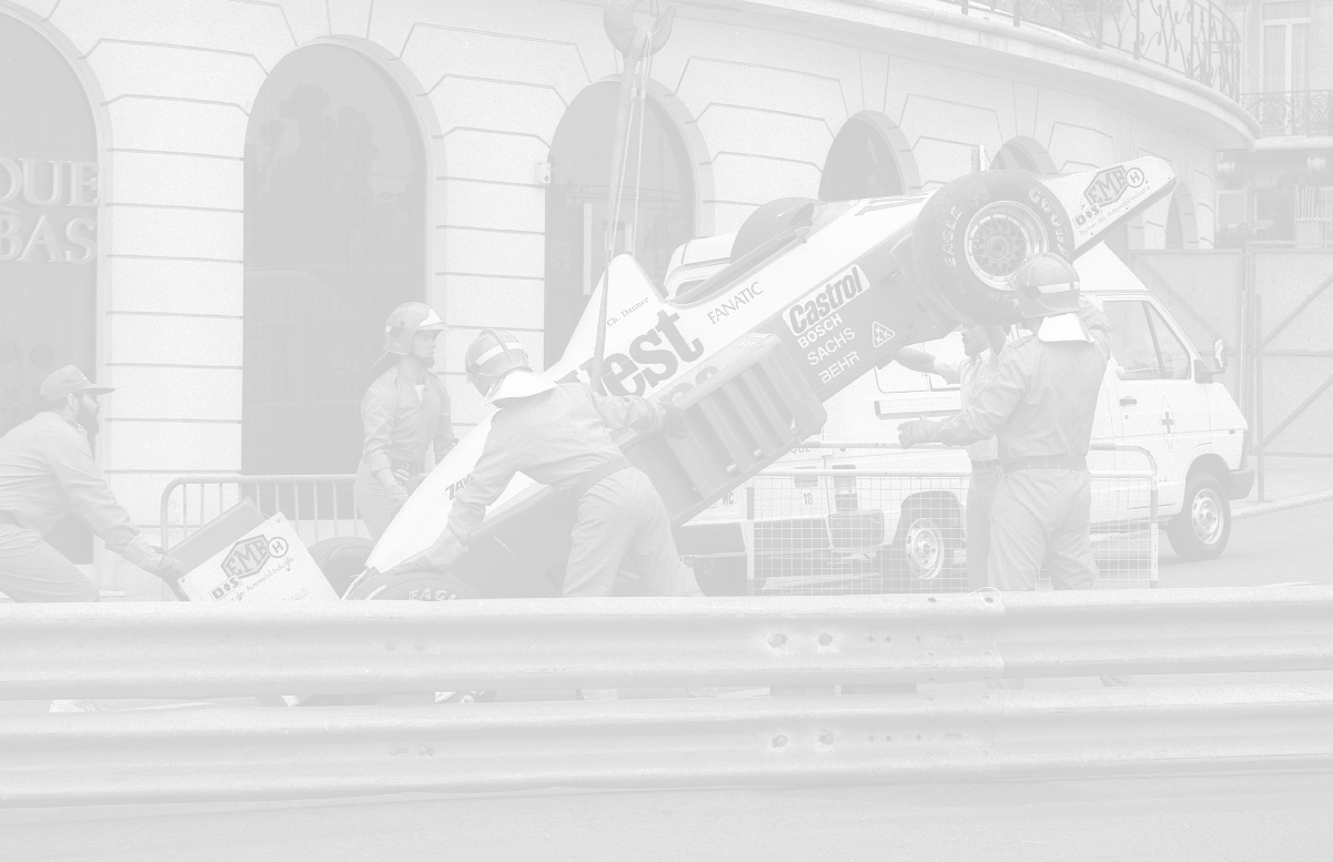 NEG-RETROSPETTIVA MICHELE ALBORETO PILOTA NELLA FOTO MICHELE ALBORETO CON CHRIISTIAN DANNER INCIDENTE ALLE PROVE DEL GP MONTECARLO ANNO 1987 AG ALDO LIVERANI SAS