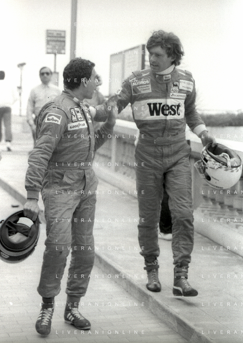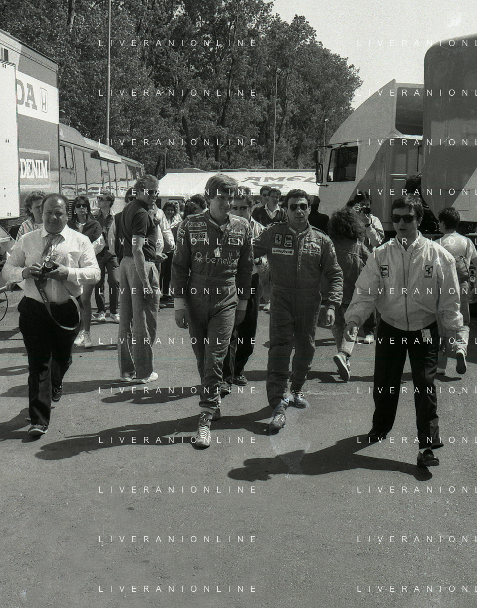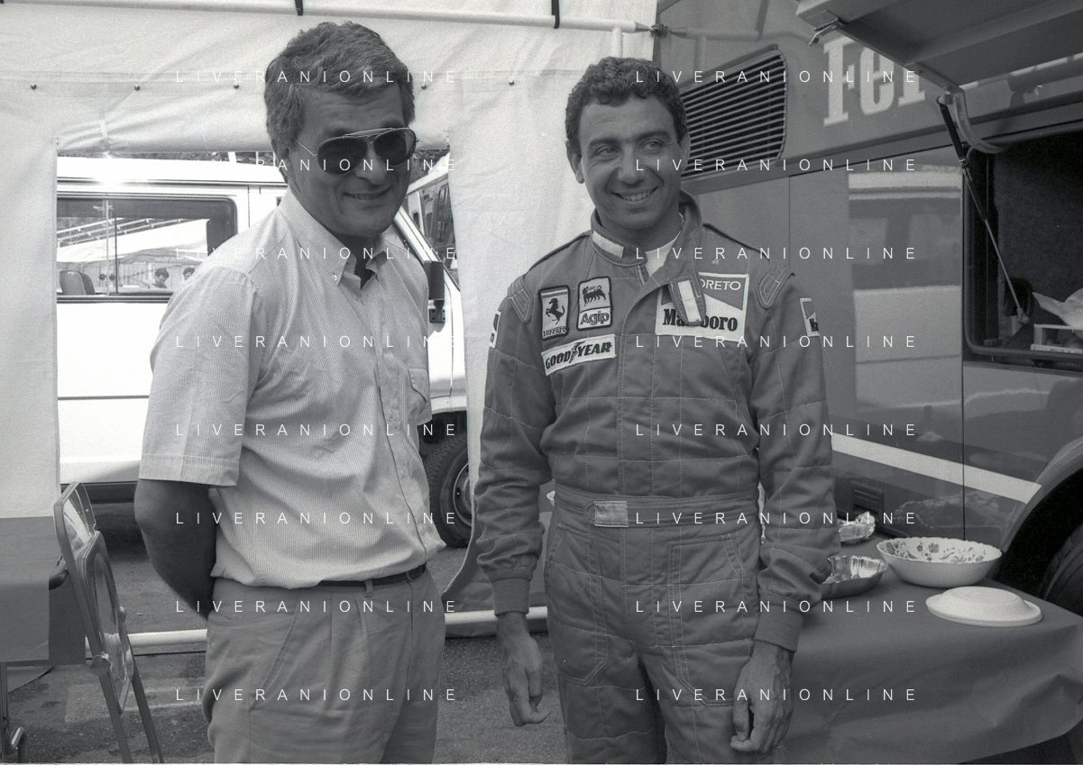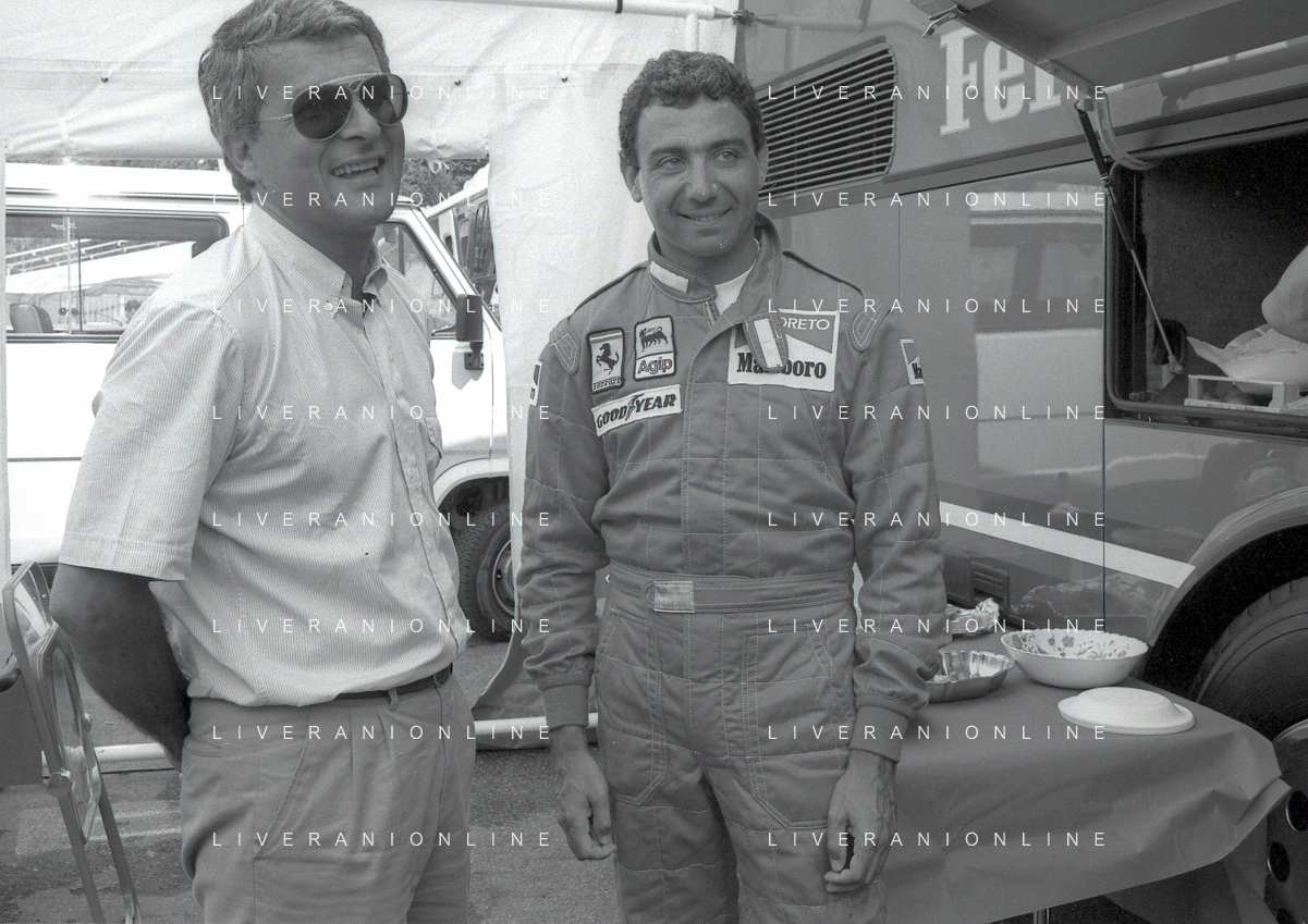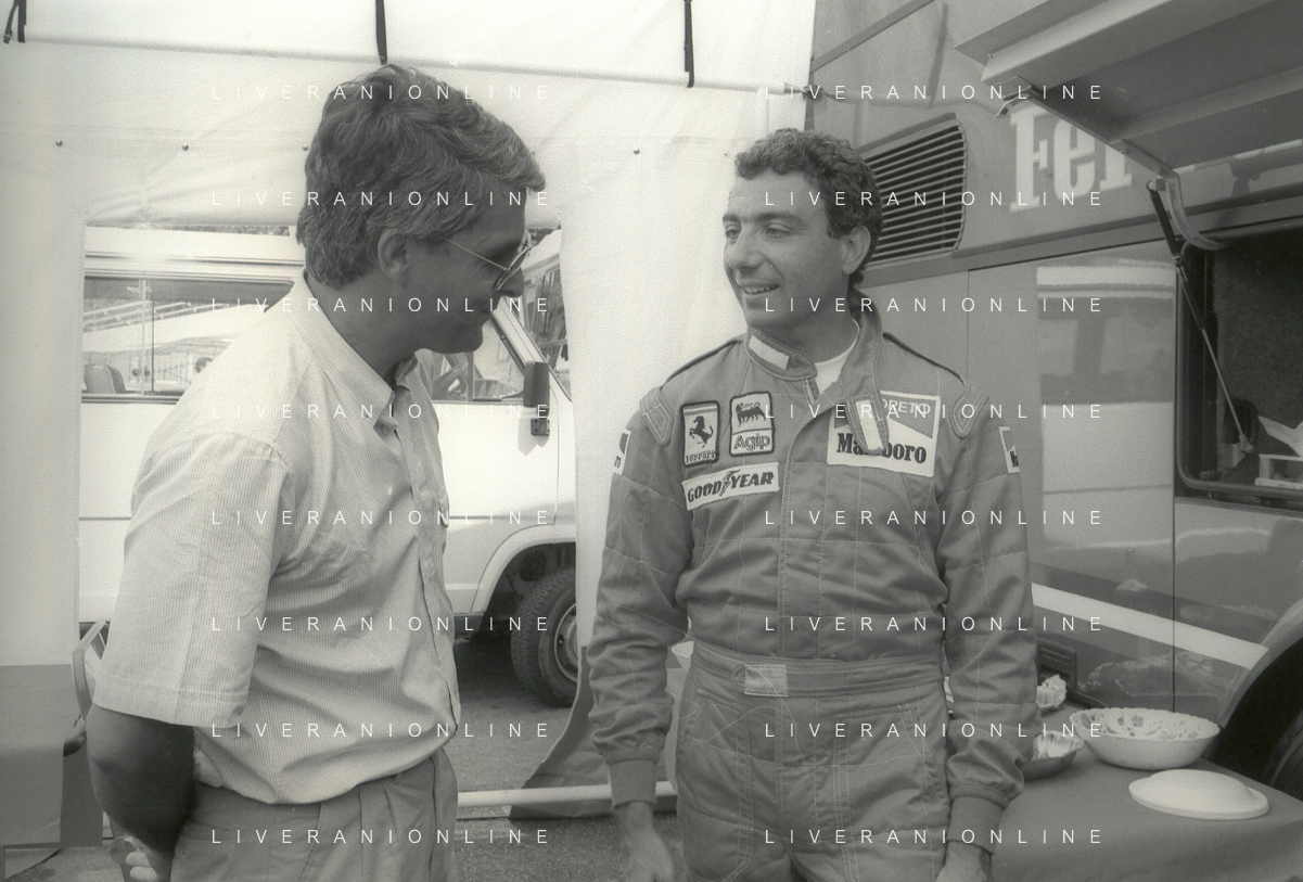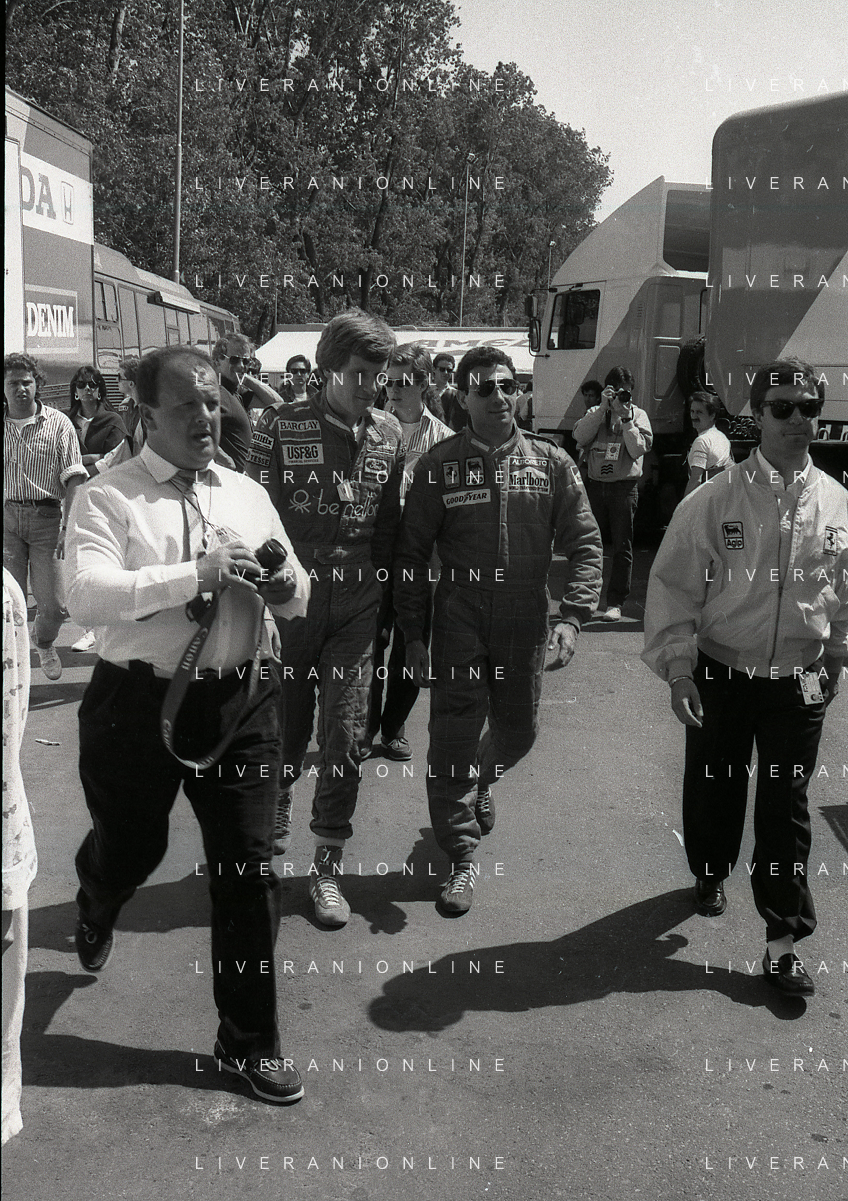 NEG-RETROSPETTIVA MICHELE ALBORETO PILOTA NELLA FOTO MICHELE ALBORETO CON THIERRY BOUTSEN ANNO 1987 AL GP DI IMOLA AG ALDO LIVERANI SAS