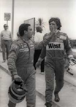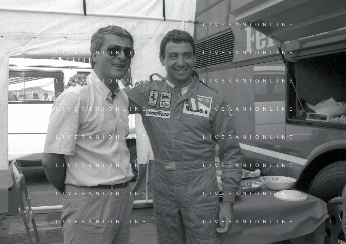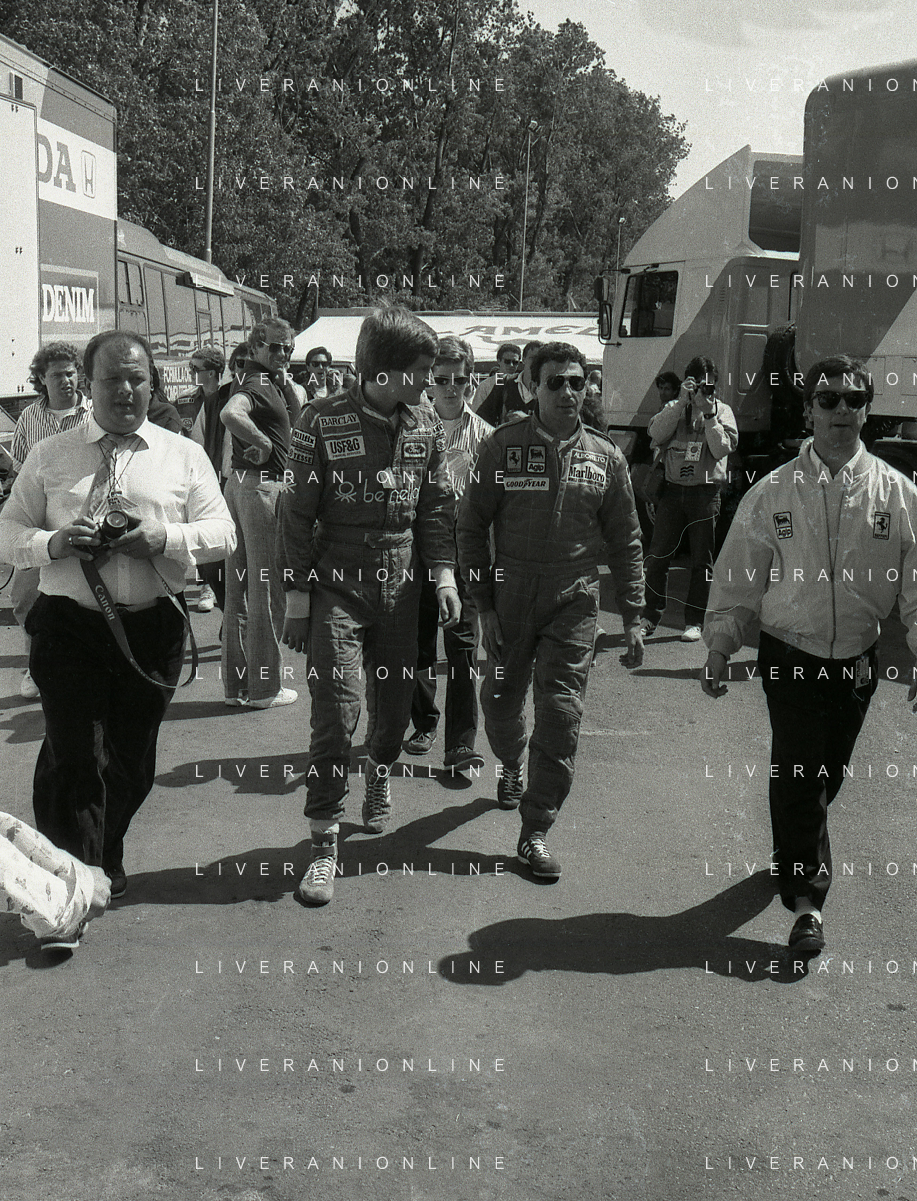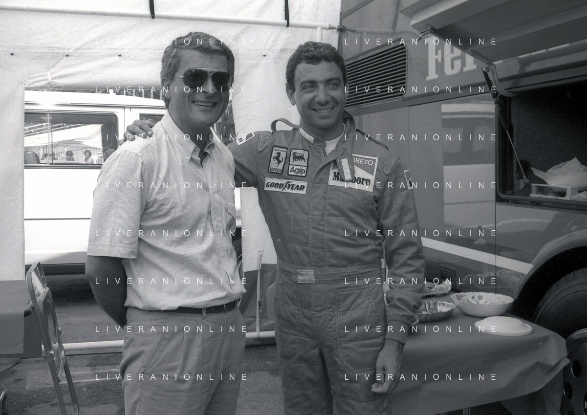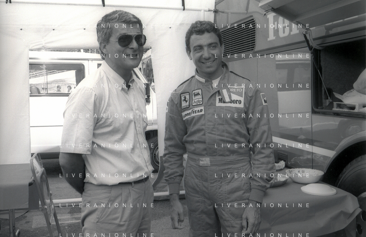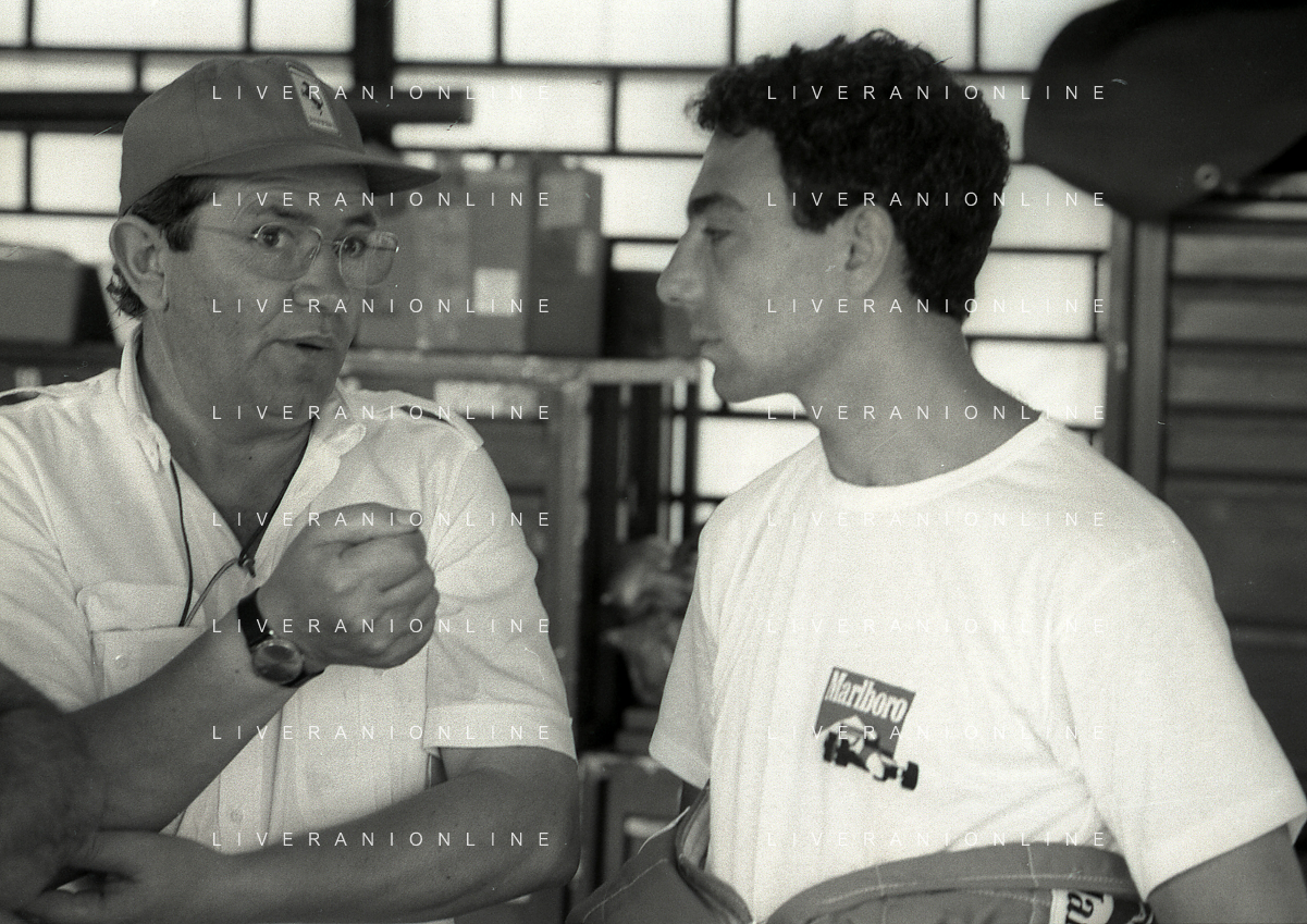 NEG-RETROSPETTIVA MICHELE ALBORETO PILOTA NELLA FOTO MICHELE ALBORETO CON THIERRY BOUTSEN ANNO 1987 AL GP DI IMOLA AG ALDO LIVERANI SAS