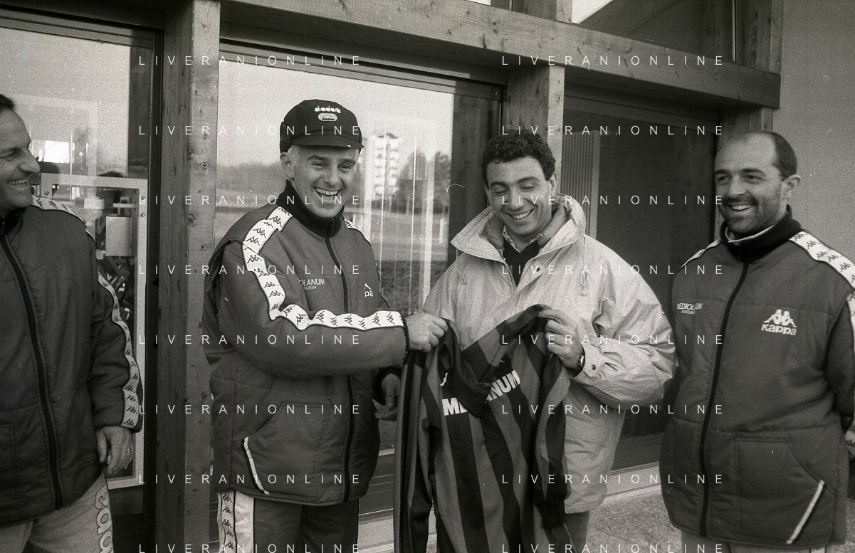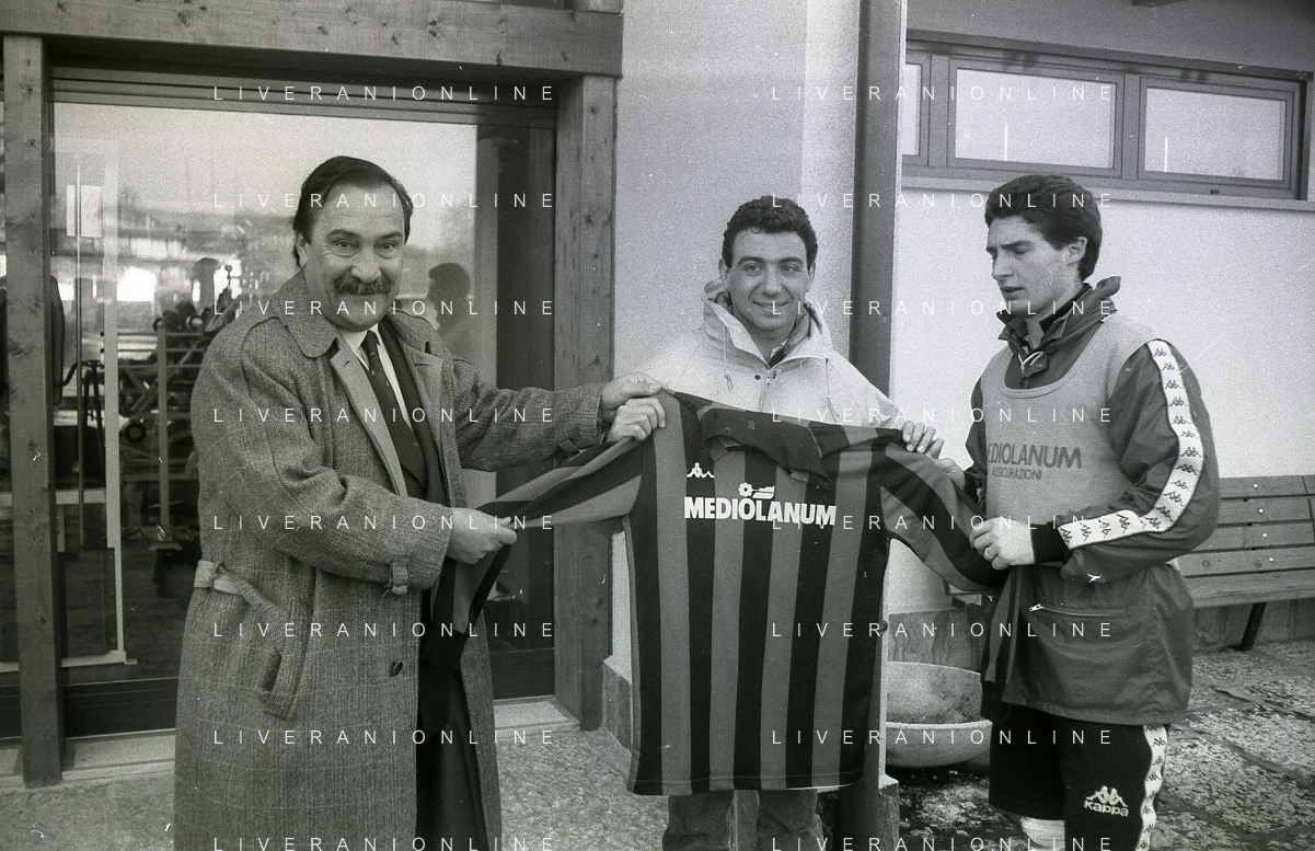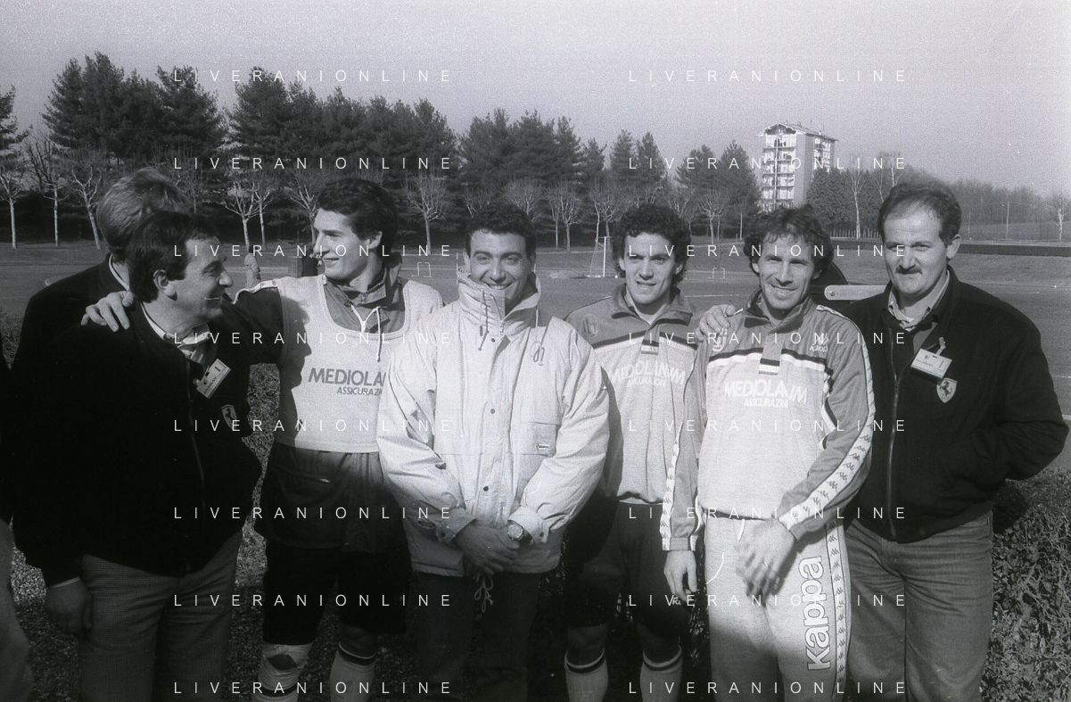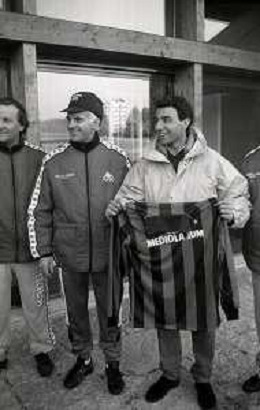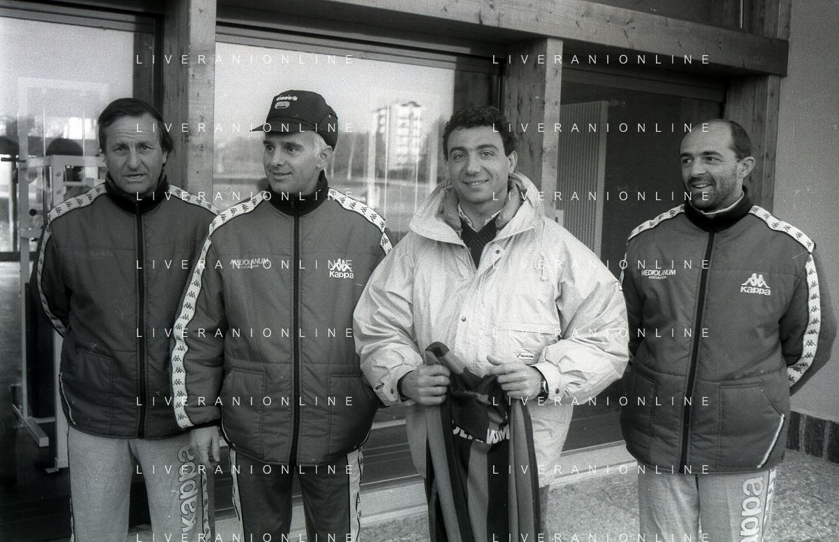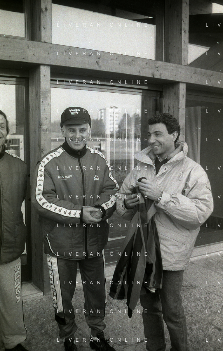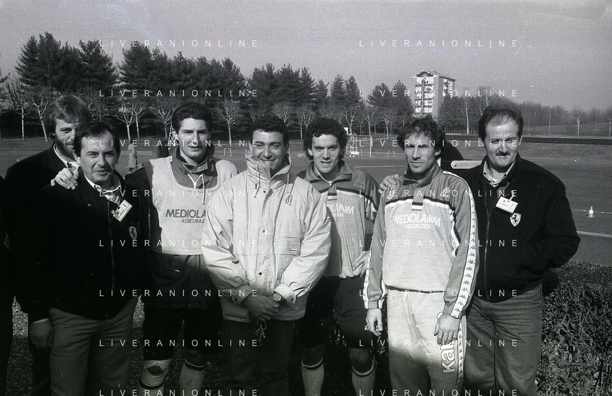 NEG-RETROSPETTIVA MICHELE ALBORETO PILOTA NELLA FOTO MICHELE ALBORETO CON ARRIGO SACCHI ITALO GALBIATI E VINCENZO PINCOLINI IN VISITA A MILANELLO ANNO 1988 AG ALDO LIVERANI SAS