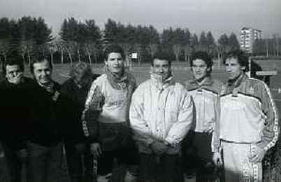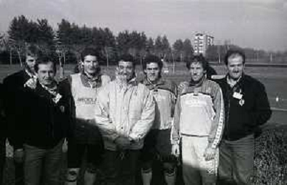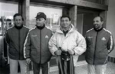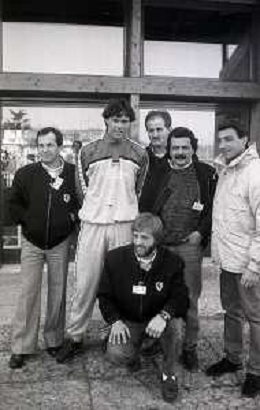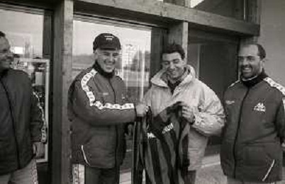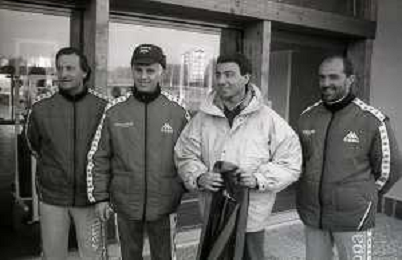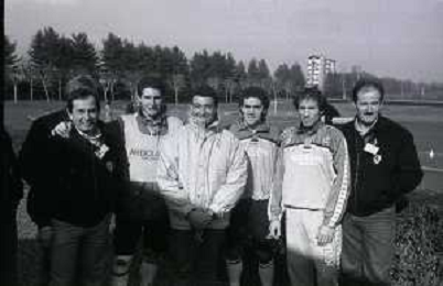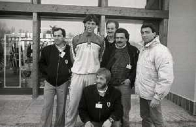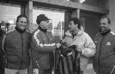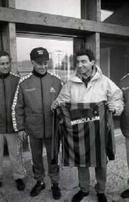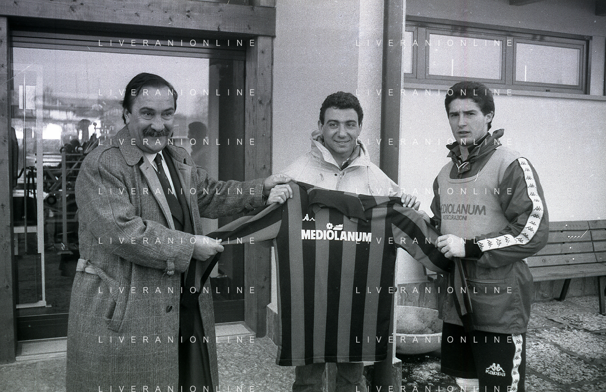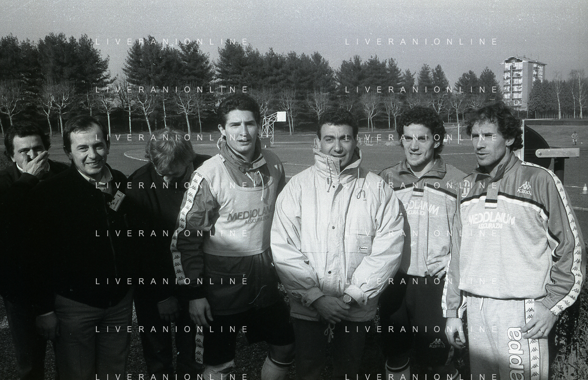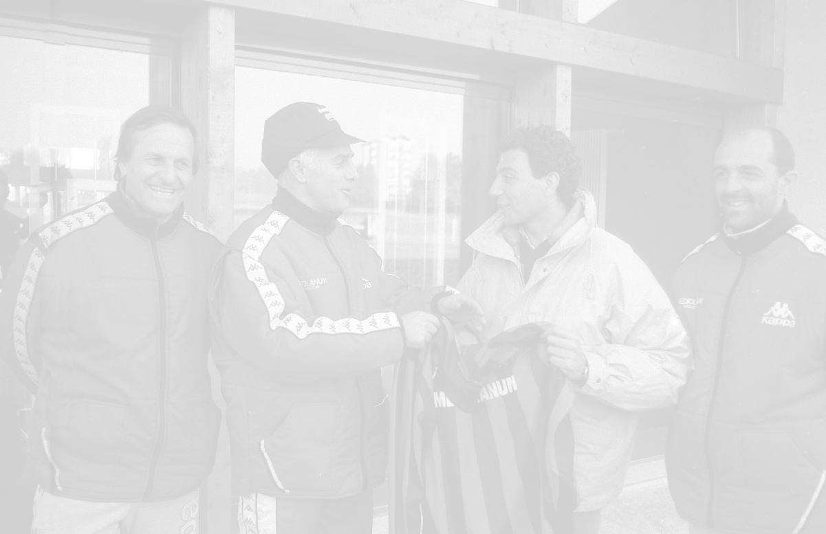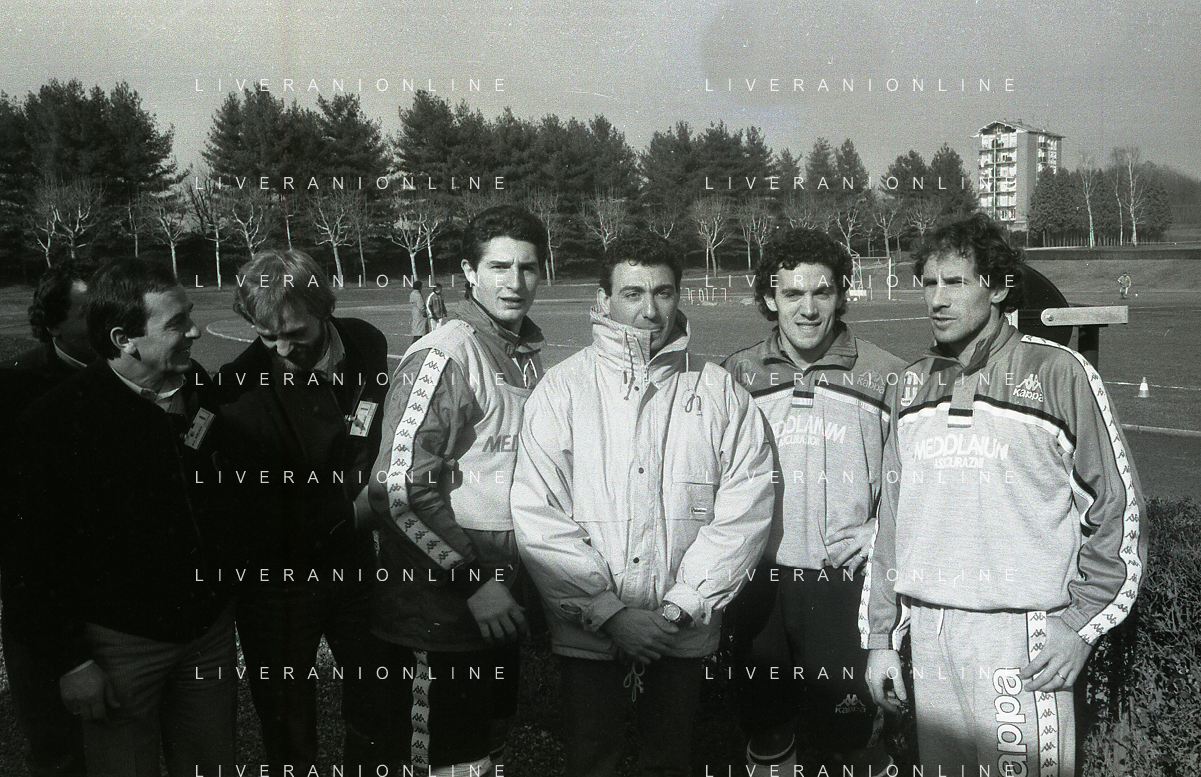 NEG-RETROSPETTIVA MICHELE ALBORETO PILOTA NELLA FOTO MICHELE ALBORETO CON ARRIGO SACCHI ITALO GALBIATI E VINCENZO PINCOLINI IN VISITA A MILANELLO ANNO 1988 AG ALDO LIVERANI SAS
