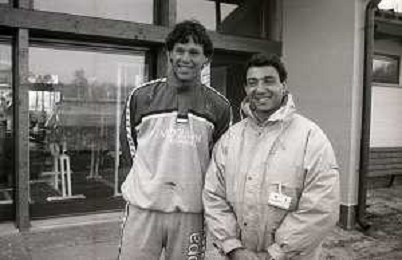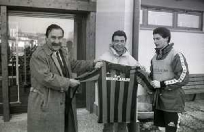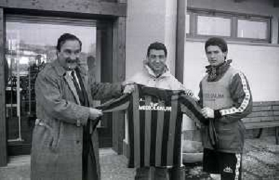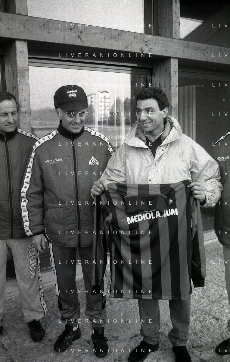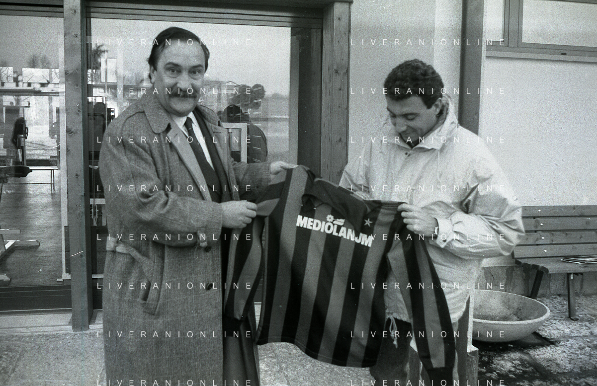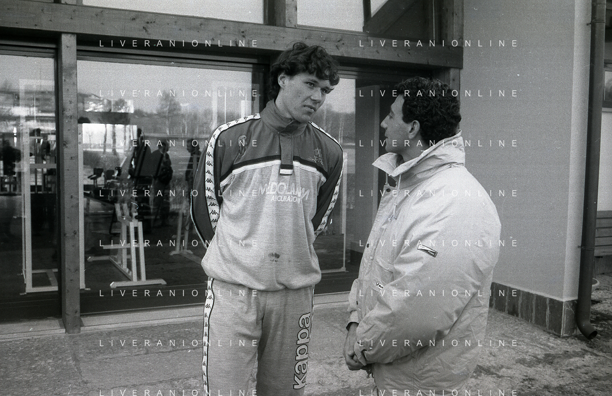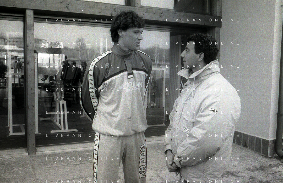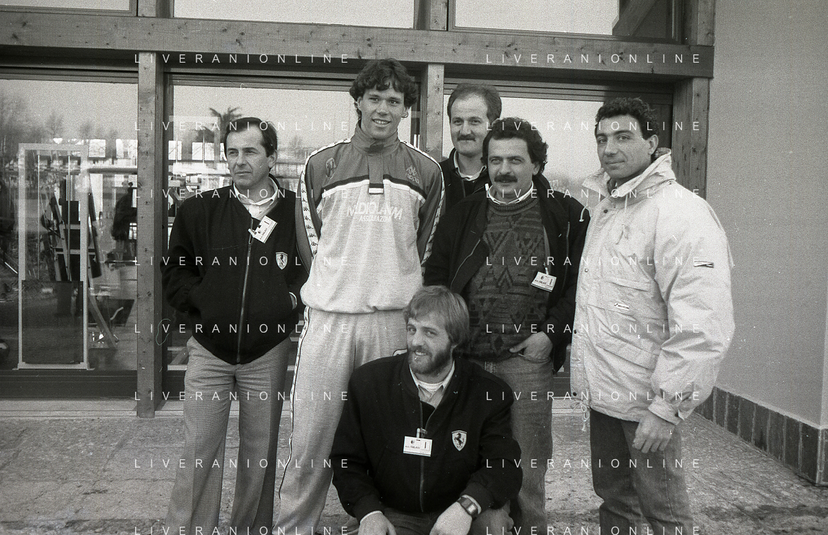 NEG-RETROSPETTIVA MICHELE ALBORETO PILOTA NELLA FOTO MICHELE ALBORETO CON MARCO VAN BASTEN IN VISITA A MILANELLO ANNO 1988 AG ALDO LIVERANI SAS