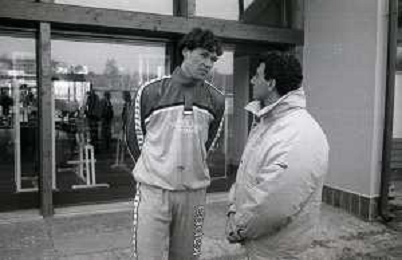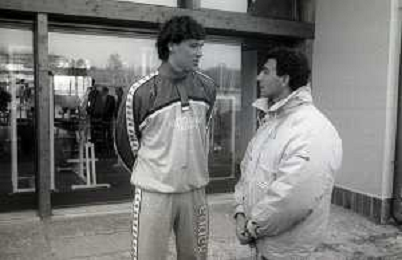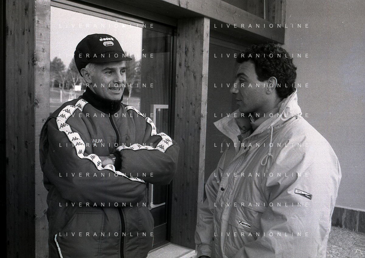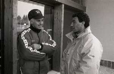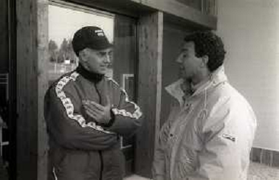 NEG-RETROSPETTIVA MICHELE ALBORETO PILOTA NELLA FOTO MICHELE ALBORETO CON ARRIGO SACCHI IN VISITA A MILANELLO ANNO 1988 AG ALDO LIVERANI SAS