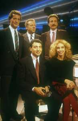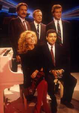 RETROSPETTIVA MICHELE ALBORETO PILOTA F1 NELLA FOTO MICHELE ALBORETO CON RENATO ZACCARELLI-GIUSEPPE DOSSENAJOHNNY DORELLI E SIDNEY ROME NELL'ANNO 1986 A MILANO NELLA TRASMISSIONE TELEVISIVA “PREMIATISSIMA“ AG ALDO LIVERANI SAS