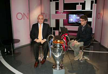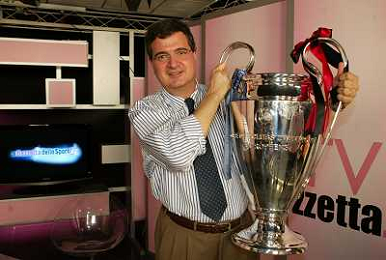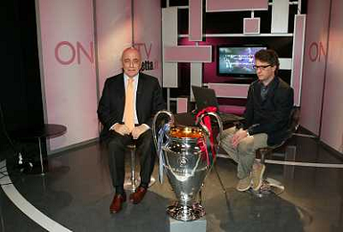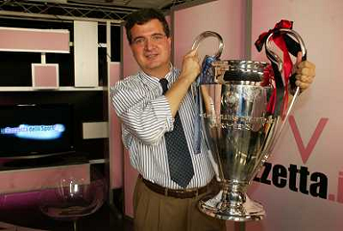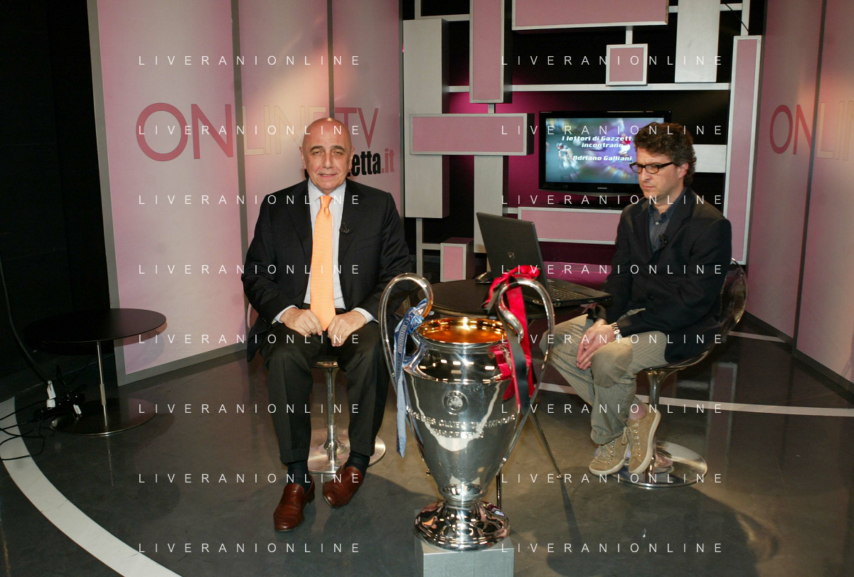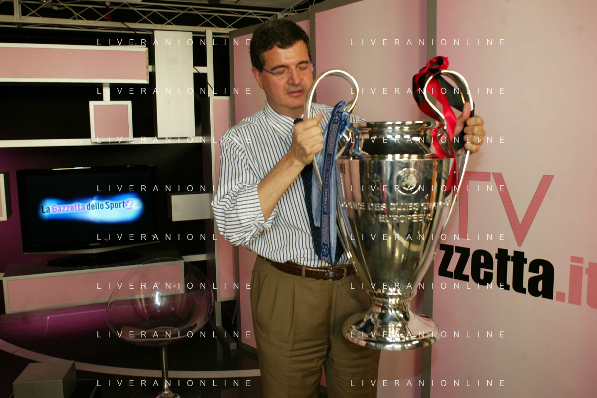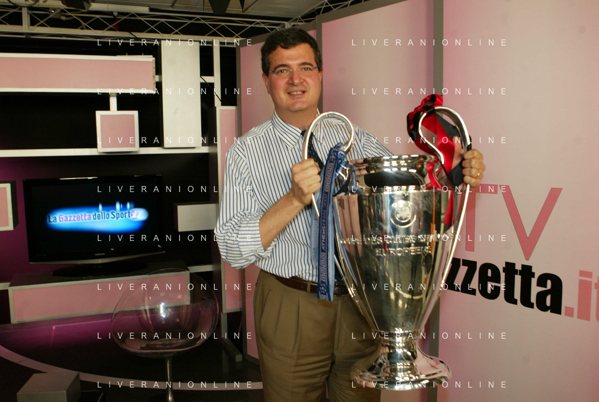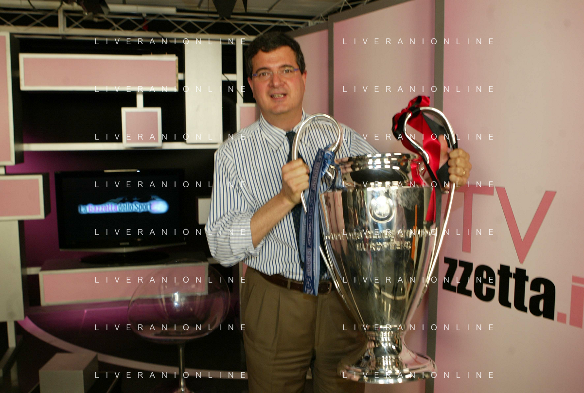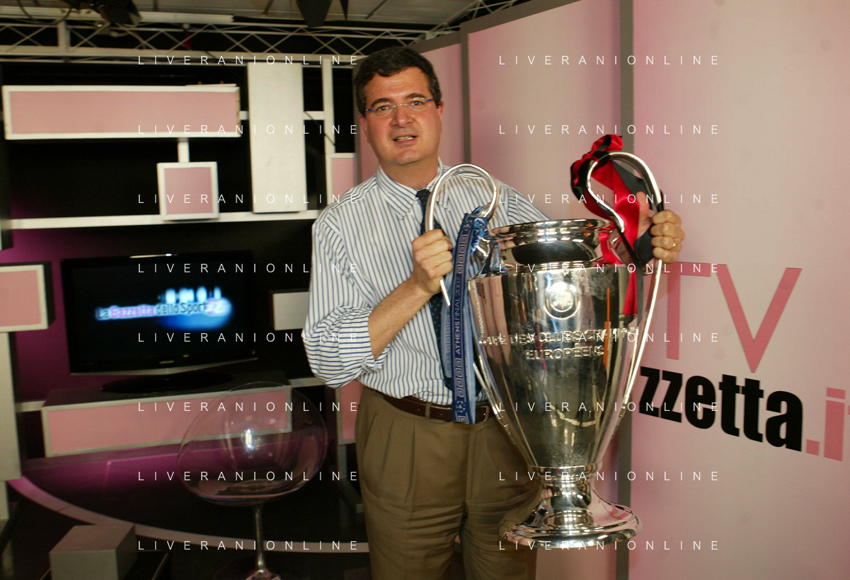 MILANO 2007- ADRIANO GALLIANO AMMNISTRATORE DEL AC MILAN PORTA LA COPPA DEI CAMPIONI VINTA AD ATENE ALLA GAZZETTA DELLO SPORT DI VIA SOLFERINO 28 MILANO NELLA FOTO ADRIANO GALLIANI CON LA COPPA DEI CAMPIONI CON IL GIORNALISTA ANDREA SCHIANCHI AG ALDO LIVERANI