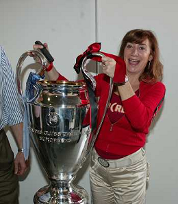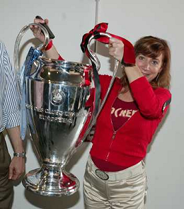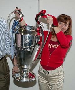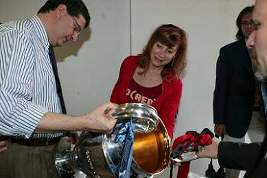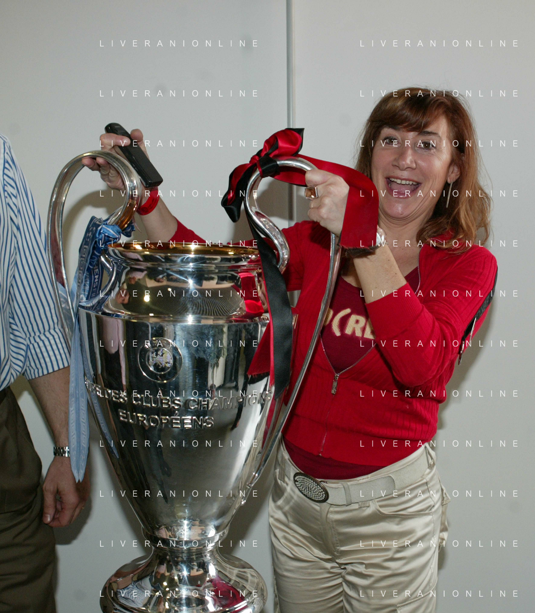 MILANO 2007- ADRIANO GALLIANO AMMNISTRATORE DEL AC MILAN PORTA LA COPPA DEI CAMPIONI VINTA AD ATENE ALLA GAZZETTA DELLO SPORT DI VIA SOLFERINO 28 MILANO NELLA FOTO GABRIELLA MANCINI GIORNALISTA CON LA COPPA DEI CAMPIONI AG ALDO LIVERANI