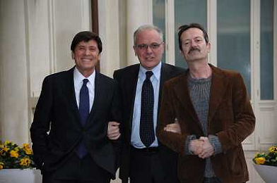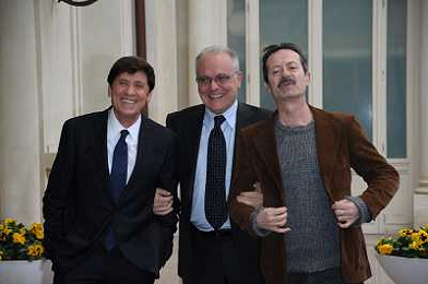 Conferenza stampa di presentazione della 62ma edizione del Festival della Canzone Italiana di Sanremo 31-01-2012 nella foto Gianni Morandi con Rocco Papaleo e il direttore di Rai 1 Mauro Mazza ©Gazzaniga/Agenzia Aldo Liverani Sas
