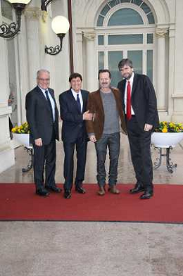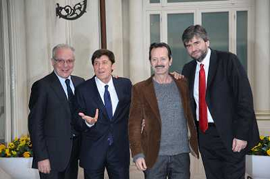 Conferenza stampa di presentazione della 62ma edizione del Festival della Canzone Italiana di Sanremo 31-01-2012 nella foto Gianni Morandi con Rocco Papaleo, il direttore di Rai 1 Mauro Mazza e il direttore artistico Gianmarco Mazzi ©Gazzaniga/Agenzia Aldo Liverani Sas