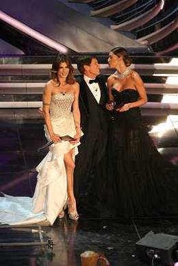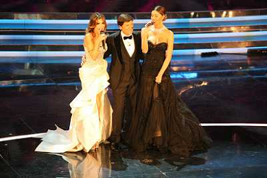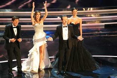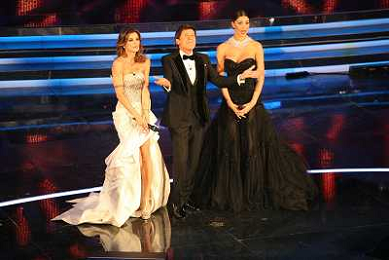 SANREMO: 62mo FESTIVAL DELLA CANZONE ITALIANA - PRIMA SERATA 14/02/2012 NELLA FOTO GIANNI MORANDI CON ELISABETTA CANALIS E BELEN RODRIGUEZ ©GAZZANIGA/AGENZIA ALDO LIVERANI SAS