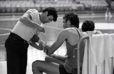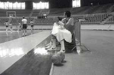 NEG-RETROSPETTIVA DINO MENEGHIN BASKET NELLA FOTO DINO MENEGHIN CON LA NAZIONALE ITALIANA A TORINO INFORTUNIO AL BRACCIO ANNO 1979 AG ALDO LIVERANI SAS