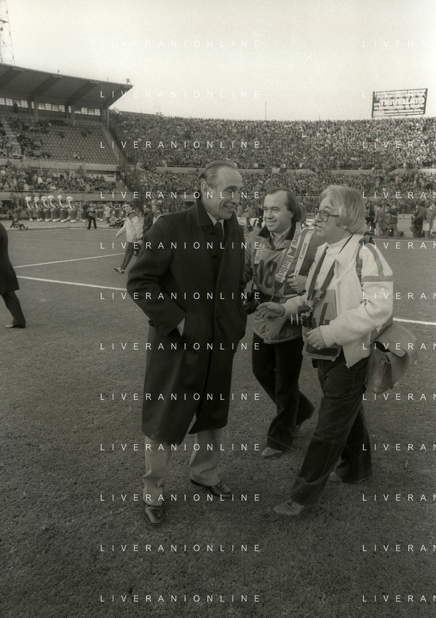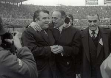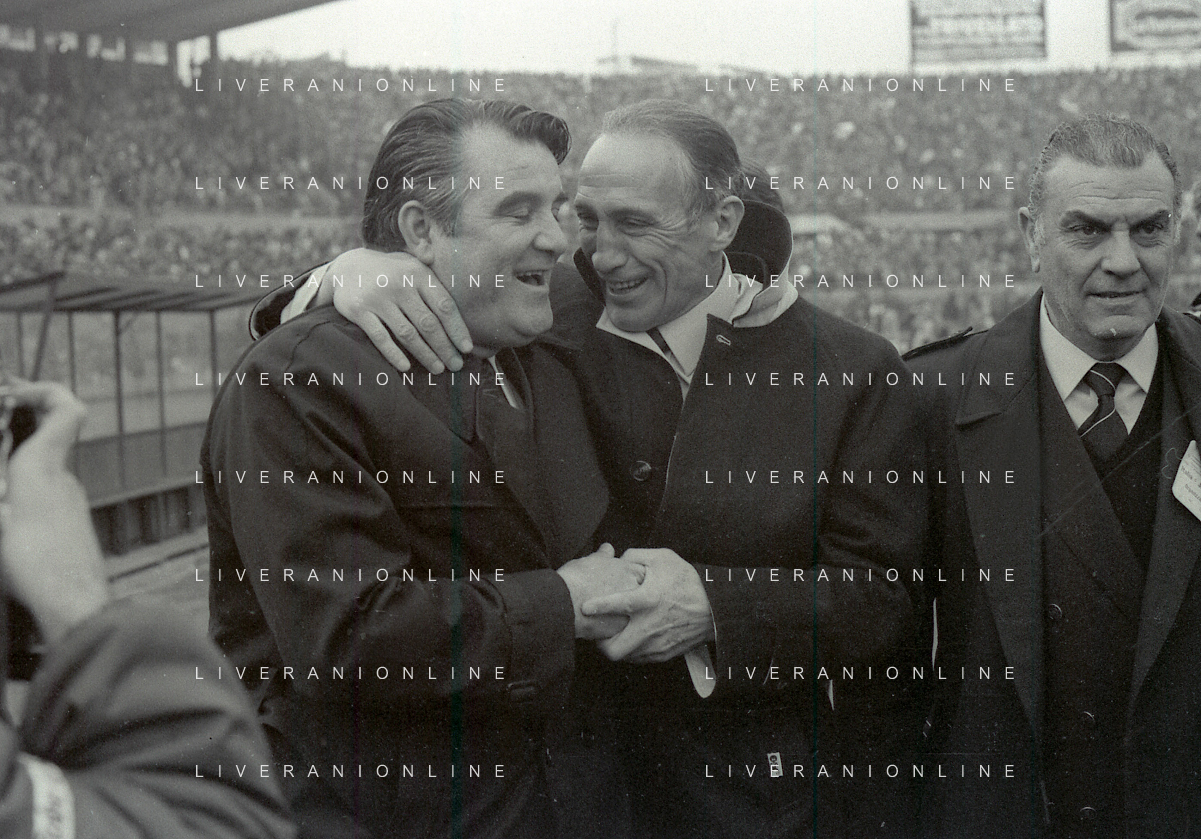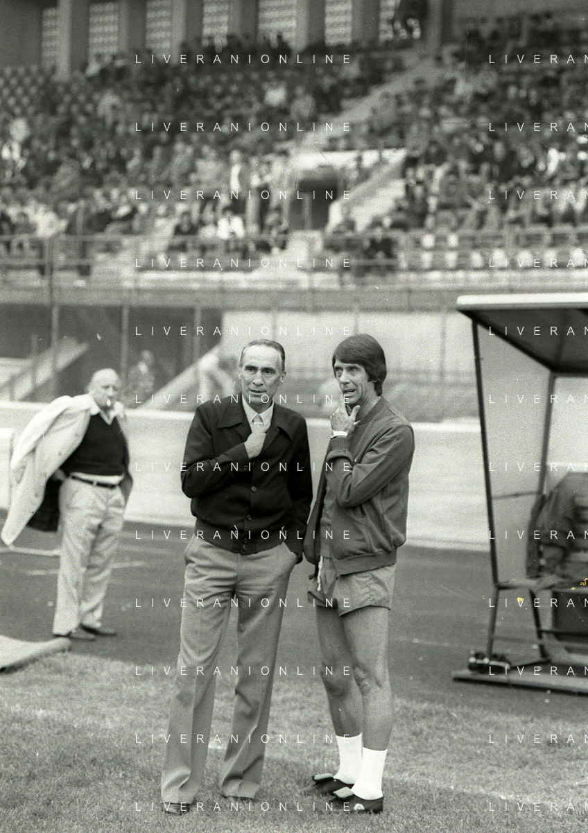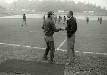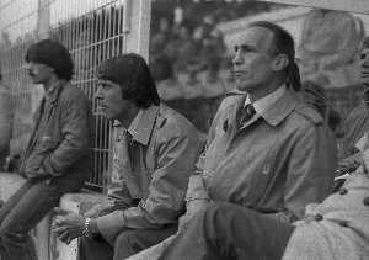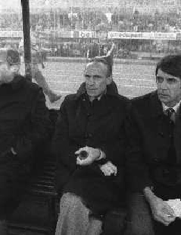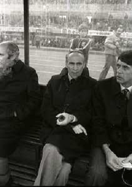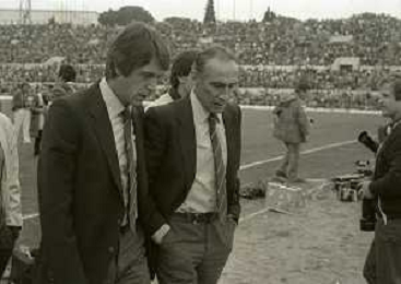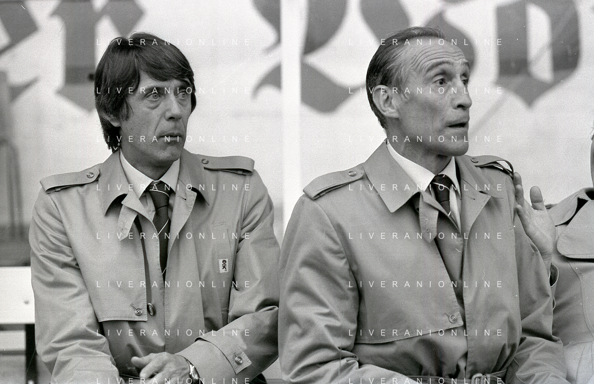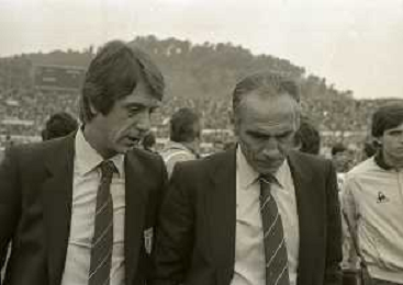 RETROSPETTIVA ENZO BEARZOT ALLENATORE NAZIONALE ITALIANA CALCIO NELLA FOTO ENZO BEARZOT NELL'ANNO 198O A TORINO NELLA PARTITA ITALIA-JUGOSLAVIA CON L'ALLENATORE DELLA NAZIONALE JOGOSLAVIA Miljan Miljanić AG ALDO LIVERANI SAS