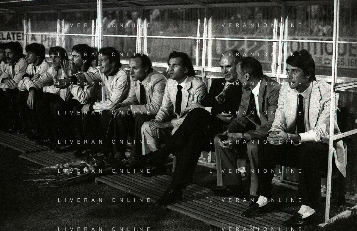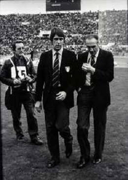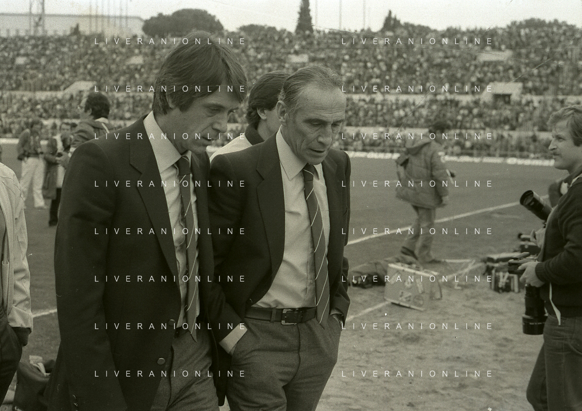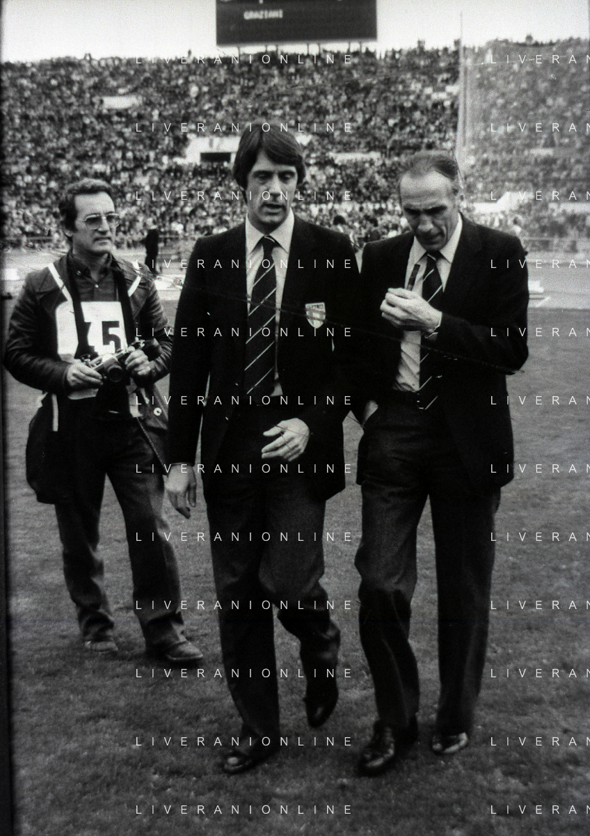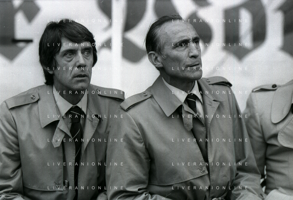 RETROSPETTIVA ENZO BEARZOT ALLENATORE NAZIONALE ITALIANA CALCIO NELLA FOTO ENZO BEARZOT NELL'ANNO 198O A TORINO NELLA PARTITA ITALIA-JUGOSLAVIA E GAETANO SCIREA AG ALDO LIVERANI SAS