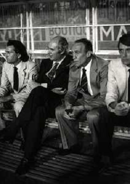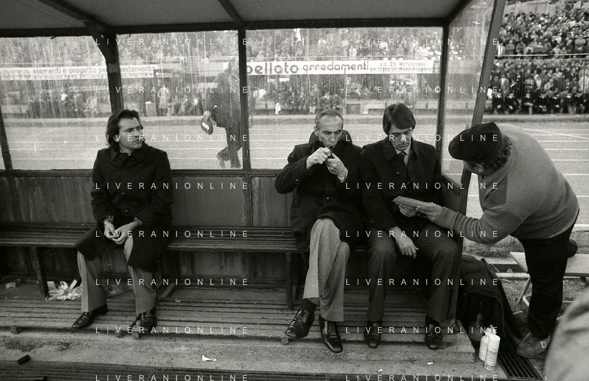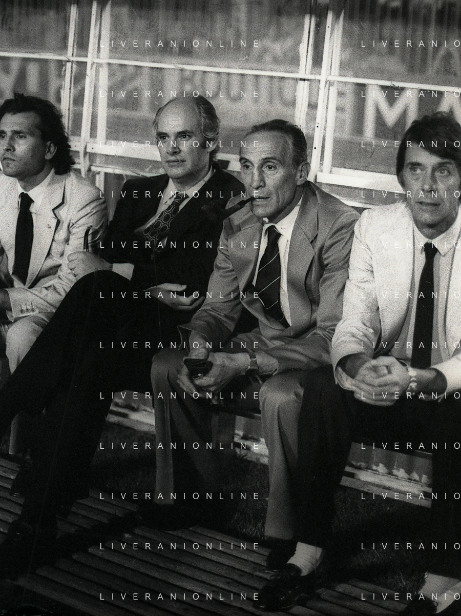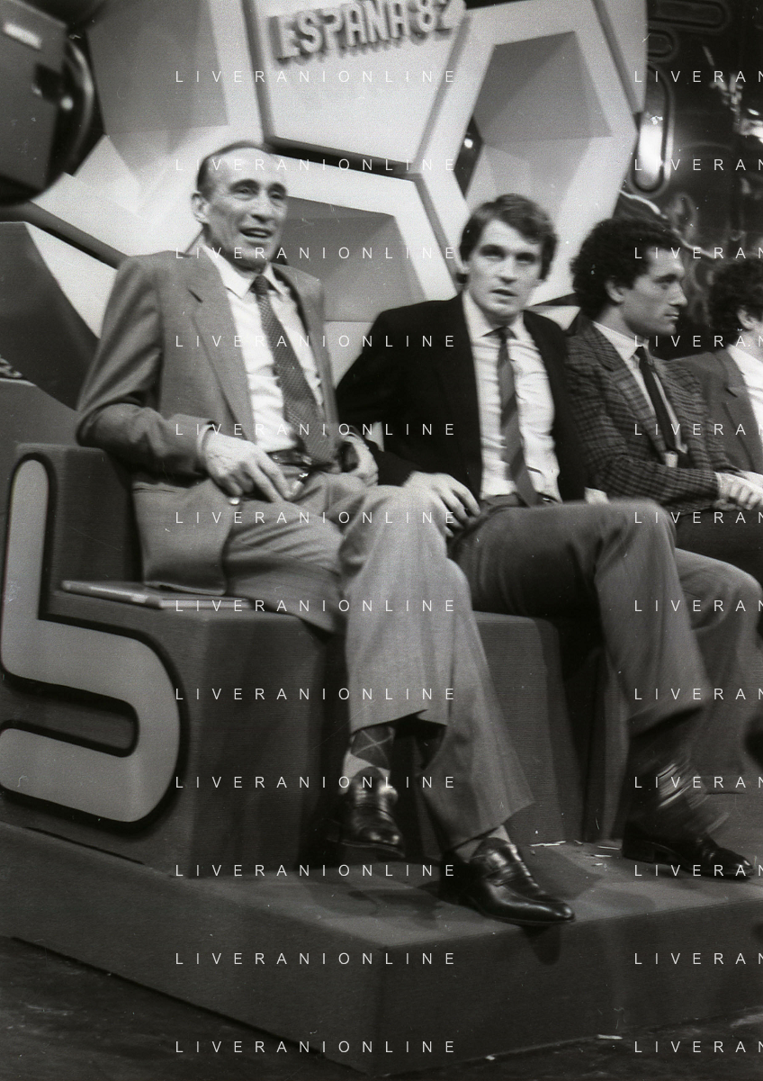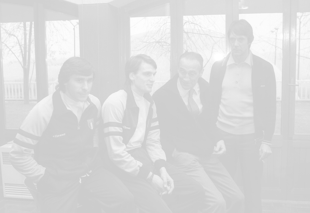 RETROSPETTIVA ENZO BEARZOT ALLENATORE NAZIONALE ITALIANA CALCIO NELLA FOTO ENZO BEARZOT NELL'ANNO 198O CON BRUNO CONTI MARCO TARDELLI E CESARE MALDNI AG ALDO LIVERANI SAS