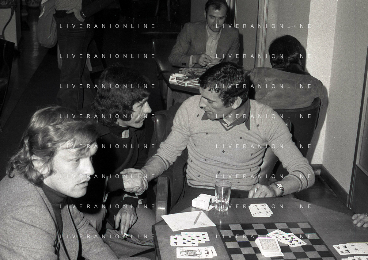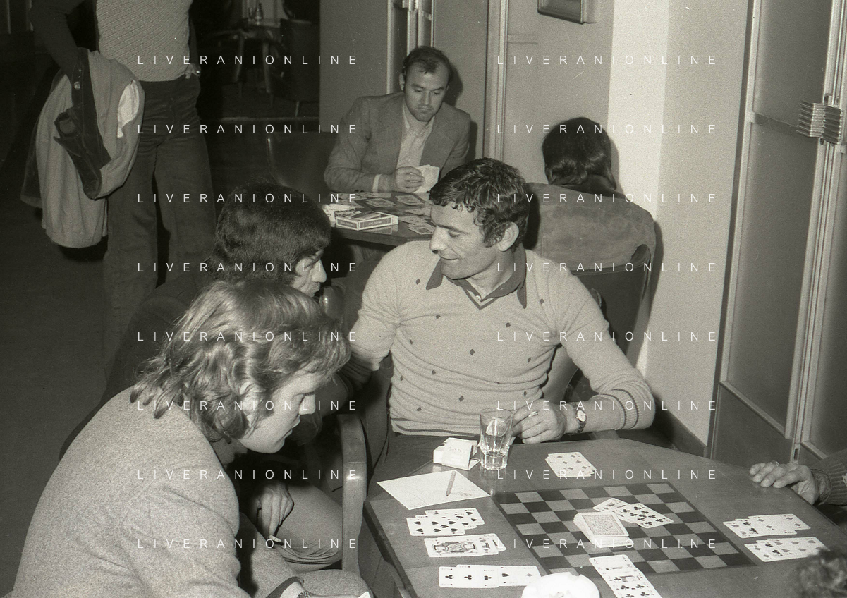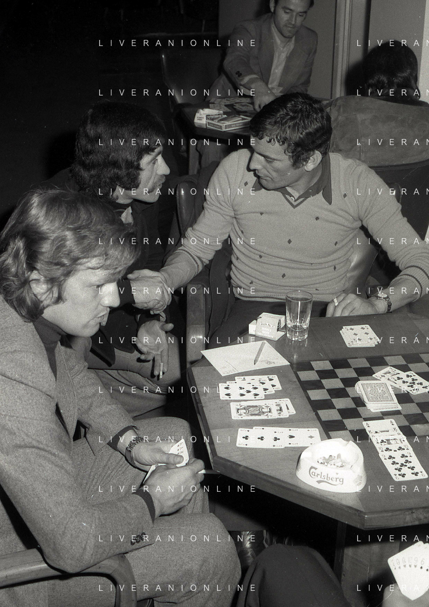 RETROSPETTIVA GIGI RIVA CALCIATORE 1974 NELLA FOTO GIGI RIVA CON ENRICO ALBERTOSI GIOCANO A CARTE AG ALDO LIVERANI SAS