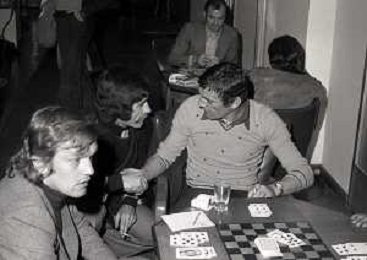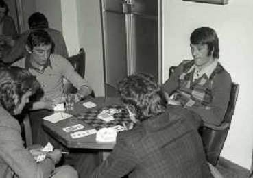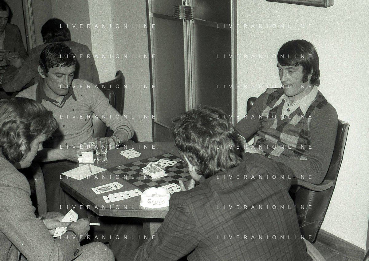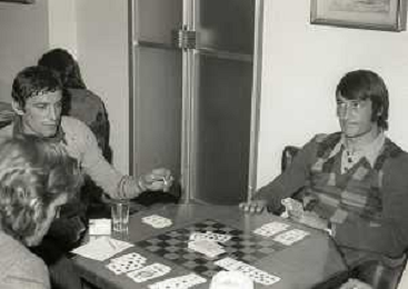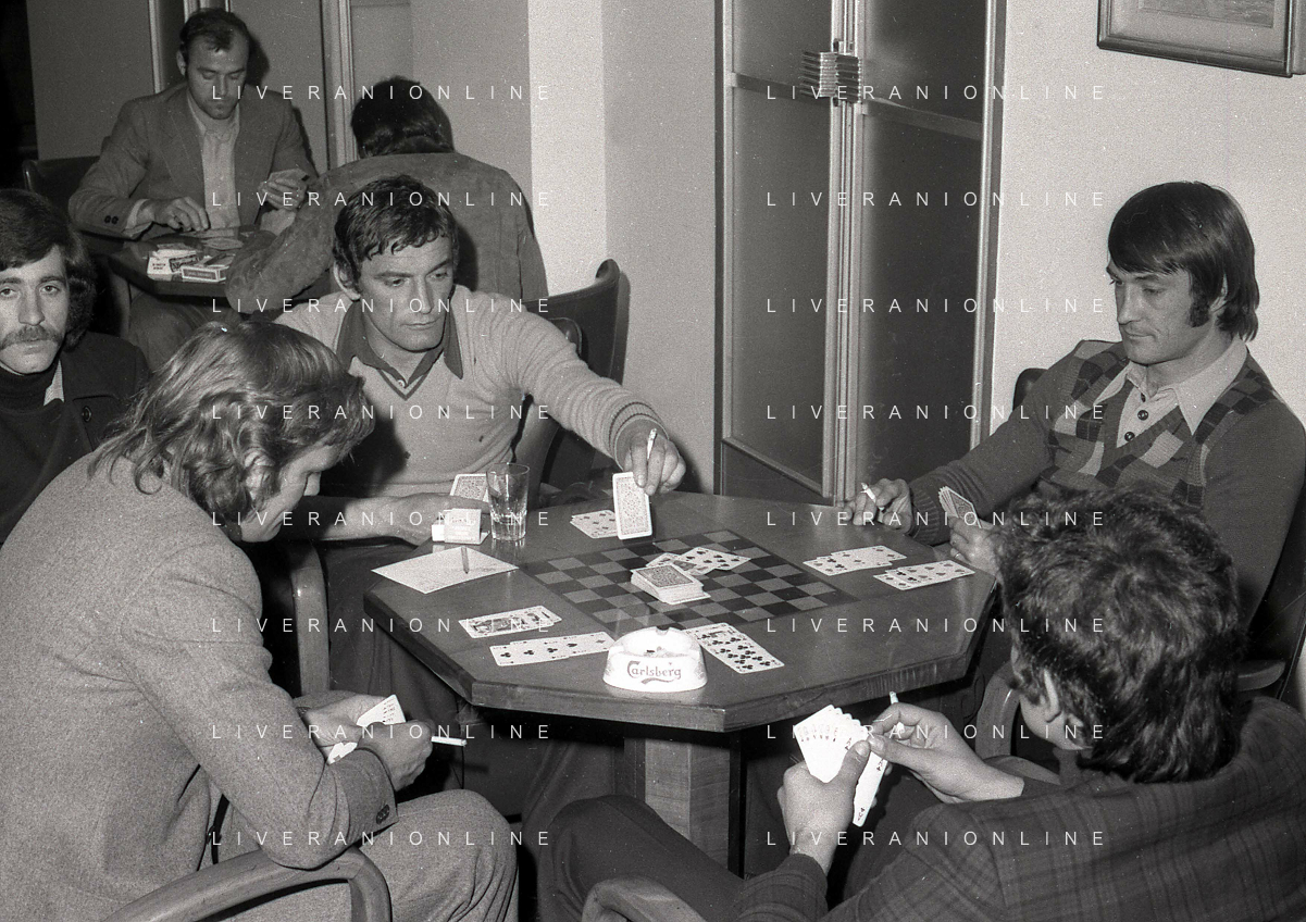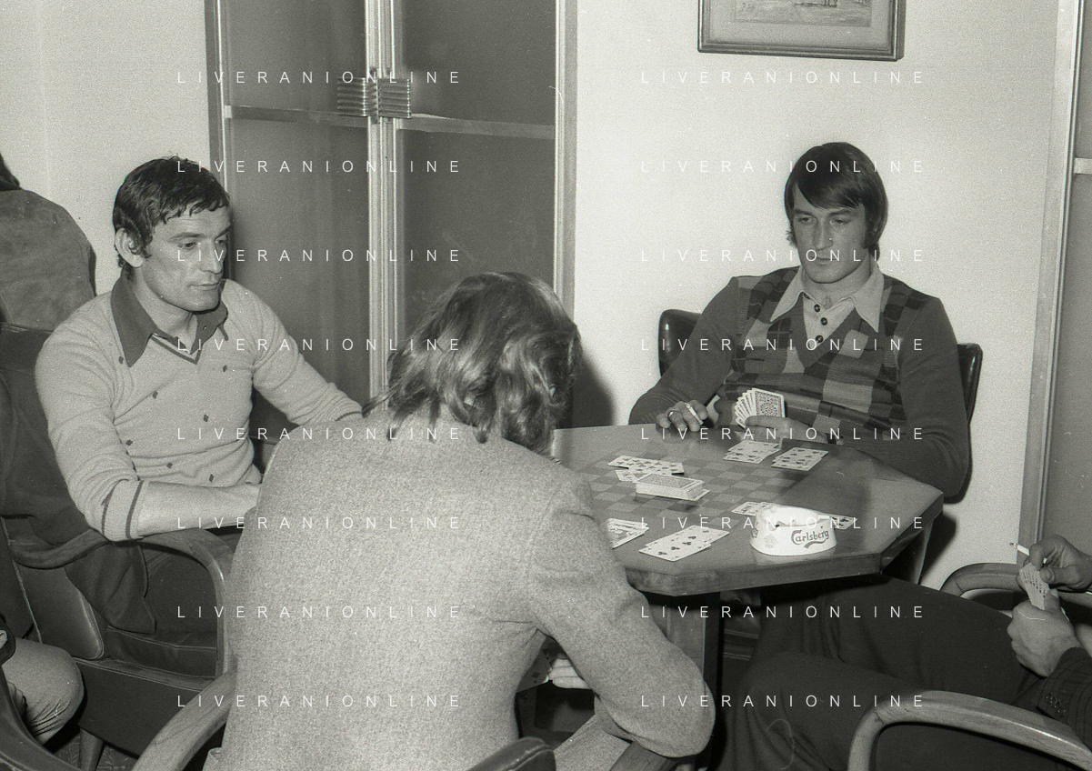 RETROSPETTIVA GIGI RIVA CALCIATORE 1974 NELLA FOTO GIGI RIVA CON ENRICO ALBERTOSI GIOCANO A CARTE AG ALDO LIVERANI SAS