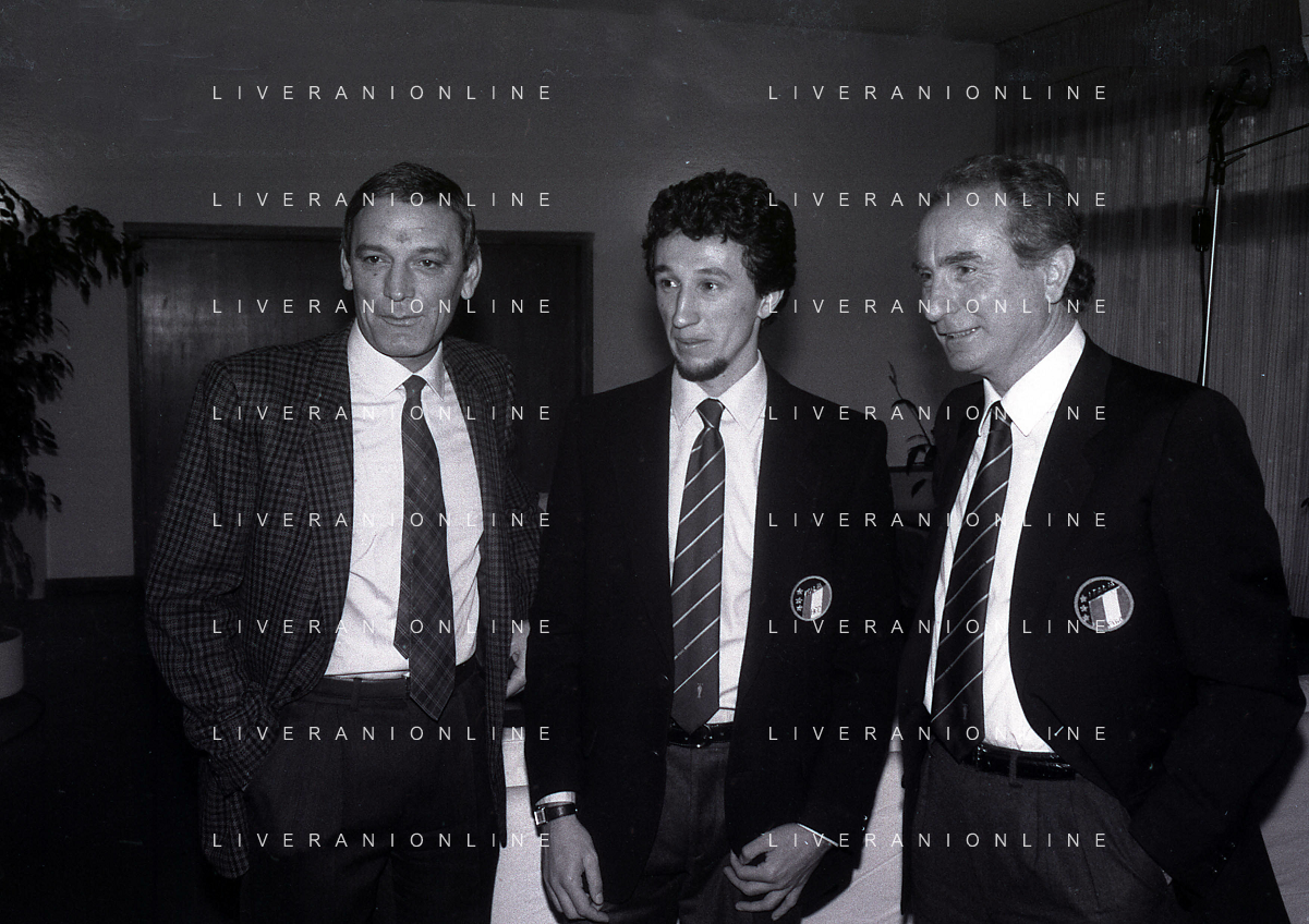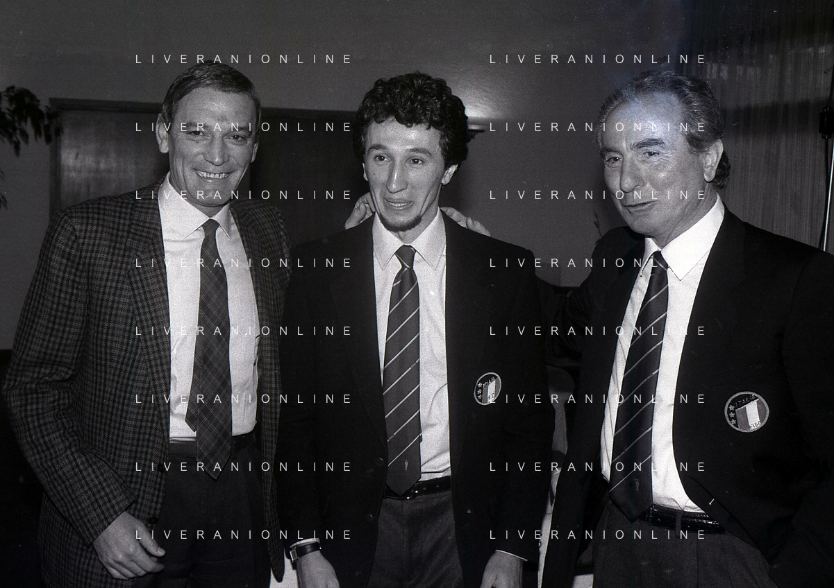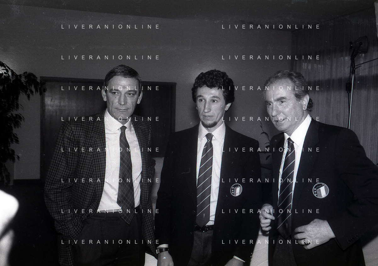 RETROSPETTIVA GIGI RIVA EX CALCIATORE E DIRIGENTE NAZIONALE ITALIANA CALCIO NELLA FOTO GIGI RIVA CON LUCA FUSI E AZEGLIO VICINI AG ALDO LIVERANI SAS