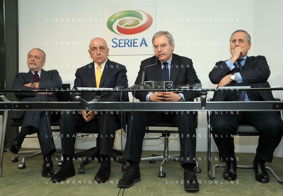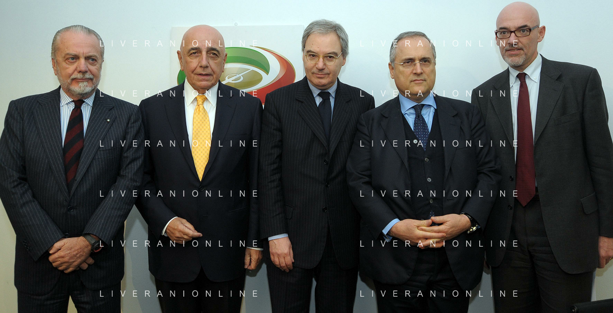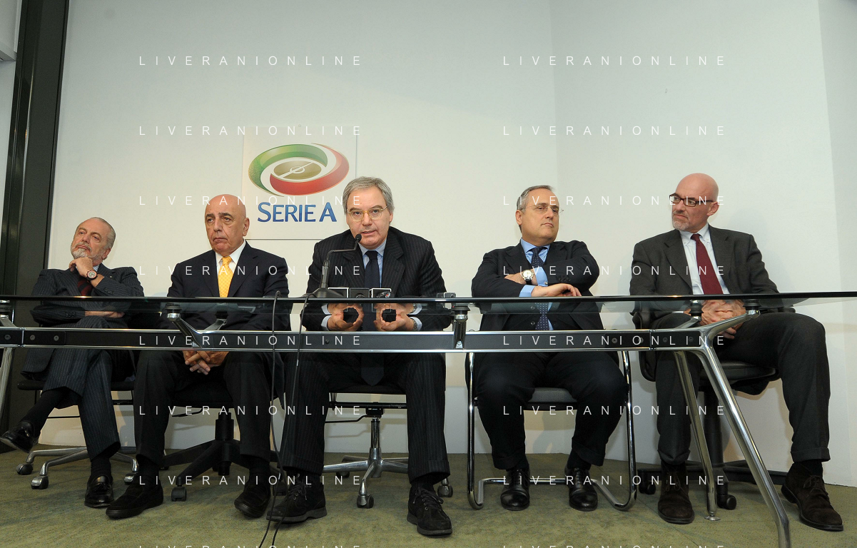 MILANO 18/1/2013 VIA ROSELLINI, 4 ELEZIONE DEL PRESIDENTE DELLA LEGA CALCIO SERIE A NELLA FOTOAURELIO DE LAURENTIIS, ADRIANO GALLIANI, MAURIZIO BERETTA, CLAUDIO LOTITO E MARCO BRUNELLI FOTO ROMANO/AG ALDO LIVERANI