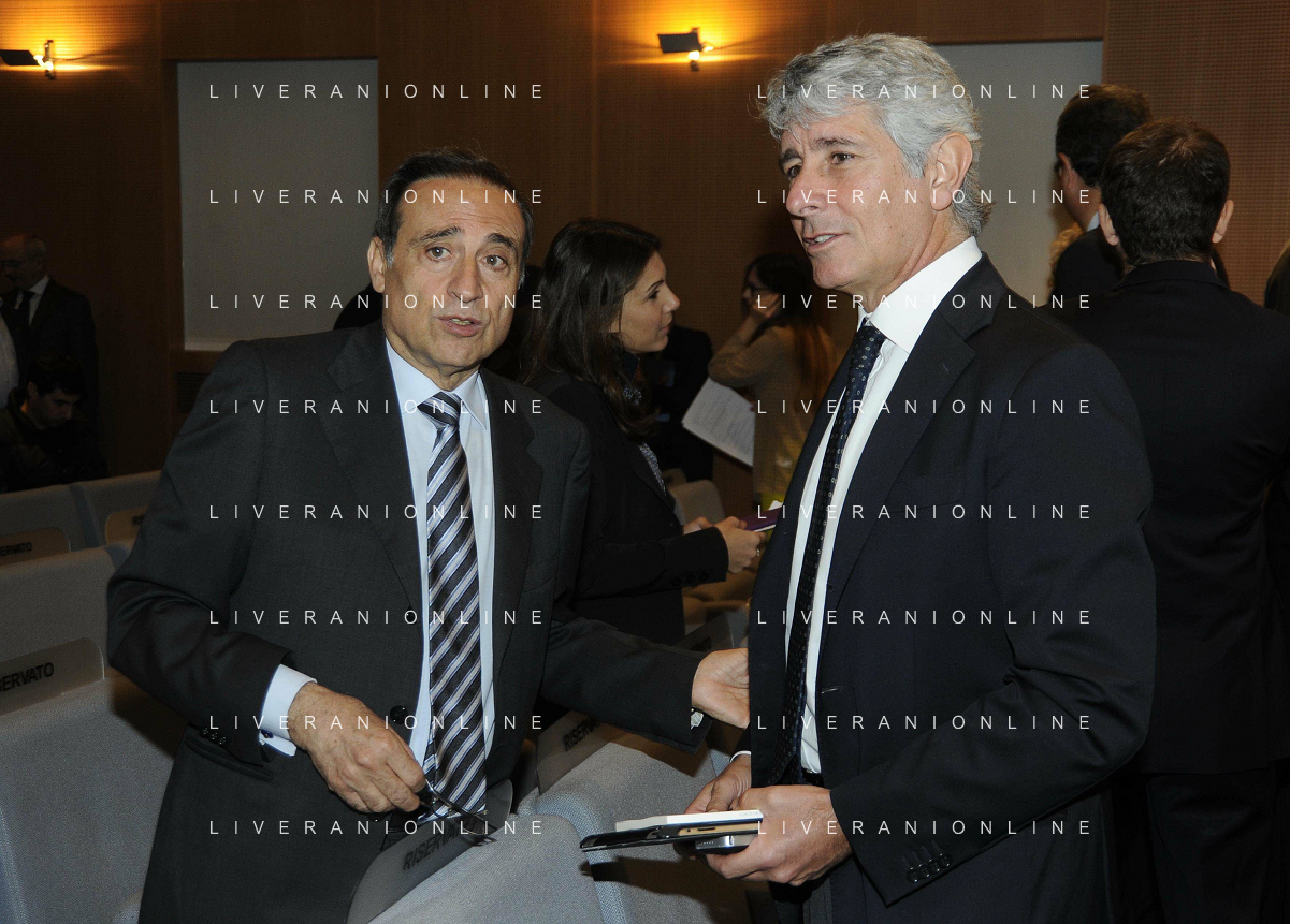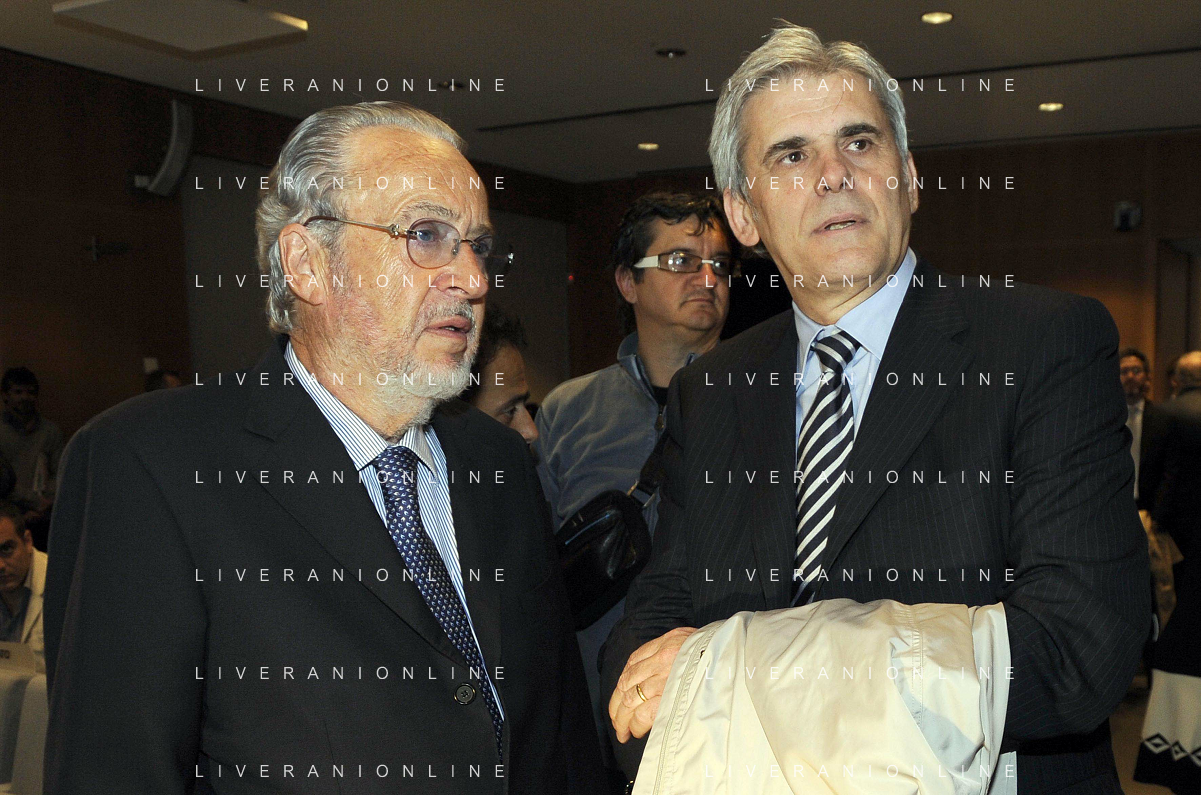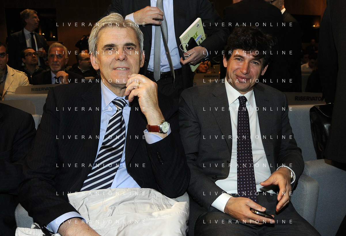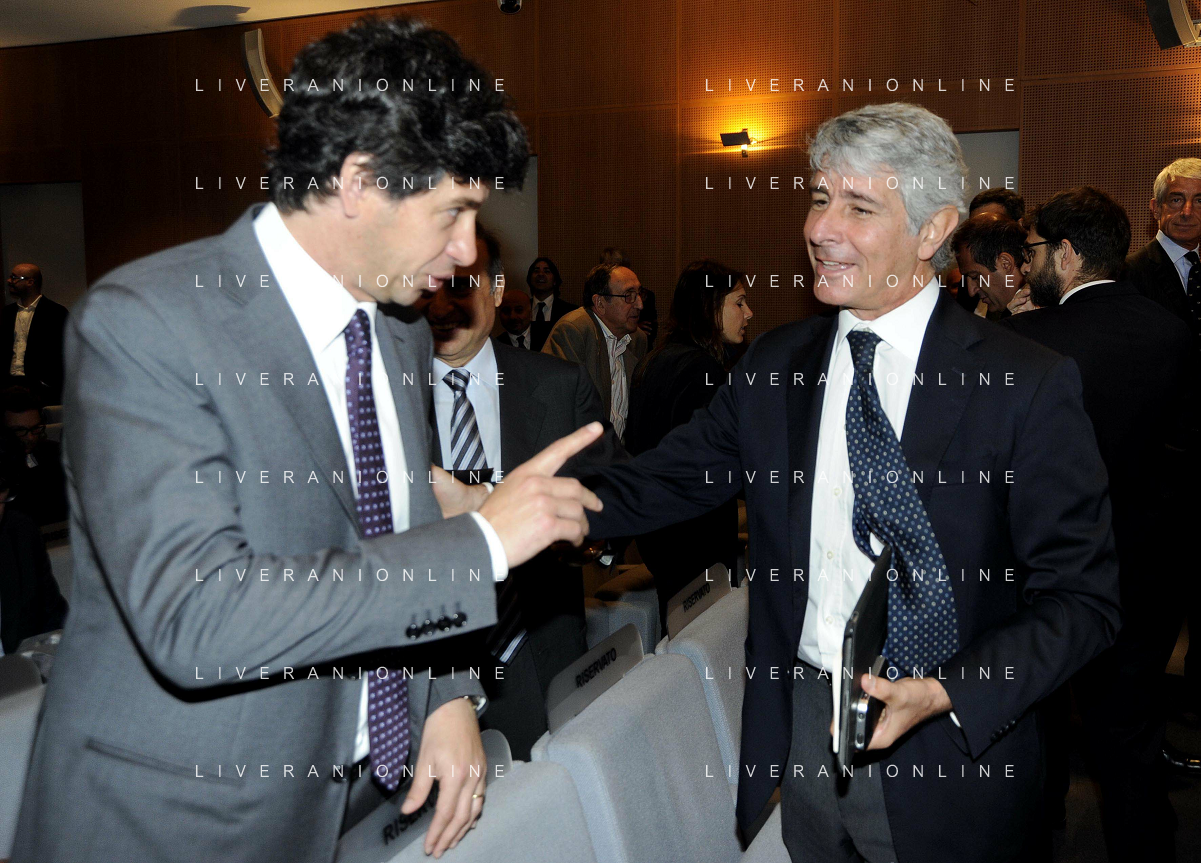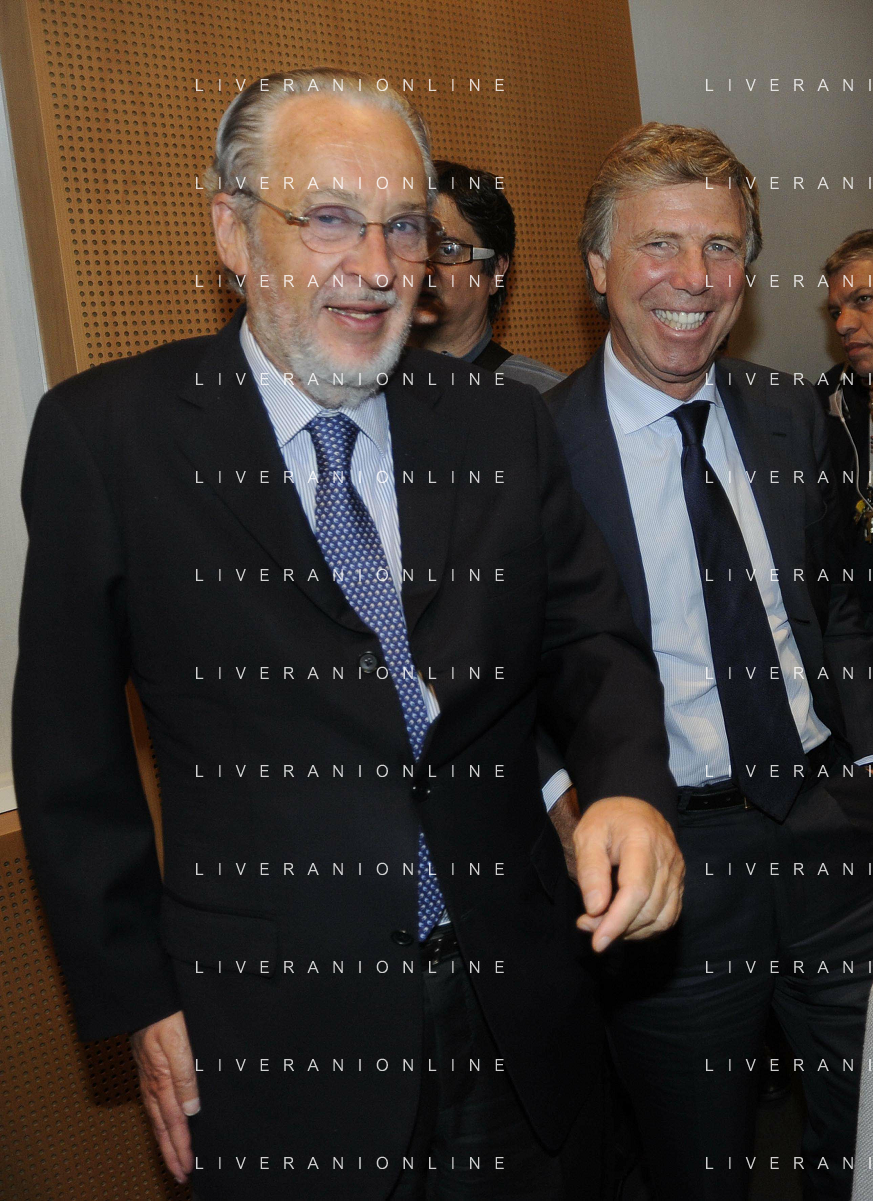 MILANO 20/5/2013 SALA BUZZATI VIA BALZAN, 3 CONVEGNO DELLA GAZZETTA DELLO SPORT: 'IL CALCIO CHE VOGLIAMO' NELLA FOTO GIANPAOLO POZZO ED ENRICO PREZIOSI FOTO ROMANO/AG ALDO LIVERANI S.A.S.