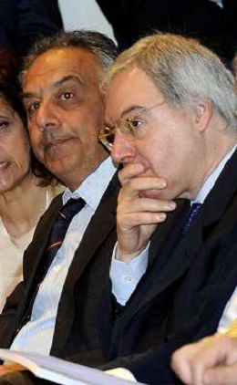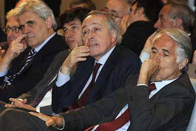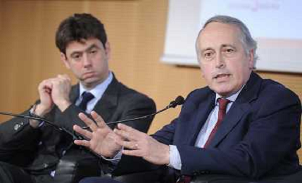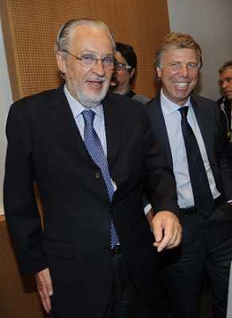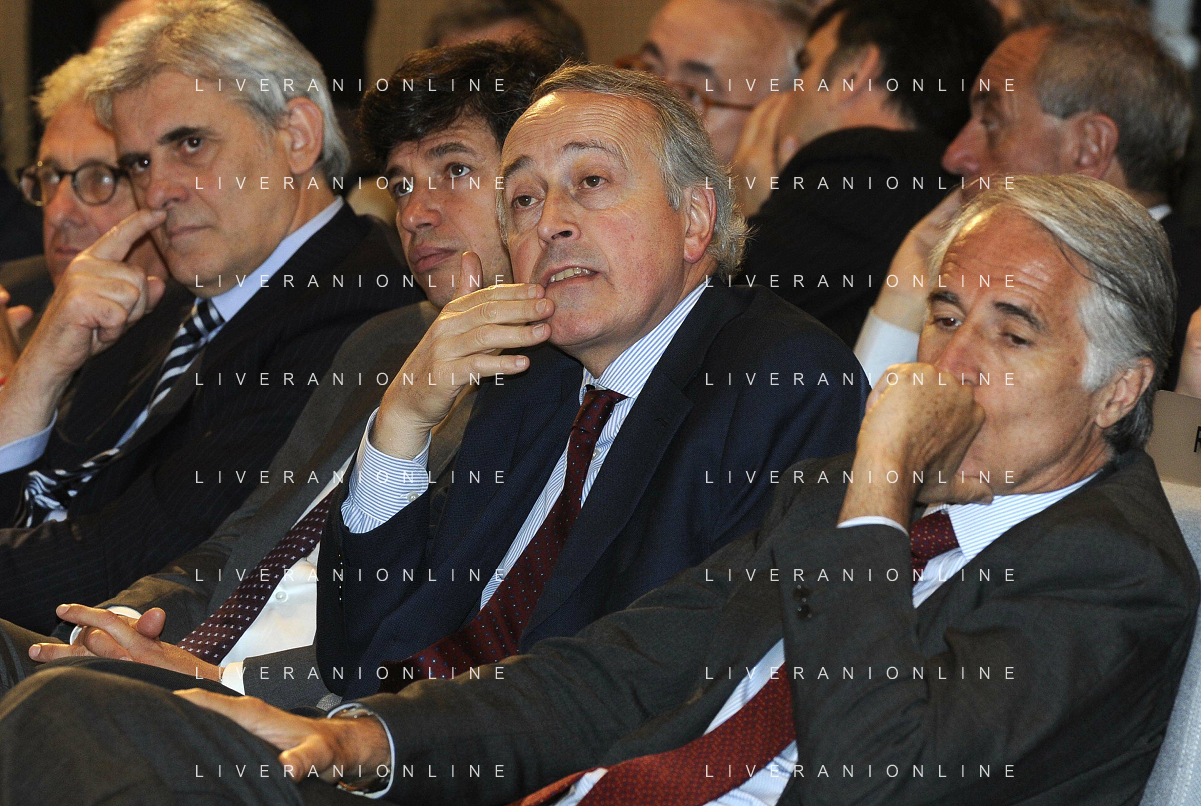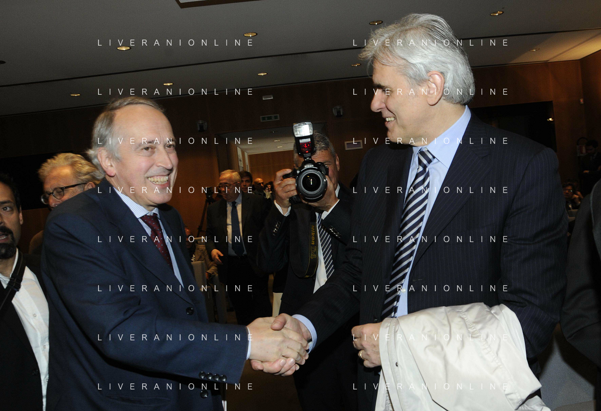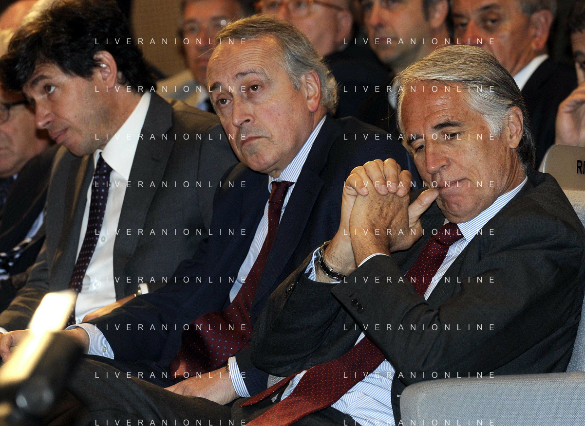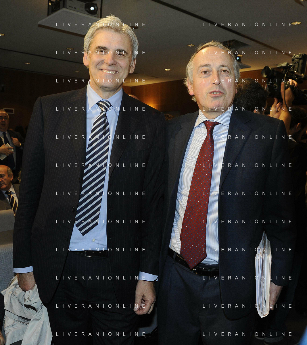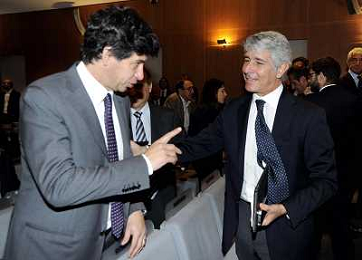 MILANO 20/5/2013 SALA BUZZATI VIA BALZAN, 3 CONVEGNO DELLA GAZZETTA DELLO SPORT: 'IL CALCIO CHE VOGLIAMO' NELLA FOTO GIANPAOLO POZZO ED ENRICO PREZIOSI FOTO ROMANO/AG ALDO LIVERANI S.A.S.
