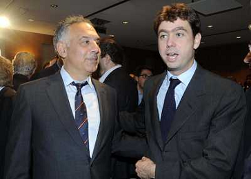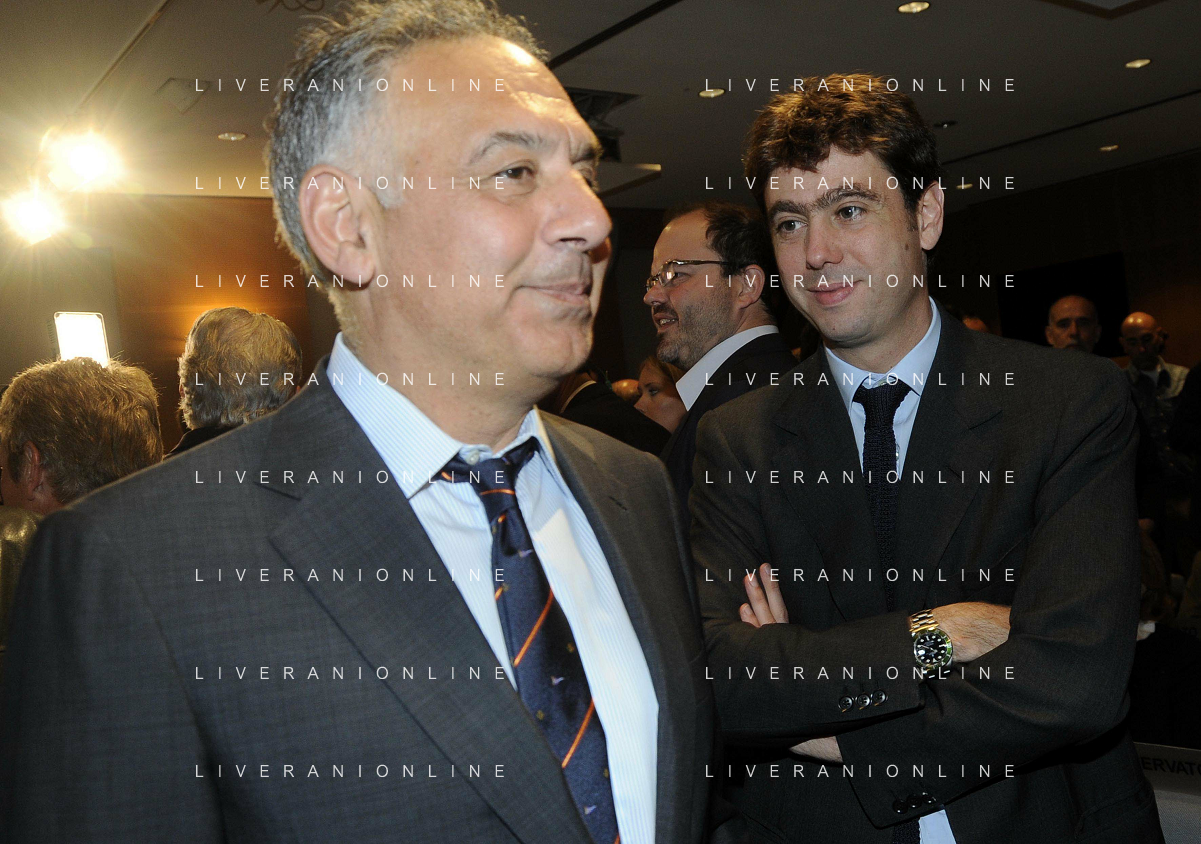 MILANO 20/5/2013 SALA BUZZATI VIA BALZAN, 3 CONVEGNO DELLA GAZZETTA DELLO SPORT: 'IL CALCIO CHE VOGLIAMO' NELLA FOTO JAMES PALLOTTA ED ANDREA AGNELLI FOTO ROMANO/AG ALDO LIVERANI S.A.S.