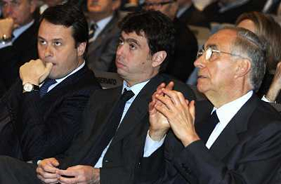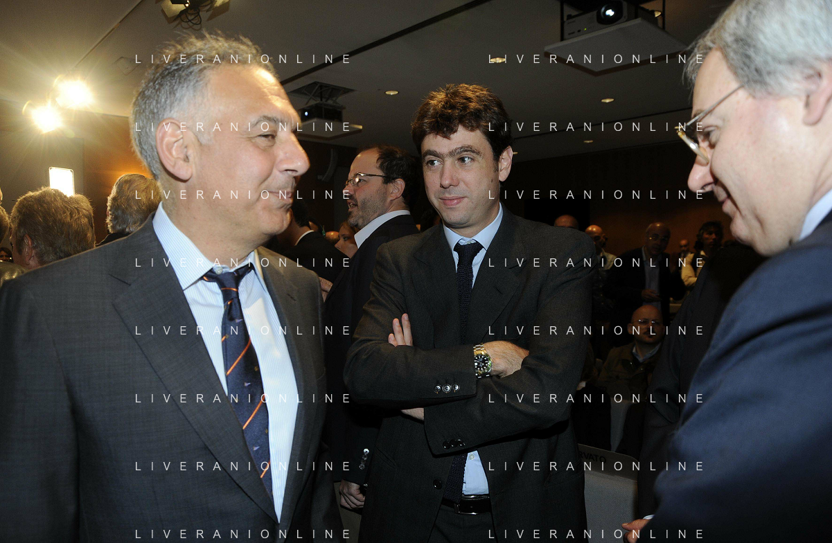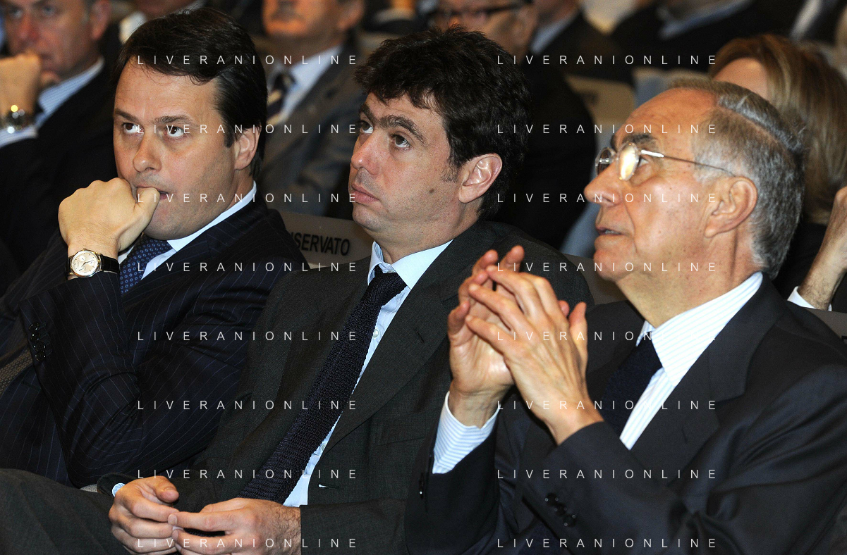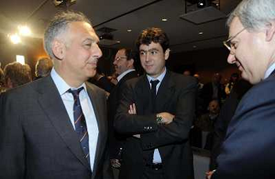 MILANO 20/5/2013 SALA BUZZATI VIA BALZAN, 3 CONVEGNO DELLA GAZZETTA DELLO SPORT: 'IL CALCIO CHE VOGLIAMO' NELLA FOTO PIETRO SCOTT JOVANE, ANDREA AGNELLI E GIANCARLO ABETE FOTO ROMANO/AG ALDO LIVERANI S.A.S.