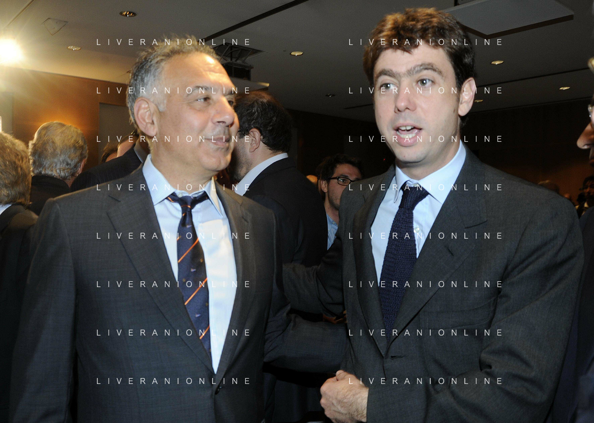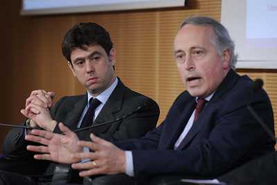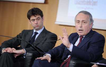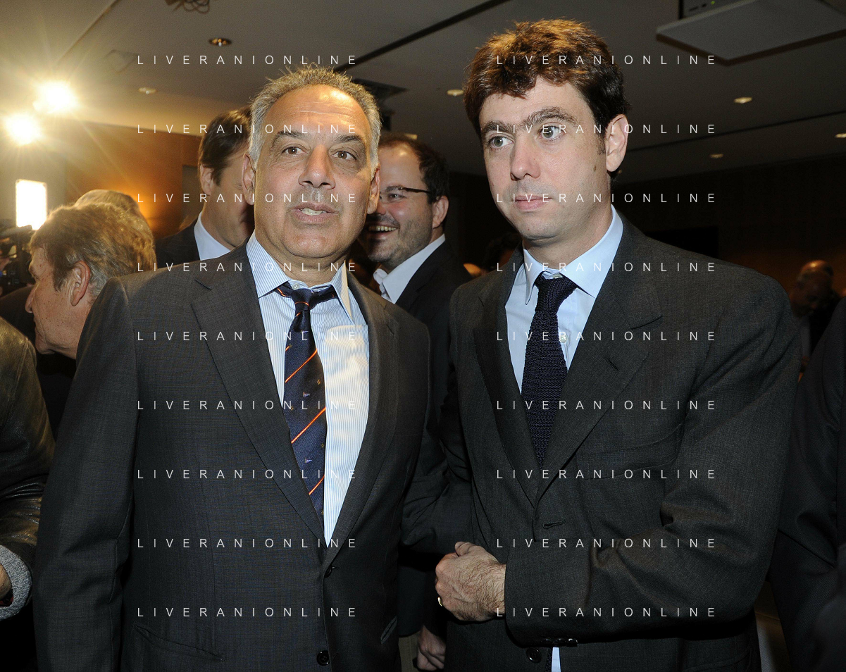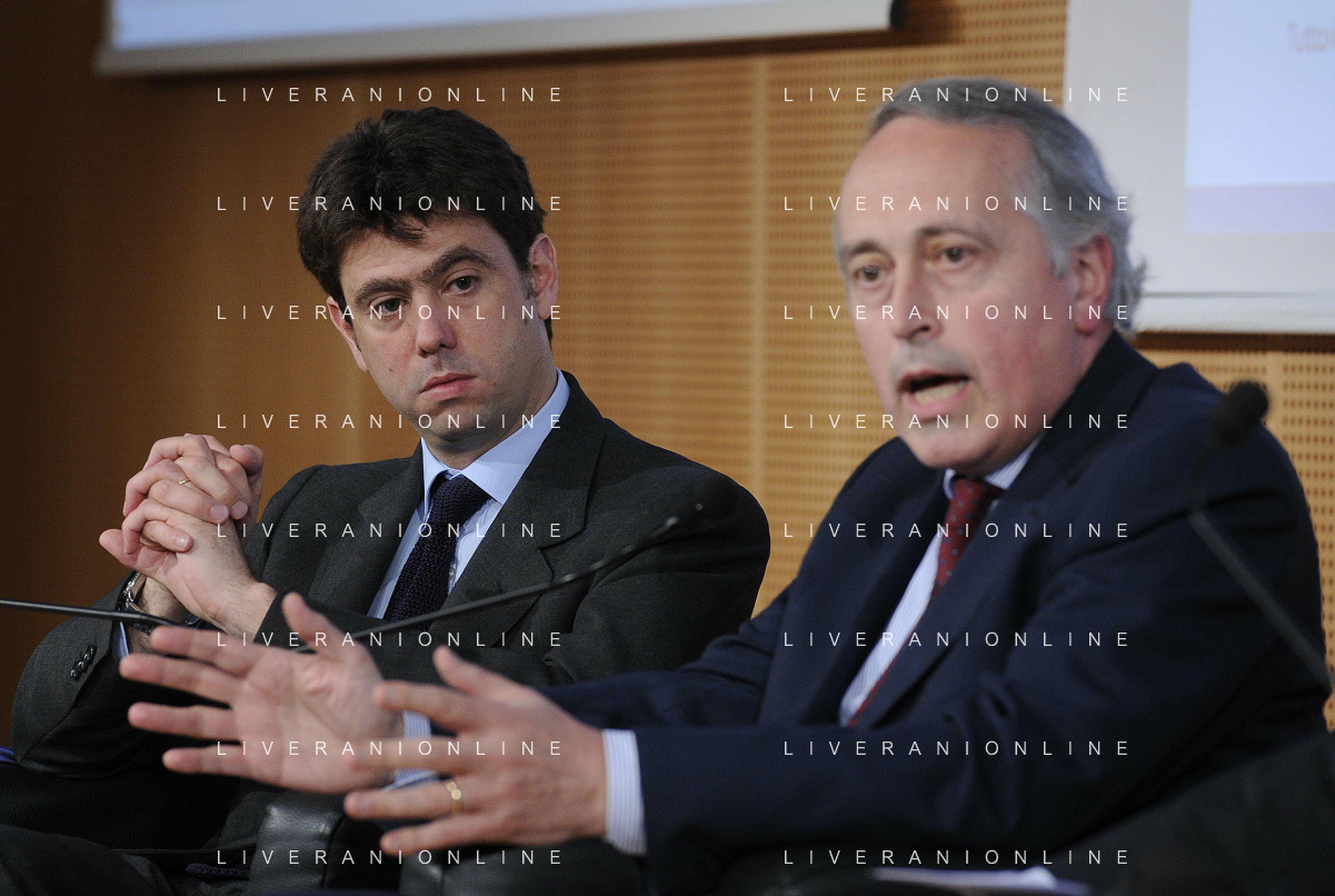MILANO 20/5/2013 SALA BUZZATI VIA BALZAN, 3 CONVEGNO DELLA GAZZETTA DELLO SPORT: 'IL CALCIO CHE VOGLIAMO' NELLA FOTO GIANCARLO ABETE ED ANDREA AGNELLI FOTO ROMANO/AG ALDO LIVERANI S.A.S.