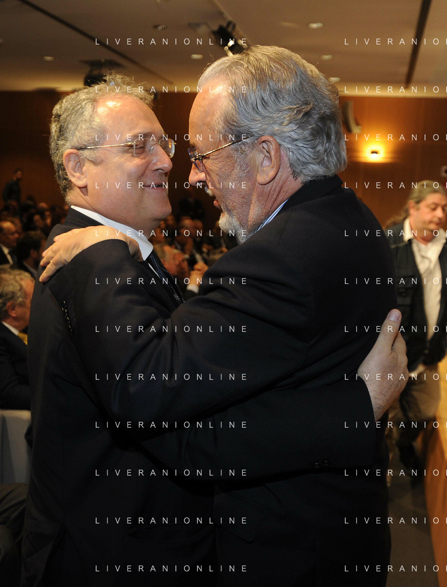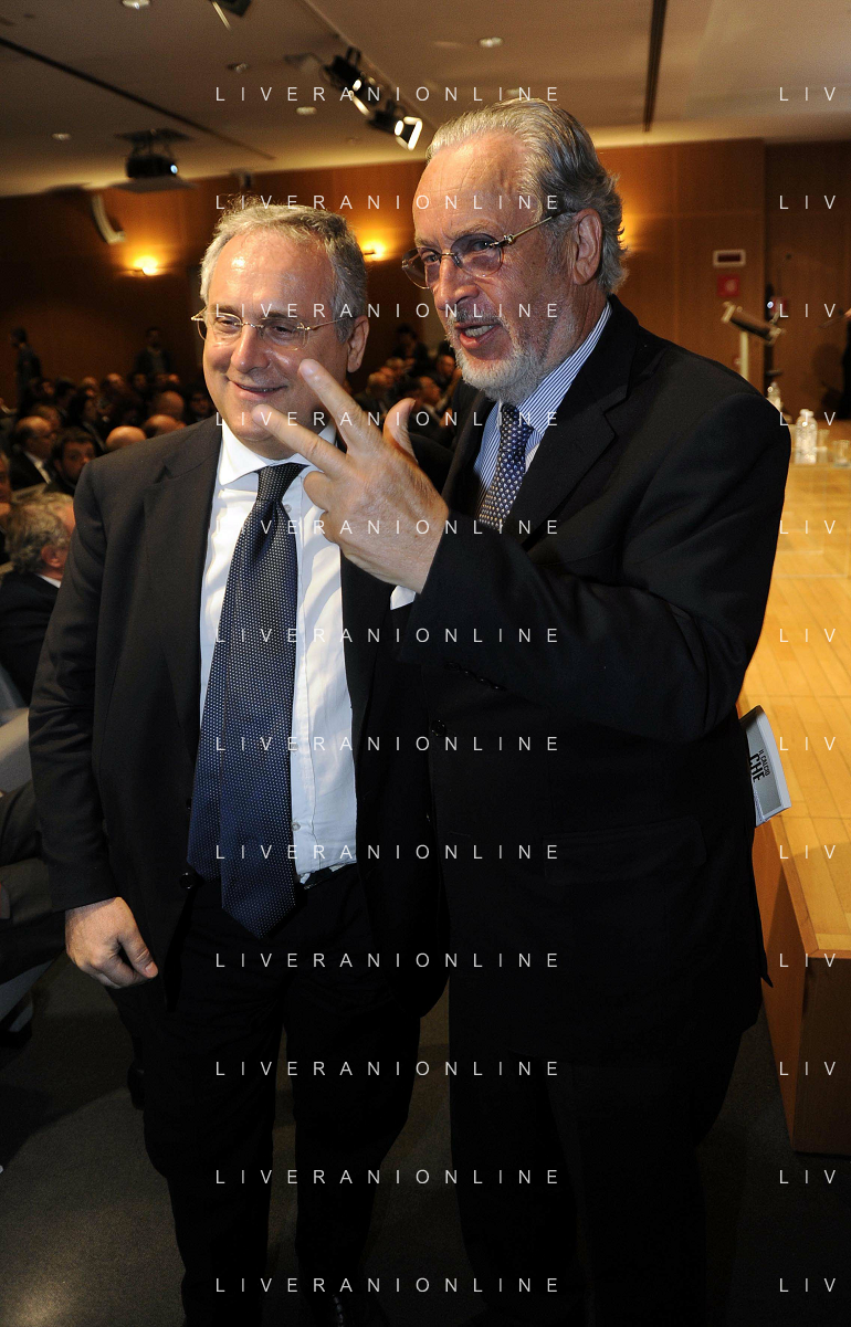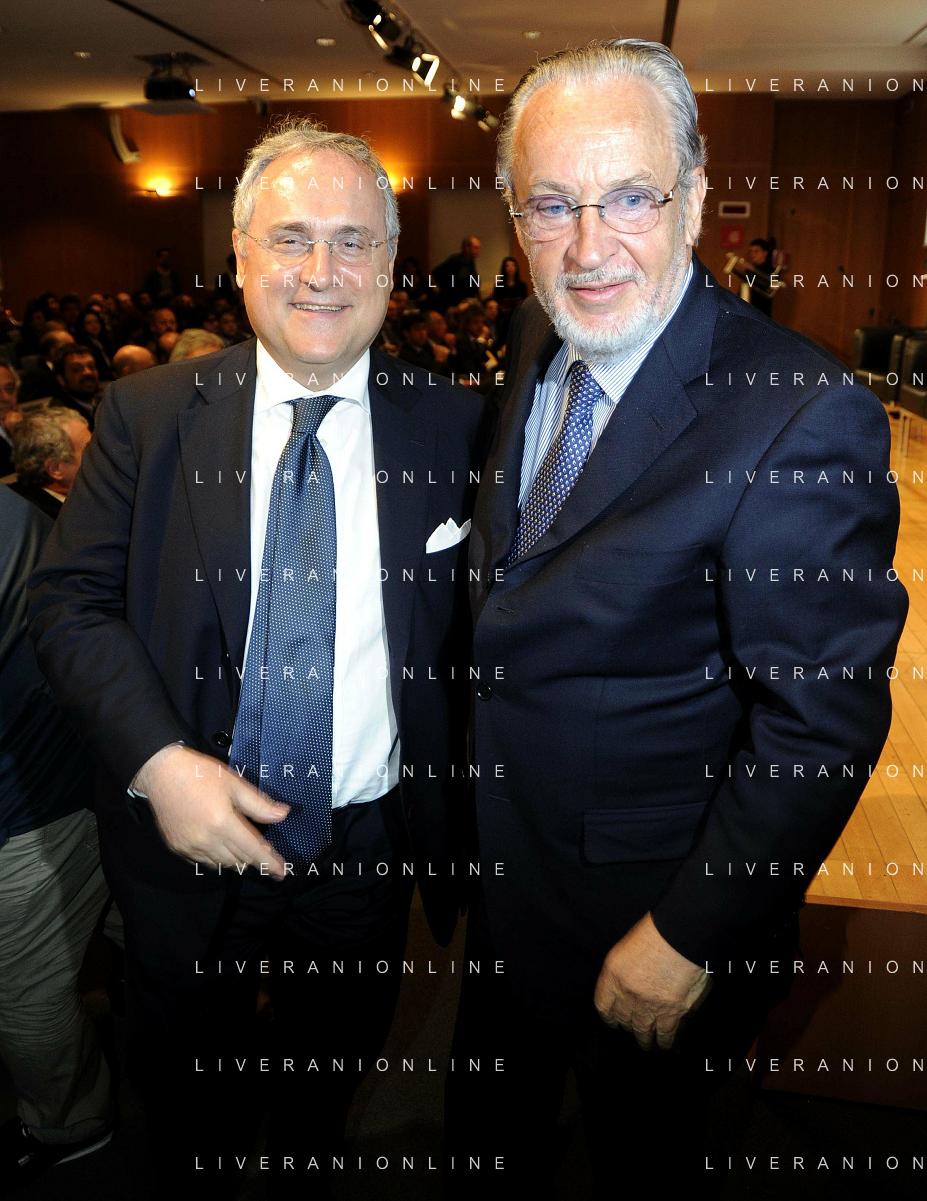 MILANO 20/5/2013 SALA BUZZATI VIA BALZAN, 3 CONVEGNO DELLA GAZZETTA DELLO SPORT: 'IL CALCIO CHE VOGLIAMO' NELLA FOTO CLAUDIO LOTITO E GIANPAOLO POZZO FOTO ROMANO/AG ALDO LIVERANI S.A.S.
