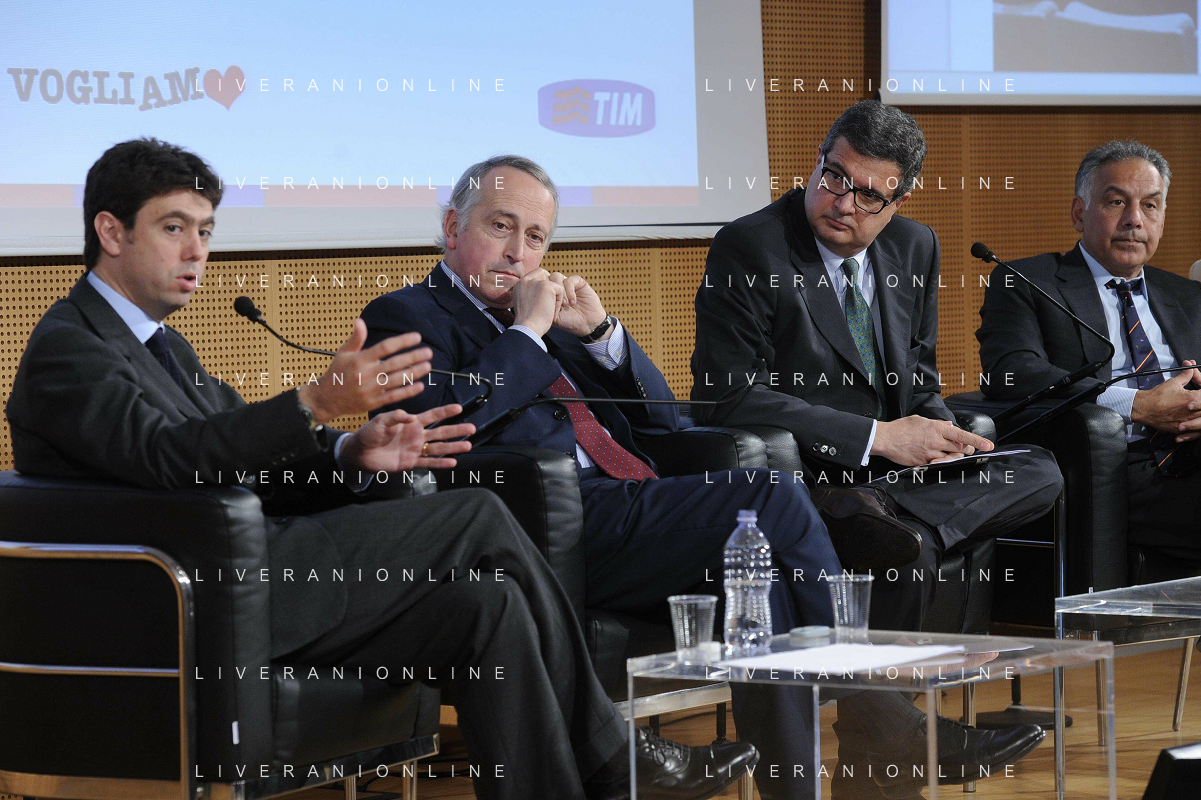 MILANO 20/5/2013 SALA BUZZATI VIA BALZAN, 3 CONVEGNO DELLA GAZZETTA DELLO SPORT: 'IL CALCIO CHE VOGLIAMO' NELLA FOTOMARCELLO NICCHI, DEMETRIO ALBERTINI, GIANCARLO ABETE E GIOVANNI MALAGO' FOTO ROMANO/AG ALDO LIVERANI S.A.S.