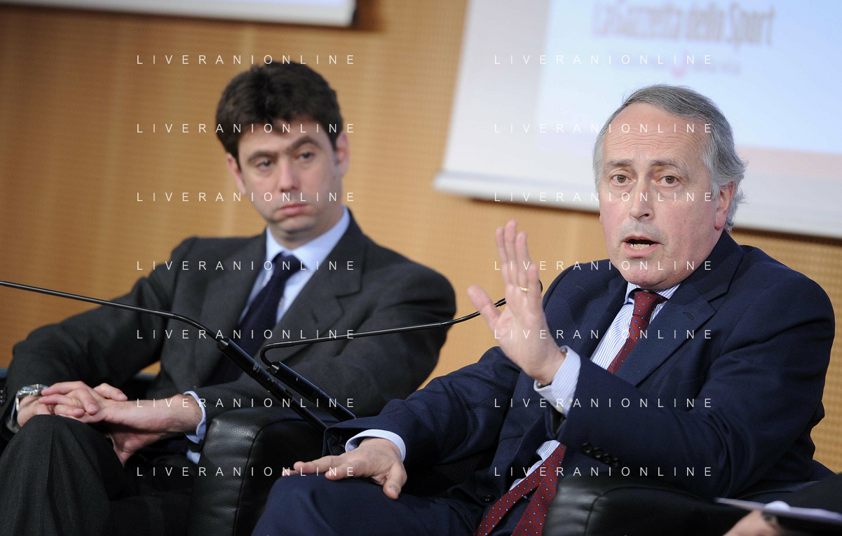MILANO 20/5/2013 SALA BUZZATI VIA BALZAN, 3 CONVEGNO DELLA GAZZETTA DELLO SPORT: 'IL CALCIO CHE VOGLIAMO' NELLA FOTO GIAMPAOLO POZZO E MARCELLO NICCHI FOTO ROMANO/AG ALDO LIVERANI S.A.S.