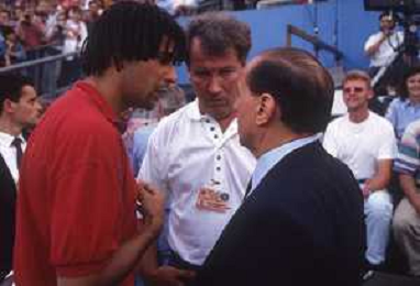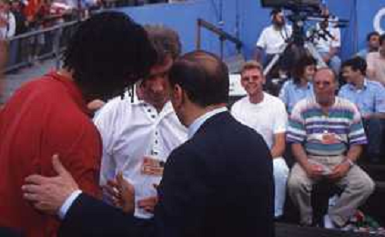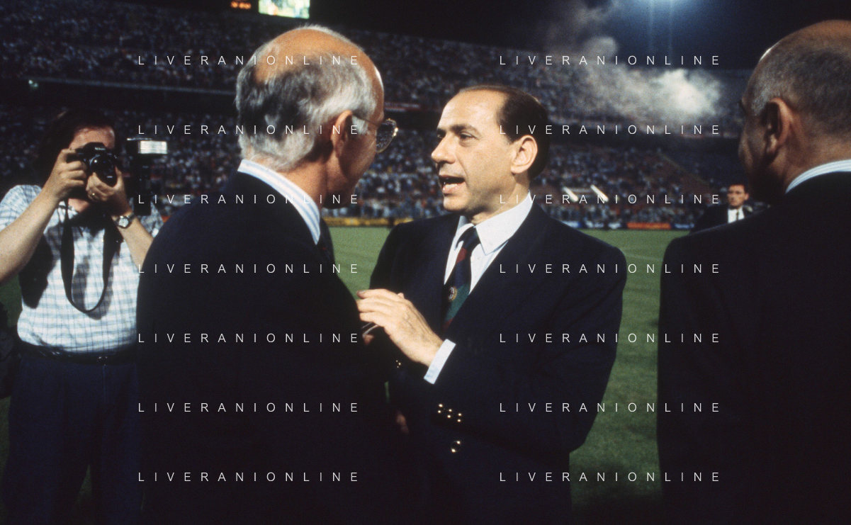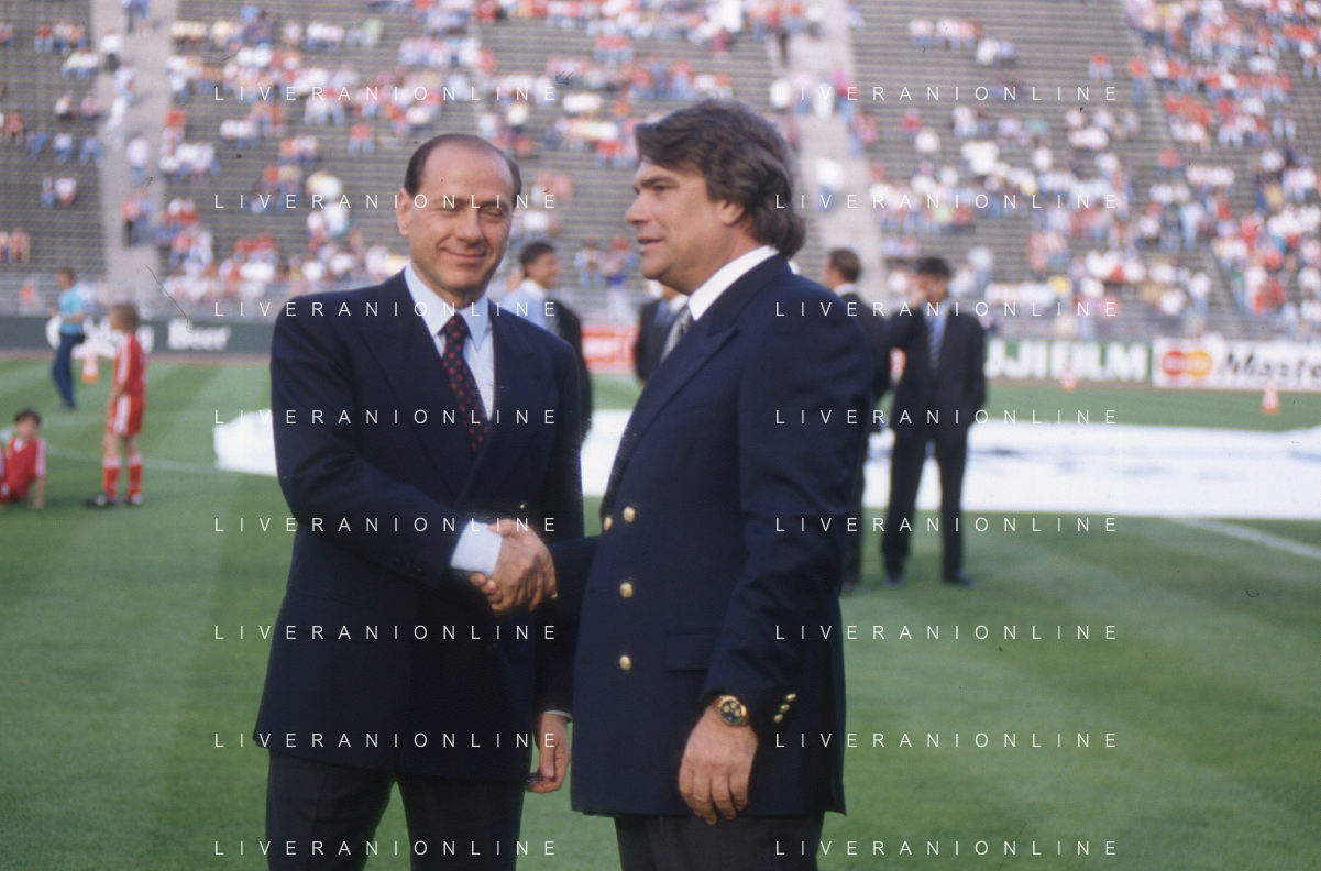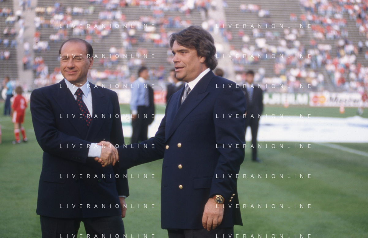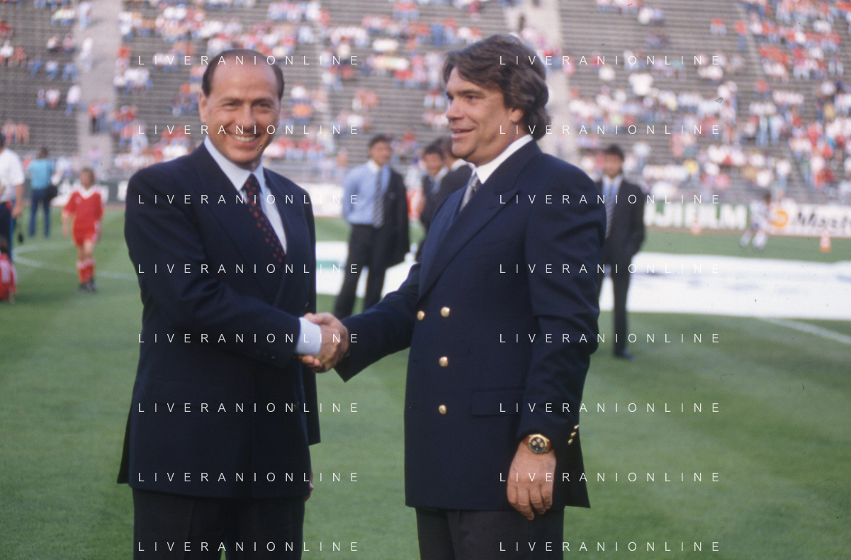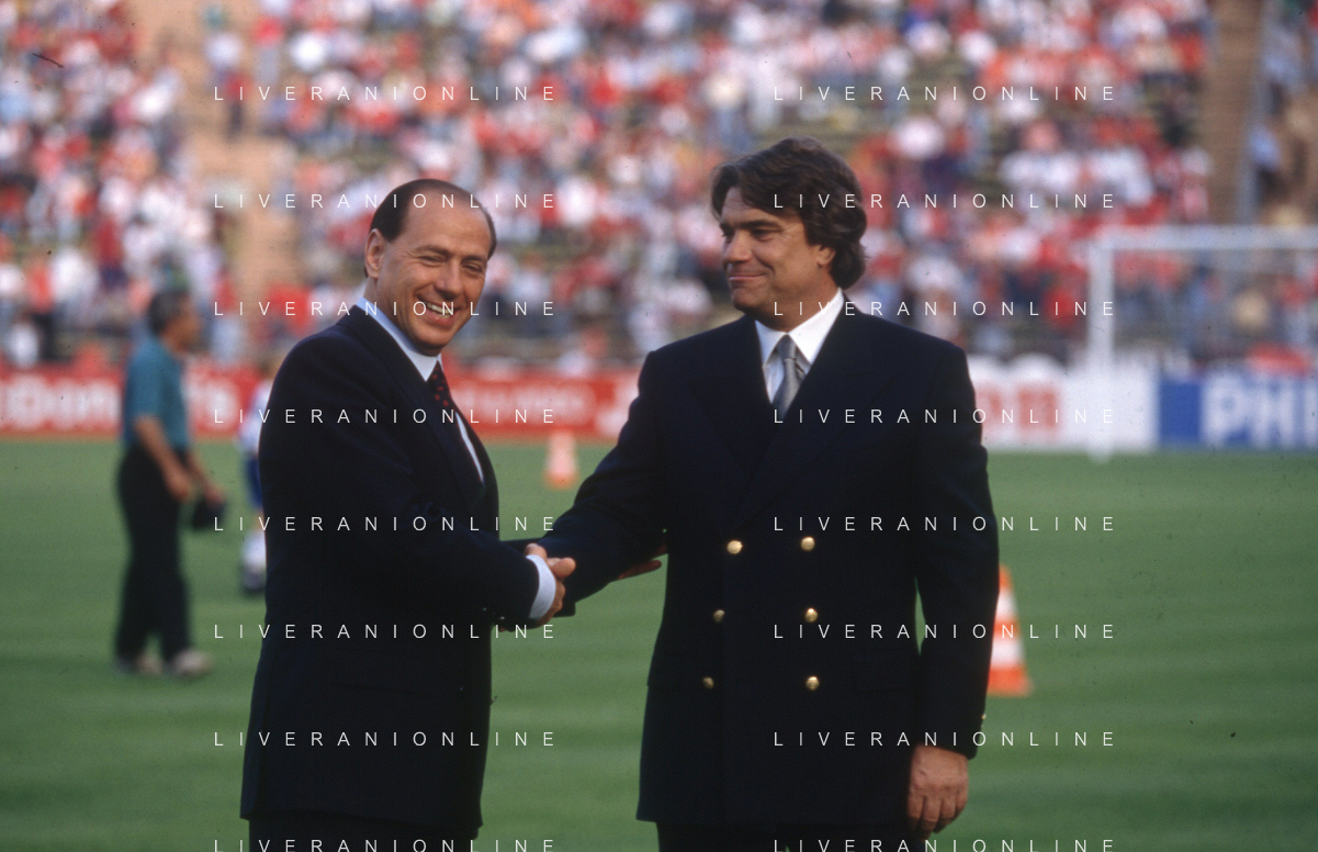 DIAP-RETROSPETTIVA SILVIO BERLUSCONI PRESIDENTE DEL MILAN CALCIO E POLITICO NELLA FOTO SILVIO BERLUSCONI NELL'ANNO 1992-1993 CON BERNARD TAPIE AG ALDO LIVERANI SAS