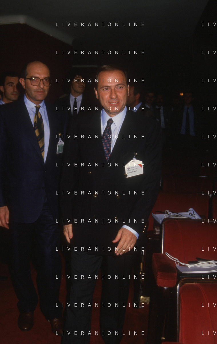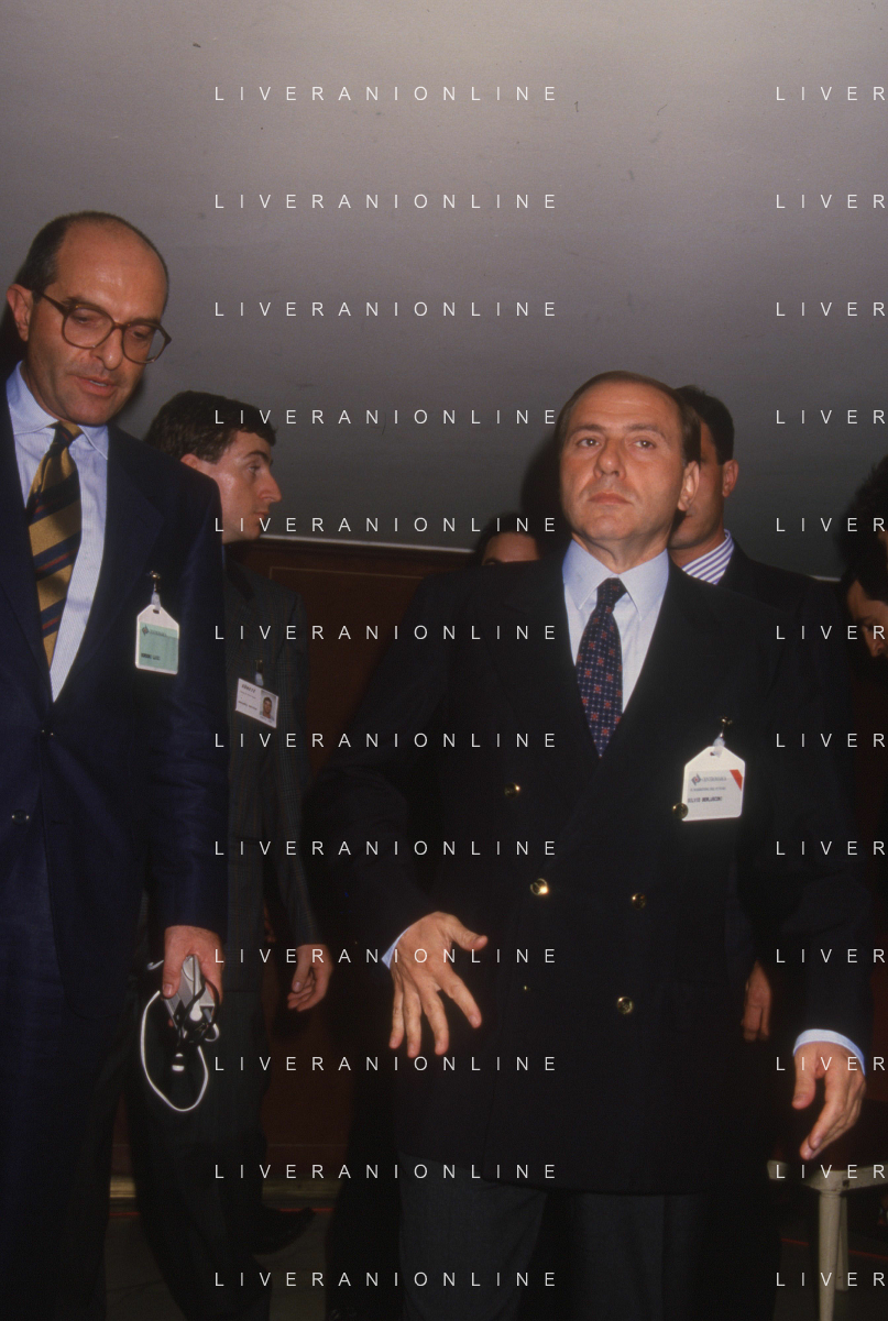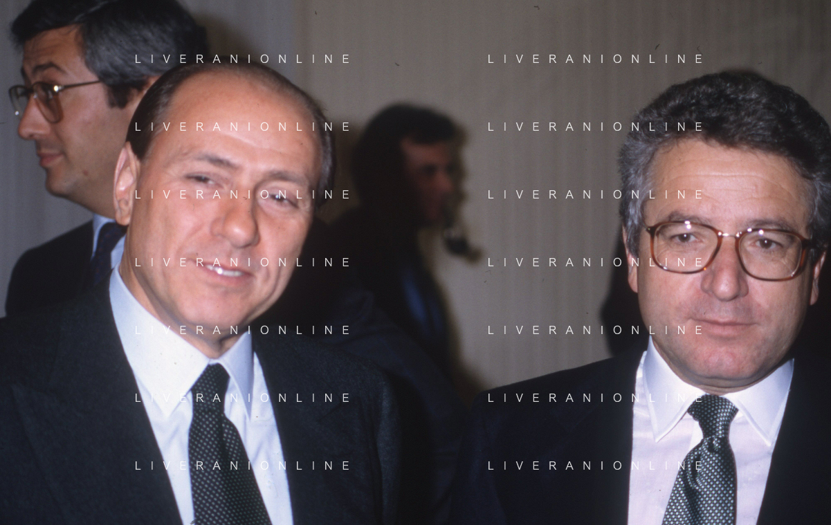 DIAP-RETROSPETTIVA SILVIO BERLUSCONI PRESIDENTE DEL MILAN CALCIO E POLITICO NELLA FOTO SILVIO BERLUSCONI NELL'ANNO 1992-1993 A MILANO CON ANTONIO MATARRESE AG ALDO LIVERANI SAS