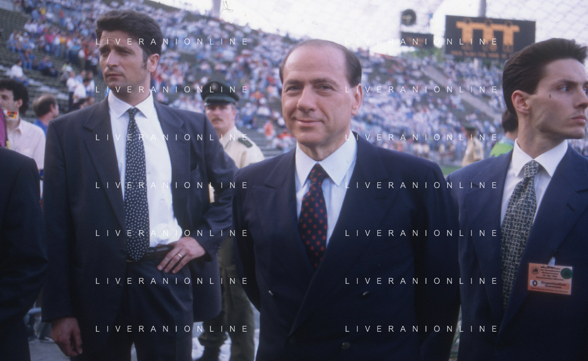 DIAP-RETROSPETTIVA SILVIO BERLUSCONI PRESIDENTE DEL MILAN CALCIO E POLITICO NELLA FOTO SILVIO BERLUSCONI NELL'ANNO 1992-1993 A MILANO CON GALLIANI E ARRIGO SACCHI AG ALDO LIVERANI SAS