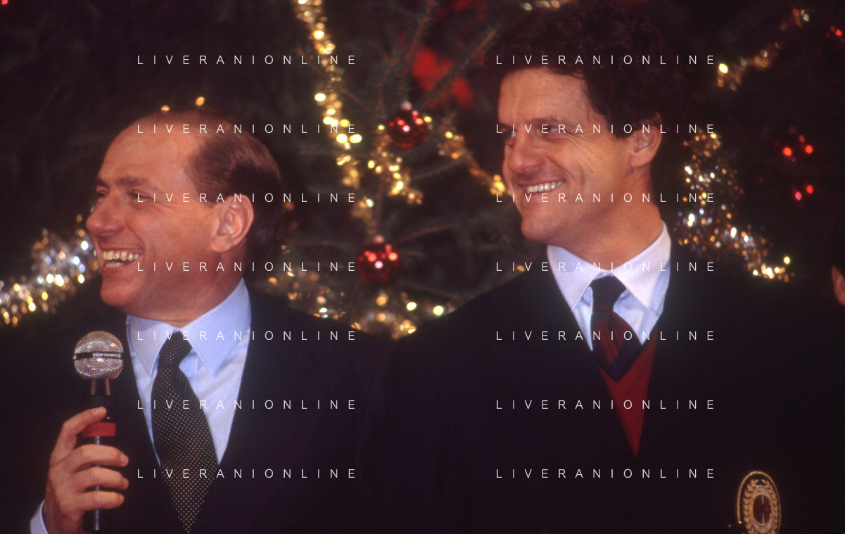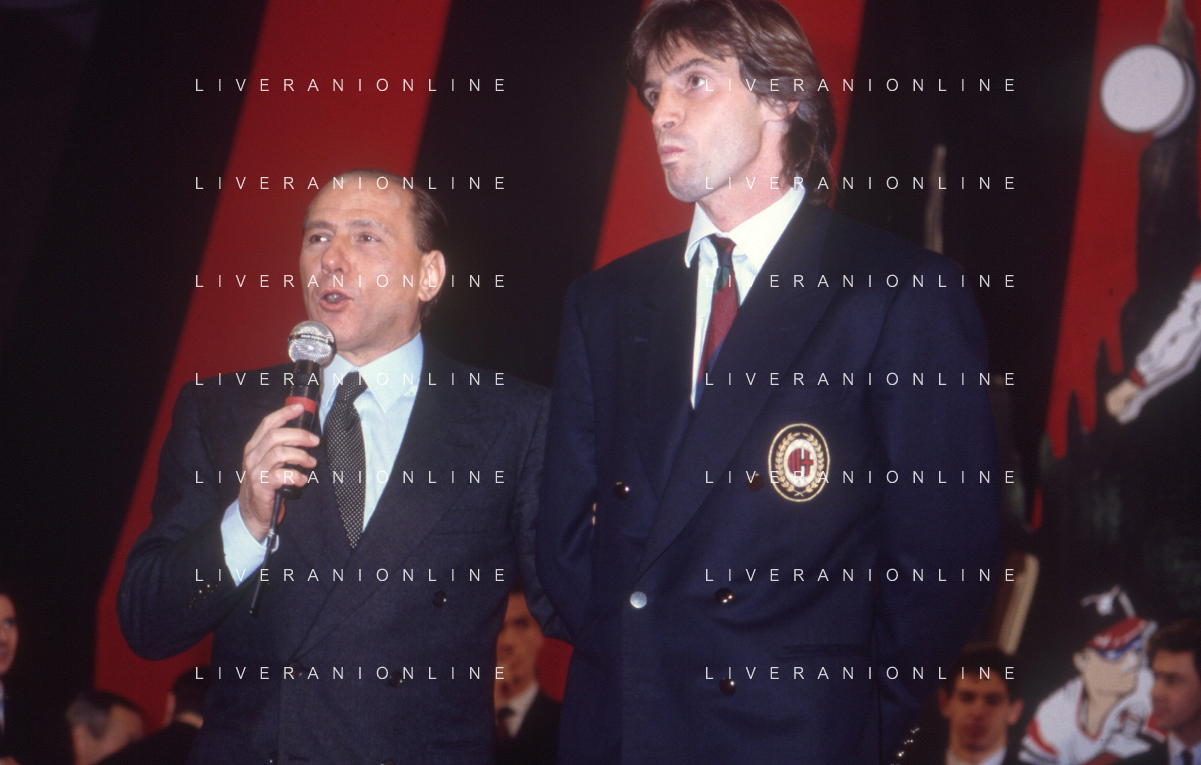 DIAP-RETROSPETTIVA SILVIO BERLUSCONI PRESIDENTE DEL MILAN CALCIO E POLITICO NELLA FOTO SILVIO BERLUSCONI NELL'ANNO 1992-1993 A MILANO CON DEMETRIO ALBERTINI AG ALDO LIVERANI SAS