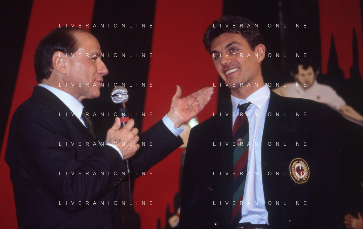 DIAP-RETROSPETTIVA SILVIO BERLUSCONI PRESIDENTE DEL MILAN CALCIO E POLITICO NELLA FOTO SILVIO BERLUSCONI NELL'ANNO 1992-1993 A MILANO CON PAOLO MALDINI AG ALDO LIVERANI SAS