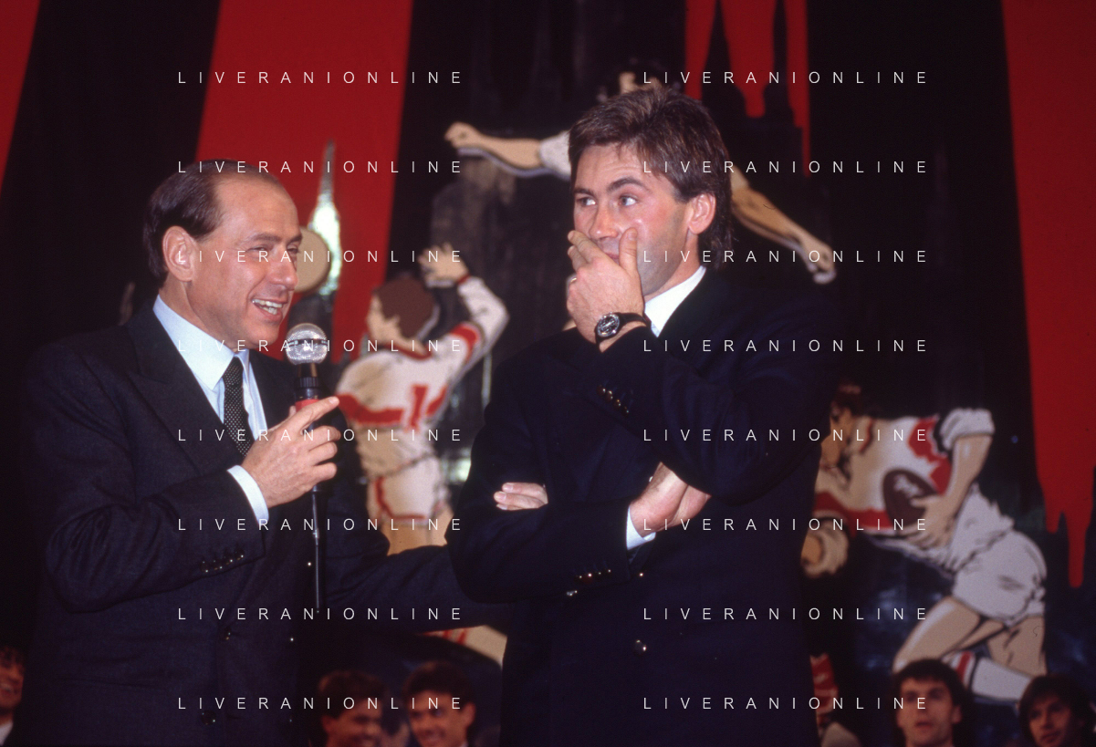 DIAP-RETROSPETTIVA SILVIO BERLUSCONI PRESIDENTE DEL MILAN CALCIO E POLITICO NELLA FOTO SILVIO BERLUSCONI NELL'ANNO 1992-1993 A MILANO CON CARLO ANCELOTTI AG ALDO LIVERANI SAS
