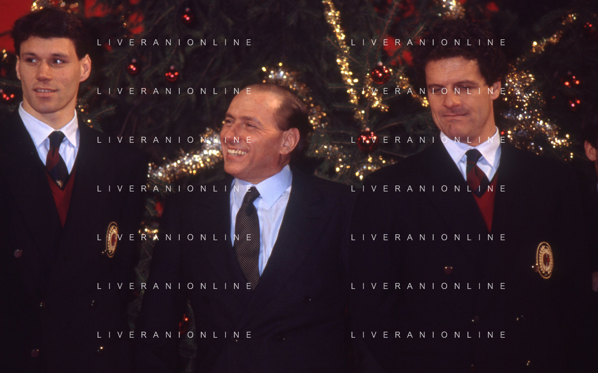 DIAP-RETROSPETTIVA SILVIO BERLUSCONI PRESIDENTE DEL MILAN CALCIO E POLITICO NELLA FOTO SILVIO BERLUSCONI NELL'ANNO 1992-1993 A MILANO CON MARCO VAN BASTEN E FABIO CAPELLO AG ALDO LIVERANI SAS