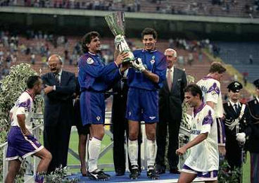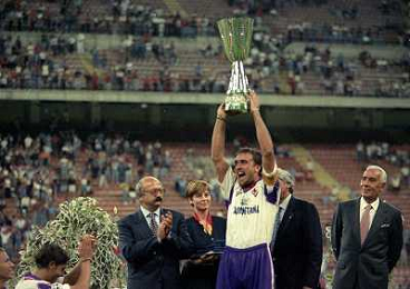 MILANO 25-08-1996 SUPERCOPPA ITALIANA MILAN FIORENTINA NELLA FOTO MANUEL RUI COSTA E GABRIEL BATISTUTA E SANDRO COIS CON LA SUPERCOPPA ITALIANA AG ALDO LIVERANI SAS