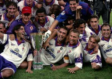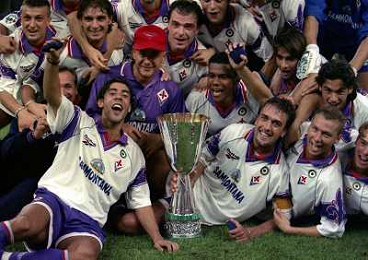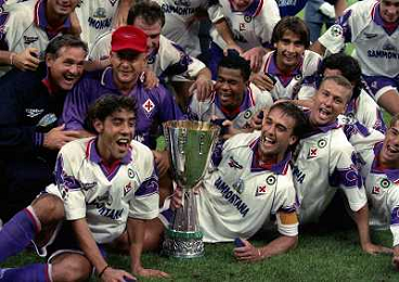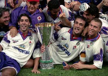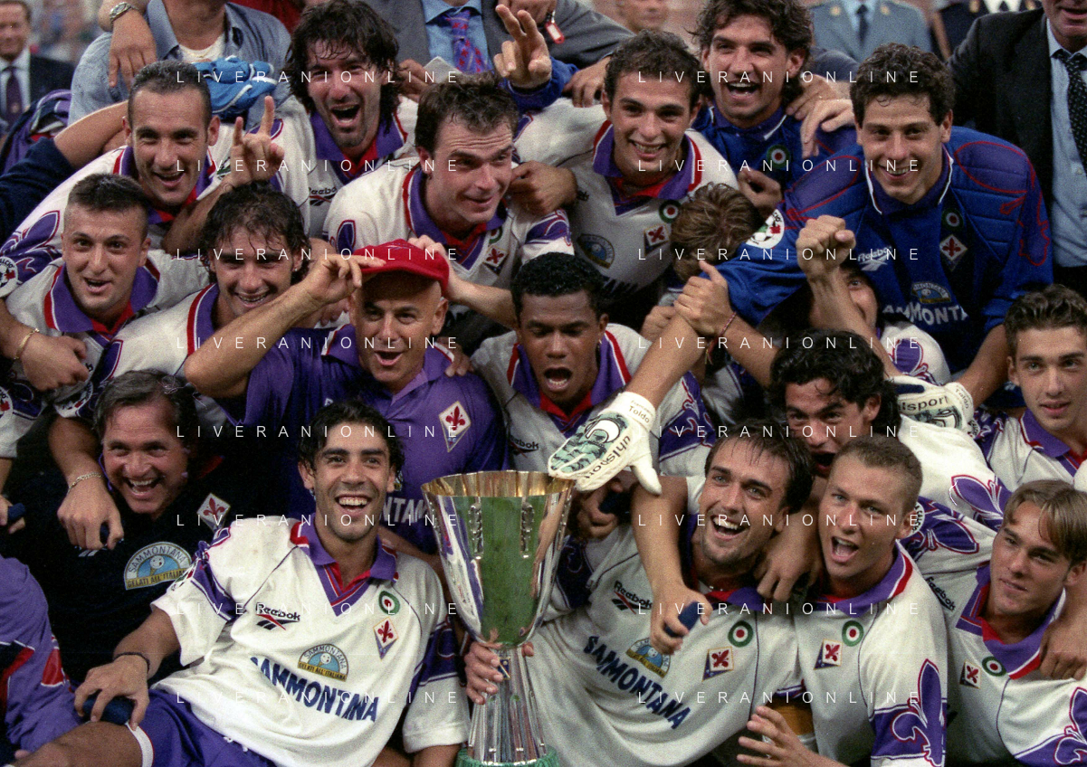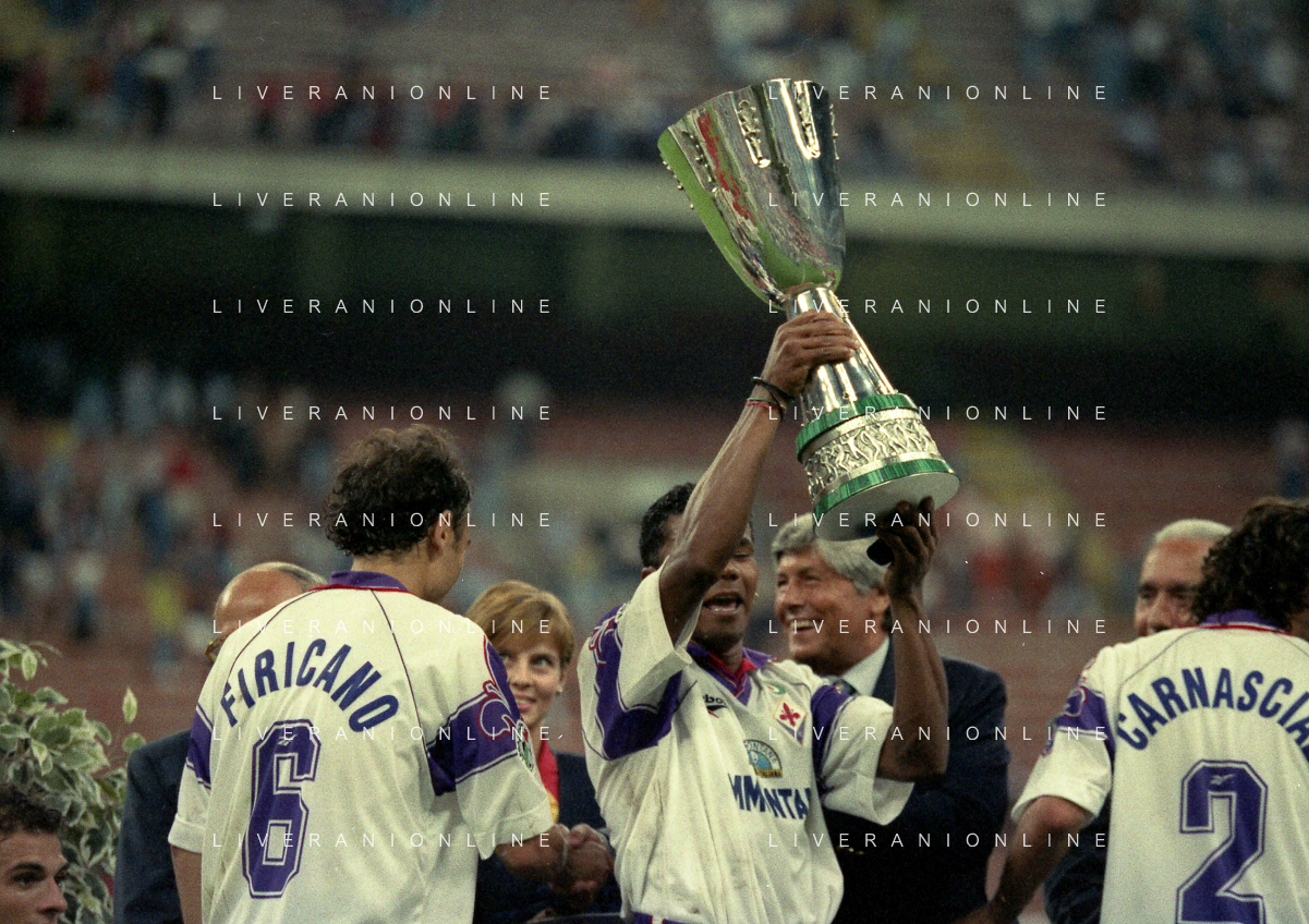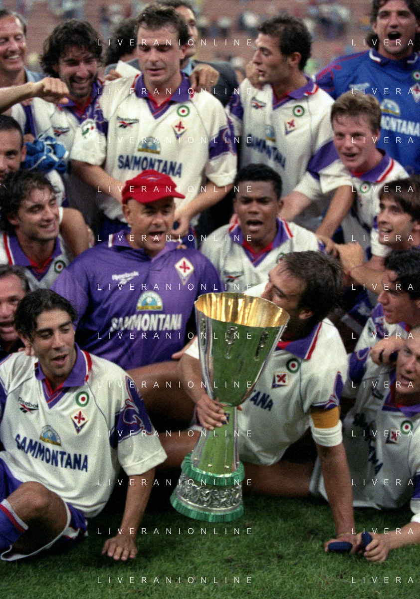 MILANO 25-08-1996 SUPERCOPPA ITALIANA MILAN FIORENTINA NELLA FOTO I GIOCATORI DELLA FIORENTINA CON LA SUPERCOPPA ITALIANA AG ALDO LIVERANI SAS