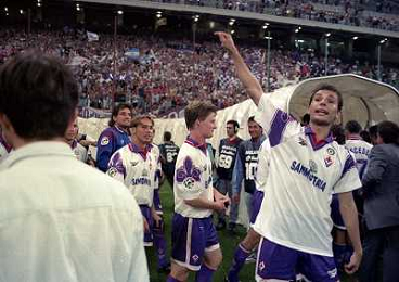 MILANO 25-08-1996 SUPERCOPPA ITALIANA MILAN FIORENTINA NELLA FOTO I GIOCATORI DELLA FIORENTINA FESTEGGIANO LA SUPERCOPPAITALIANA MANUEL RUI COSTA E GABRIEL BATISTUTA AG ALDO LIVERANI SAS