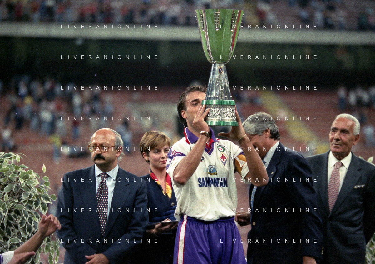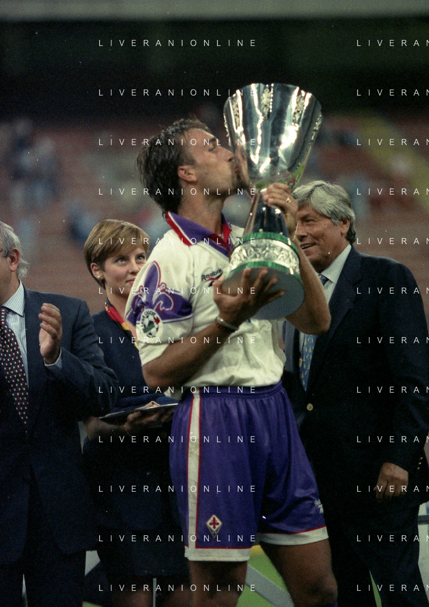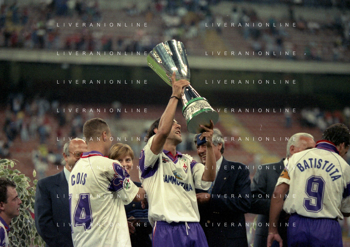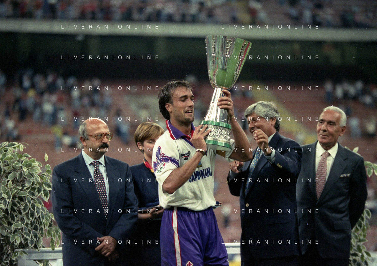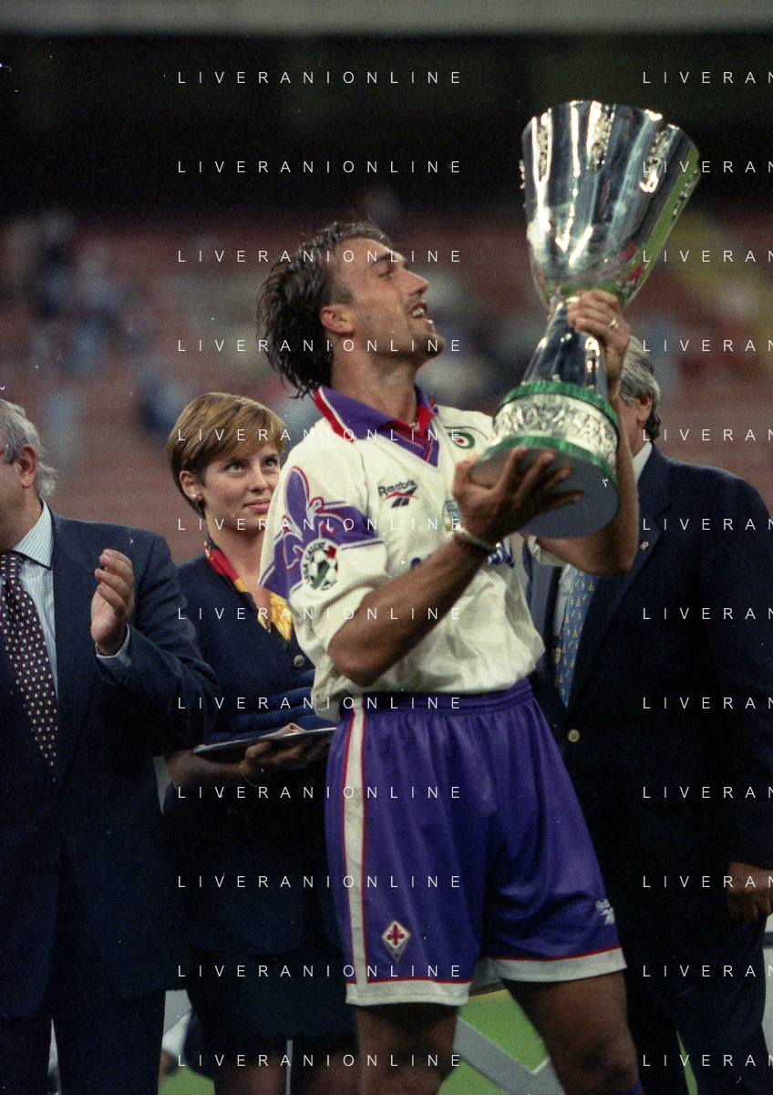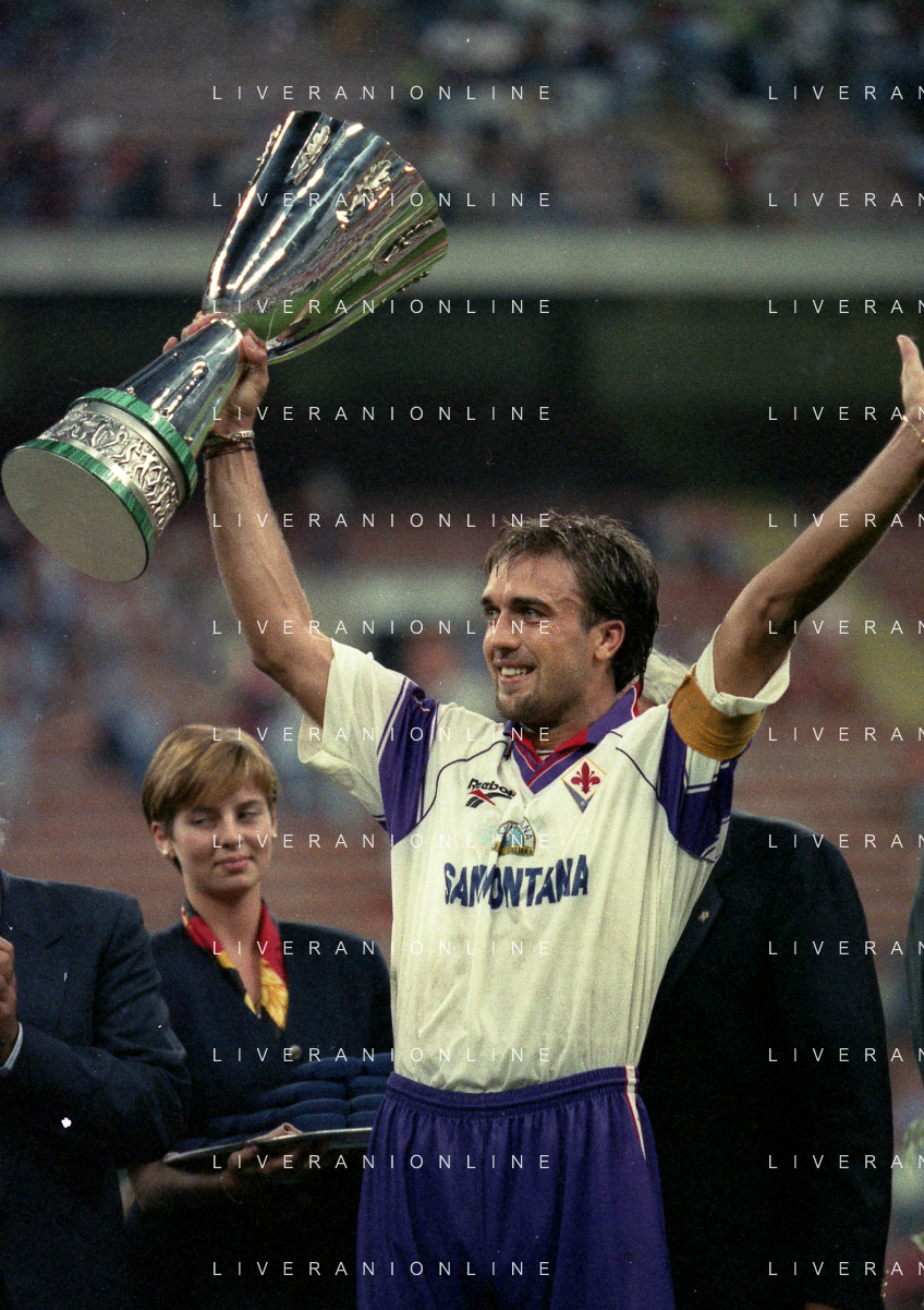 MILANO 25-08-1996 SUPERCOPPA ITALIANA MILAN FIORENTINA NELLA FOTO GABRIEL BATISTUTA CON LA SUPERCOPPA ITALIANA AG ALDO LIVERANI SAS