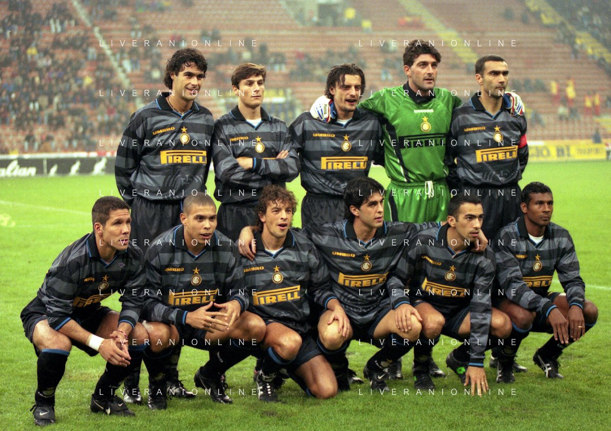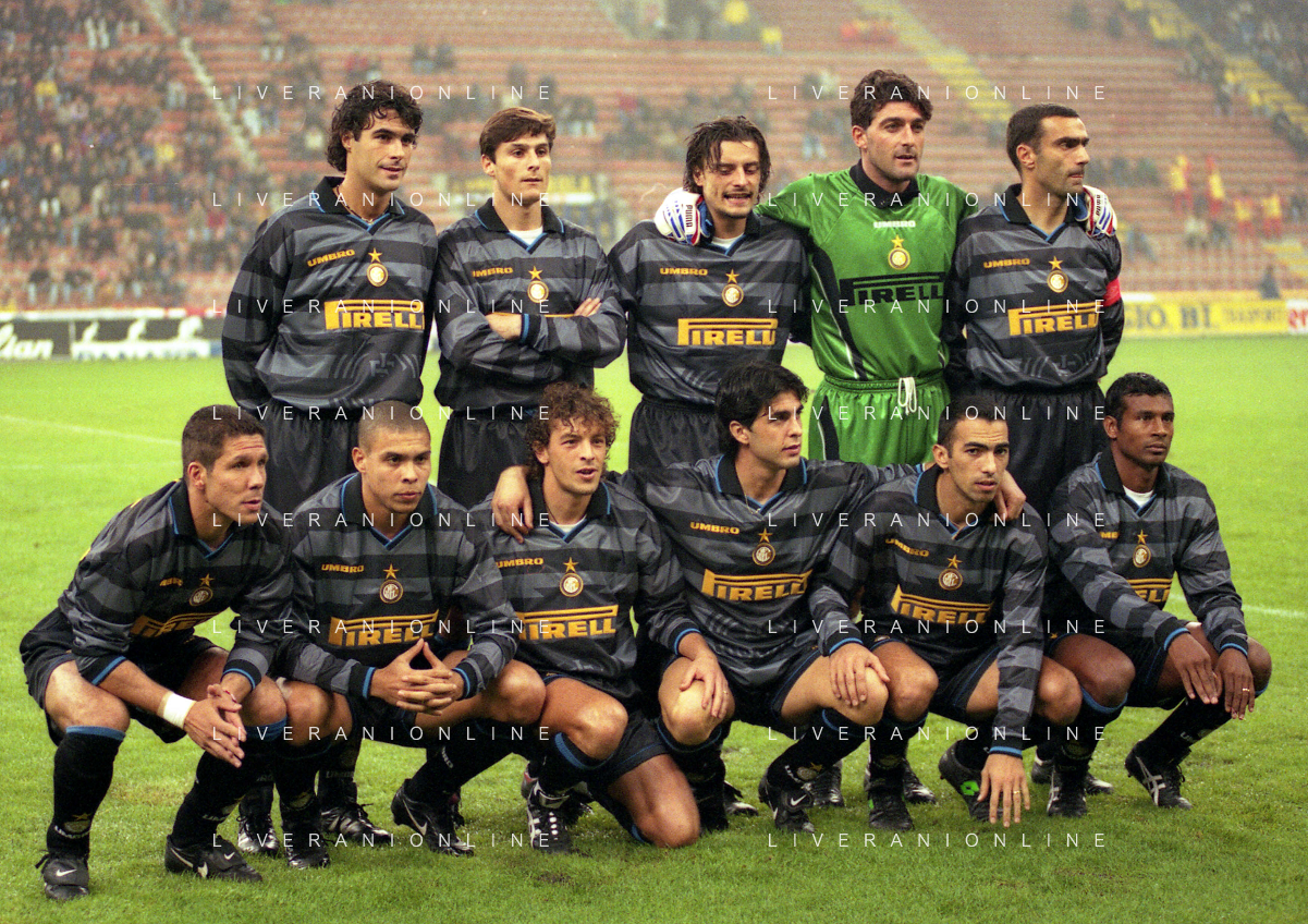 MILAN COPPA UEFA 21-10-1997 INTER OLYMPIC LIONE NELLA FOTO FABIO GALANTE-JAVIER ZANETTI-LUIGI SARTOR-GIANLUCA PAGLIUCA-GIUSEPPE BERGOMI SOTTO DIEGO SIMEONE-RONALDO-FRANCESCO MORIERO-SALVATORE FRESI-YOURY DJORKAEFF ARON WINTER AG ALDO LIVERANI SAS