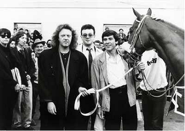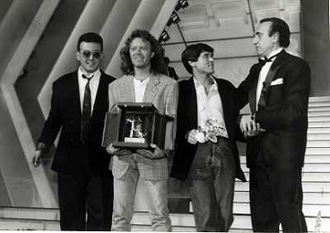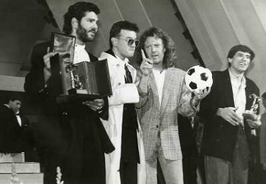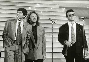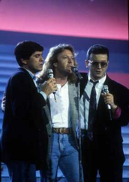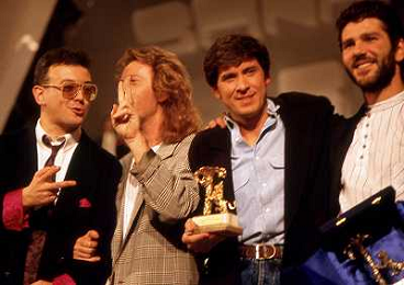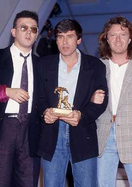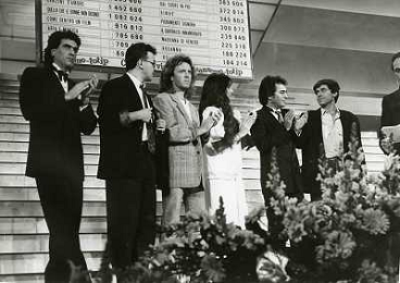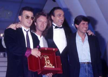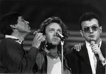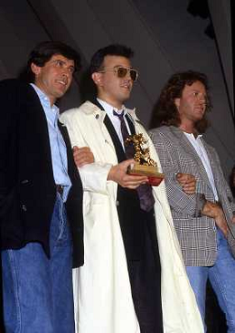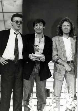 Teatro Ariston di Sanremo 37mo Festival della Canzone Italiana - 1987 nella foto Enrico Ruggeri, Umberto Tozzi e Gianni Morandi vincitori con la canzone ' Si pu÷ dare di piu' ' e Michele Zarrillo vincitore nuove proposte con 'La notte dei pensieri' ©Agenzia Aldo Liverani Sas