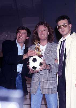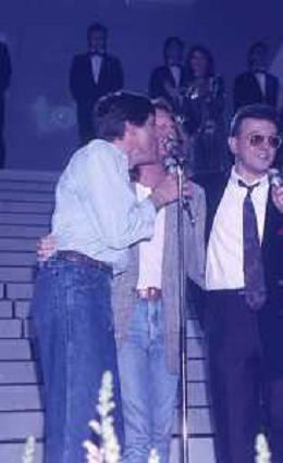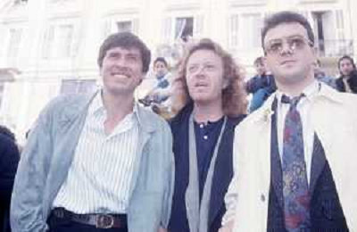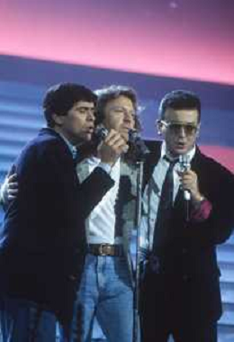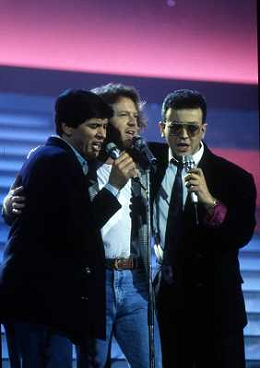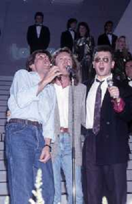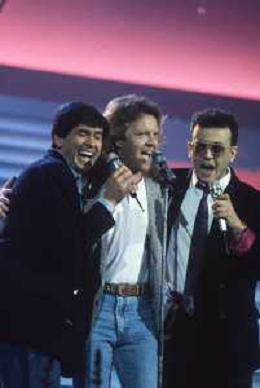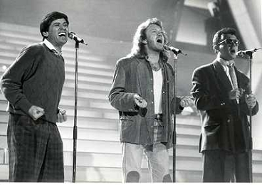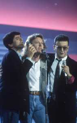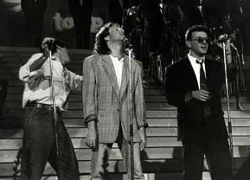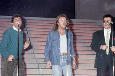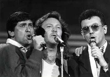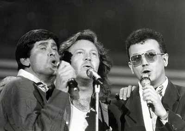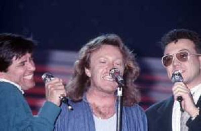 Teatro Ariston di Sanremo 37mo Festival della Canzone Italiana - 1987 nella foto Enrico Ruggeri, Umberto Tozzi e Gianni Morandi vincitori con la canzone ' Si pu dare di piu' ' ©Agenzia Aldo Liverani Sas