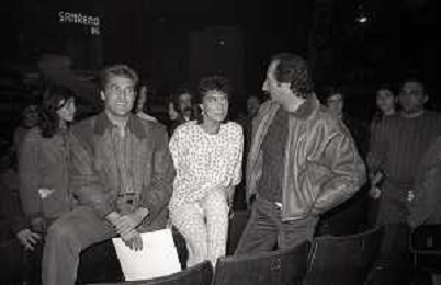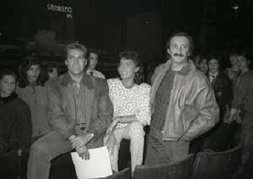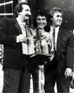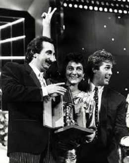 RICCHI E POVERI gruppo musicale italiano, nato artisticamente nel 1968, a Genova - Retrospettiva (composto da Angela Brambati, Angelo Sotgiu e Franco Gatti) nella foto con Pippo Baudo Teatro Ariston di Sanremo 35mo Festival della Canzone Italiana - 1985 vincitori con la canzone ' Se m'innamoro ' © Archivio / AGENZIA ALDO LIVERANI SAS