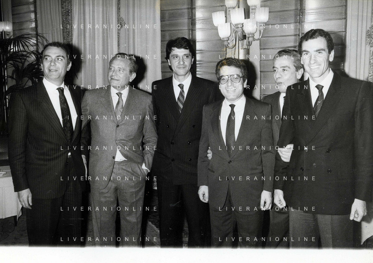RETROSPETTIVA ANTONIO MATARRESE DIRIGENTE CALCIO NELLA FOTO ERNESTO PELLEGRINI-GIAMPIERO BONIPERTI-PIERI-ANTONIO MATARRESE-PRE LAMBERTO MAZZA E ARB CARLO LONGHI AG ALDO LIVERANI SAS