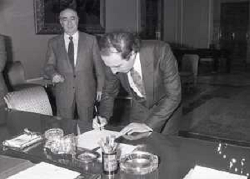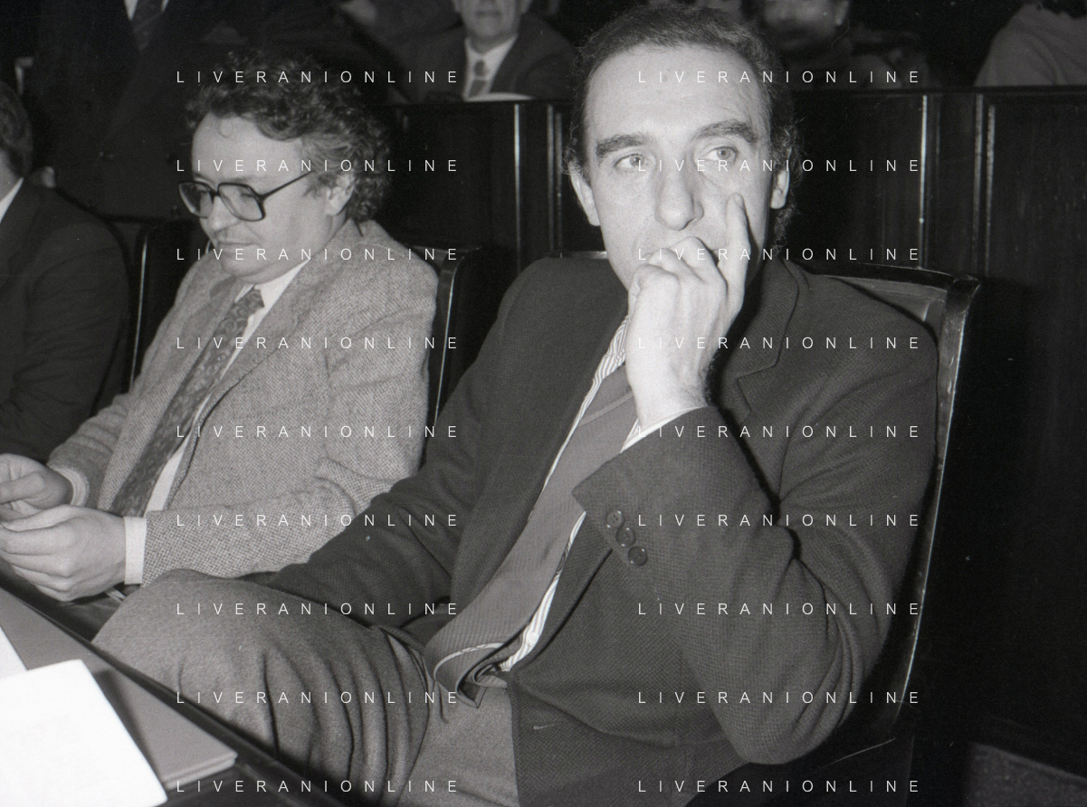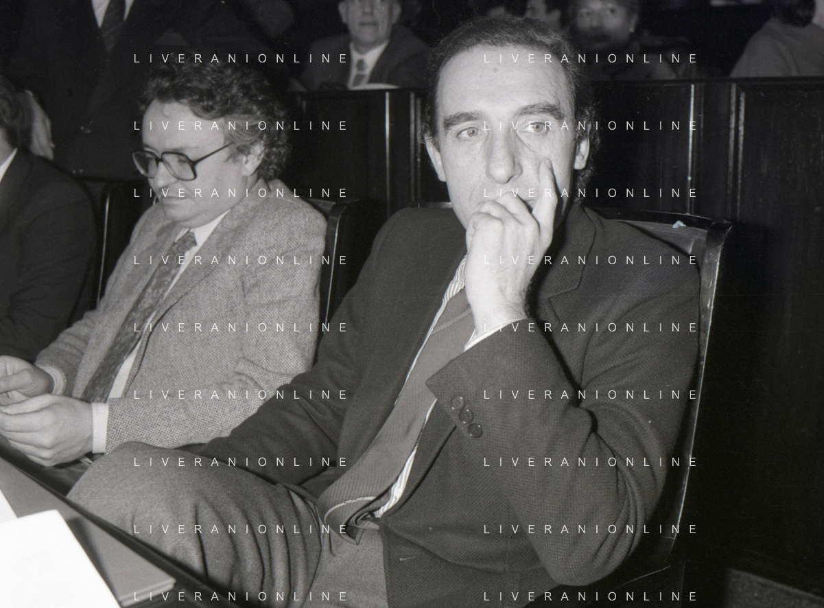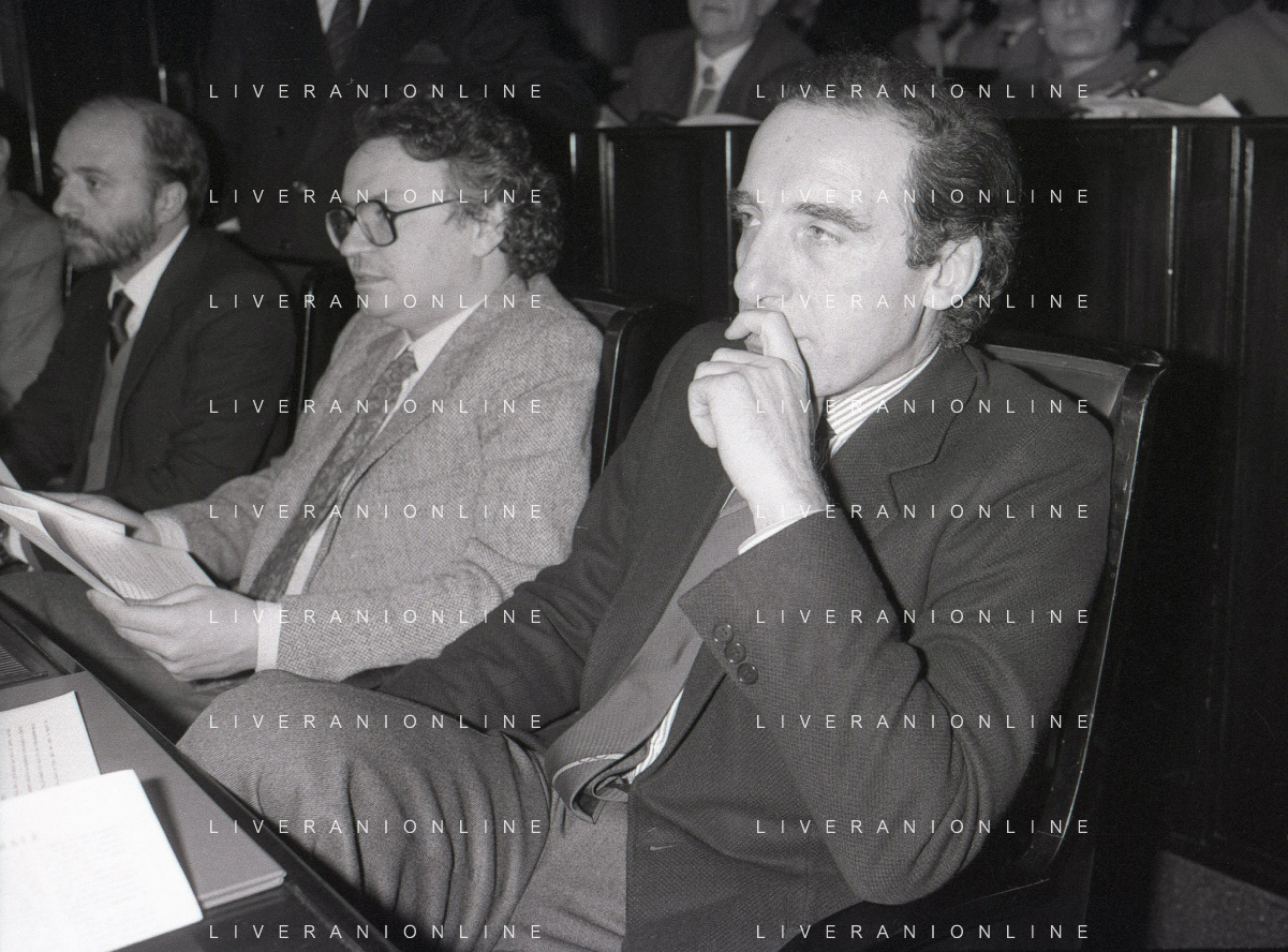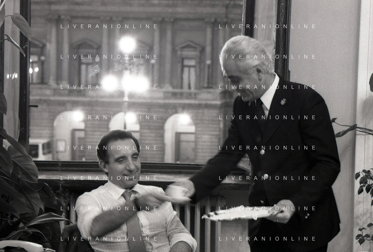 NEG- RETROSPETTIVA PAOLO PILLITTERI SINDACO DI MILANO E POLITICO PARTITO SOCIALISTA ITALIANO NELLA FOTO PAOLO PILLITTERI SINDACO DI MILANO NELL'ANNO 1987 CON ATTILIO SCHEMMARI ASSESSORE AG ALDO LIVERANI SAS